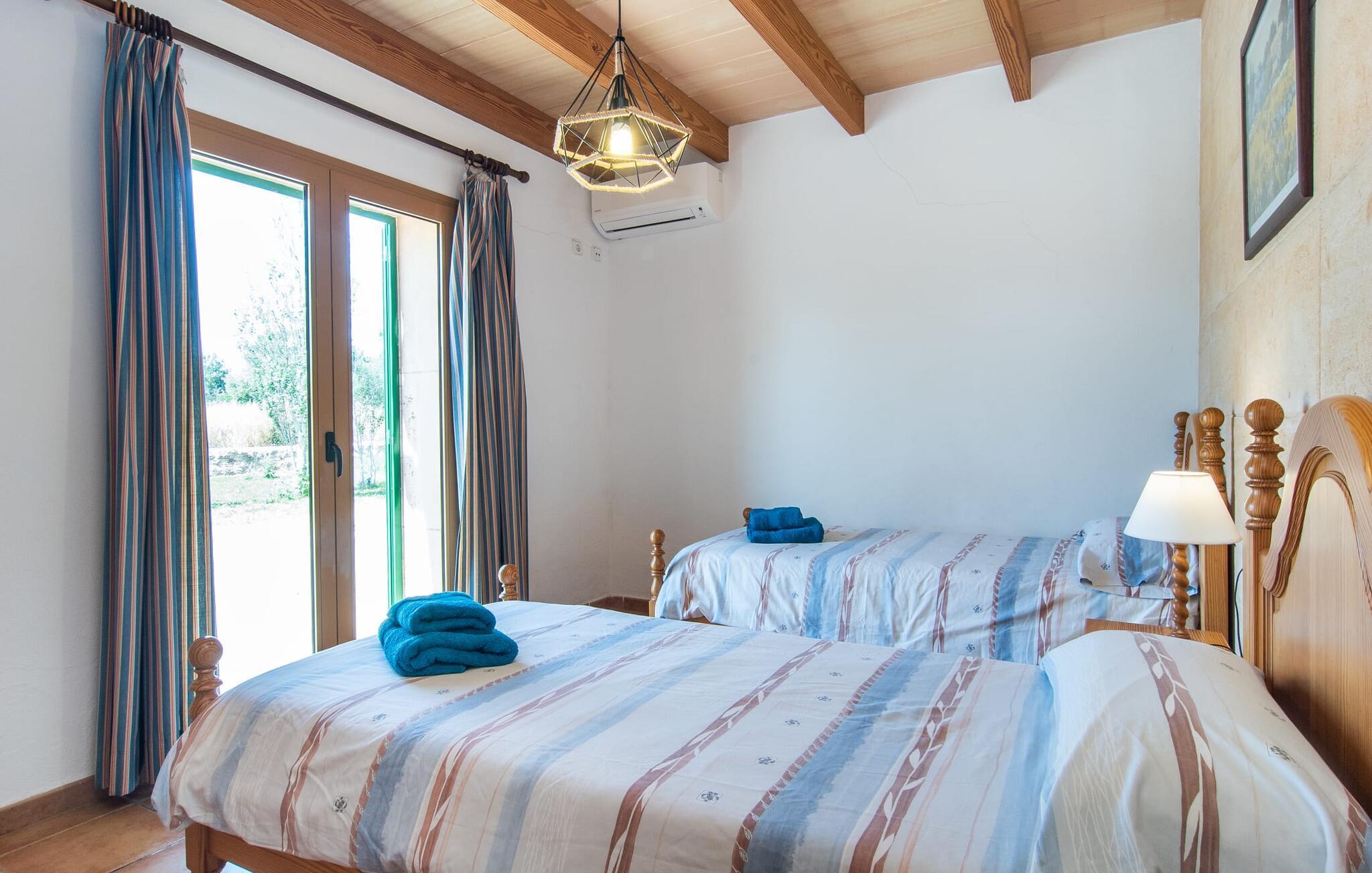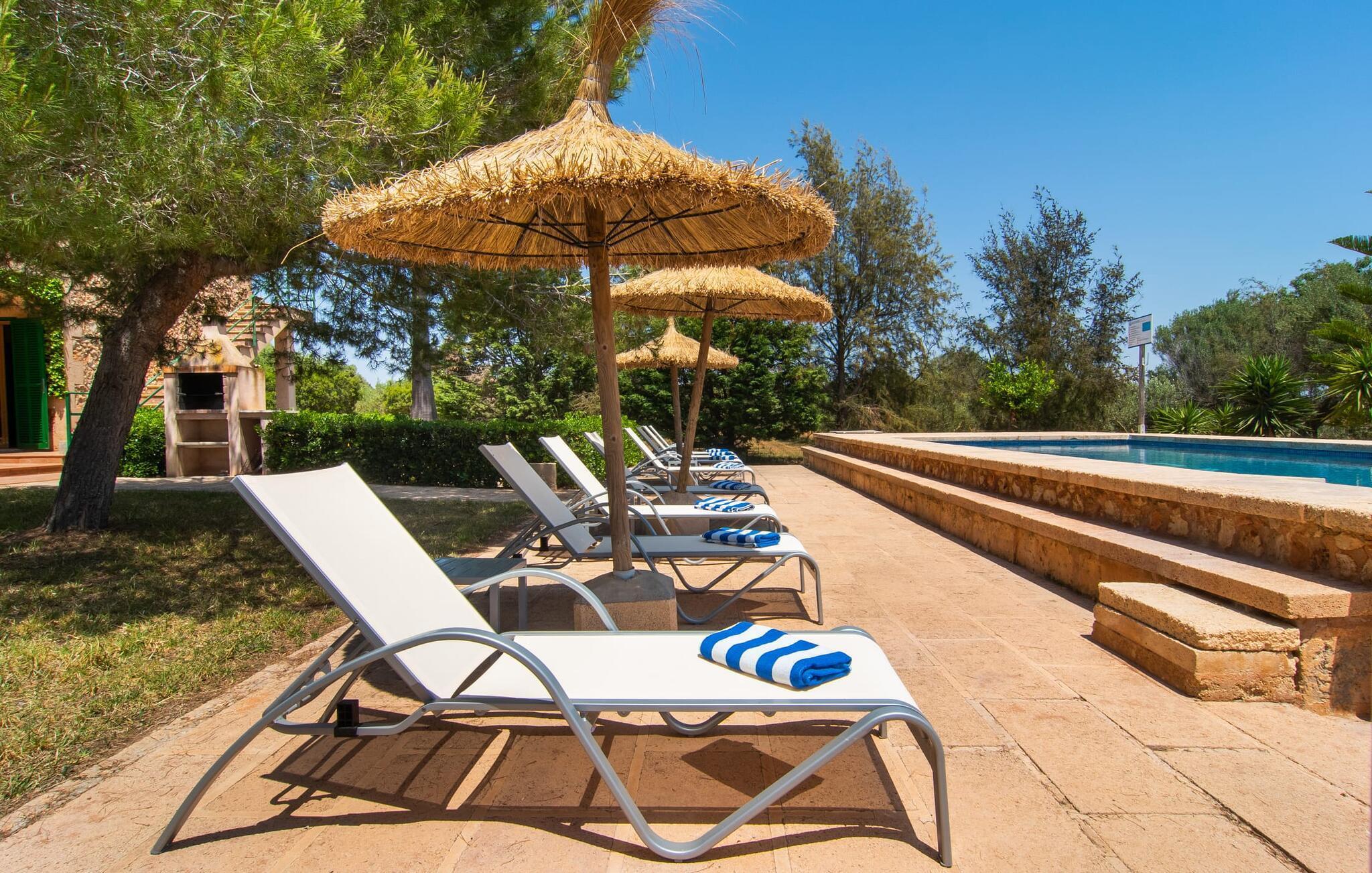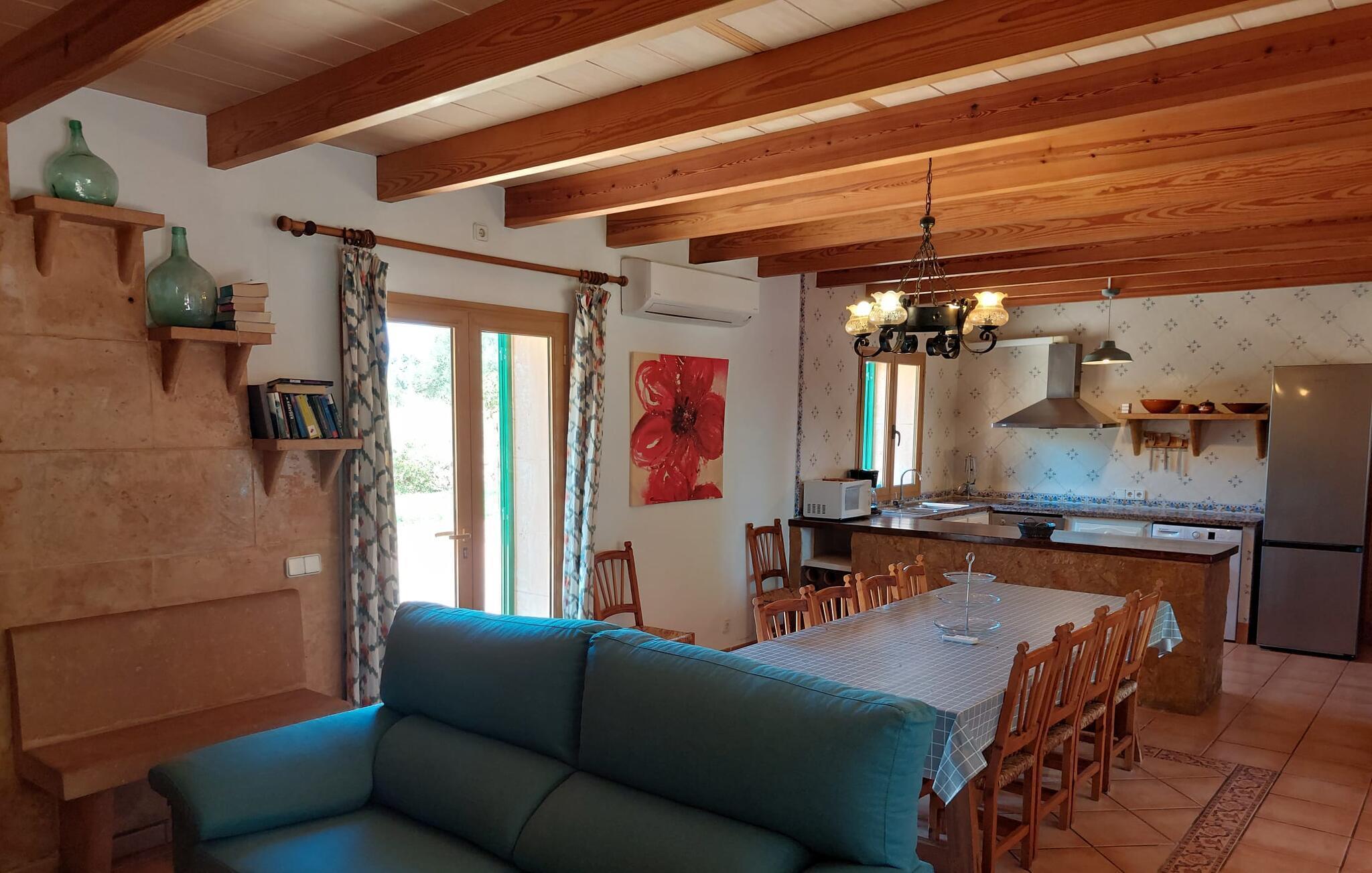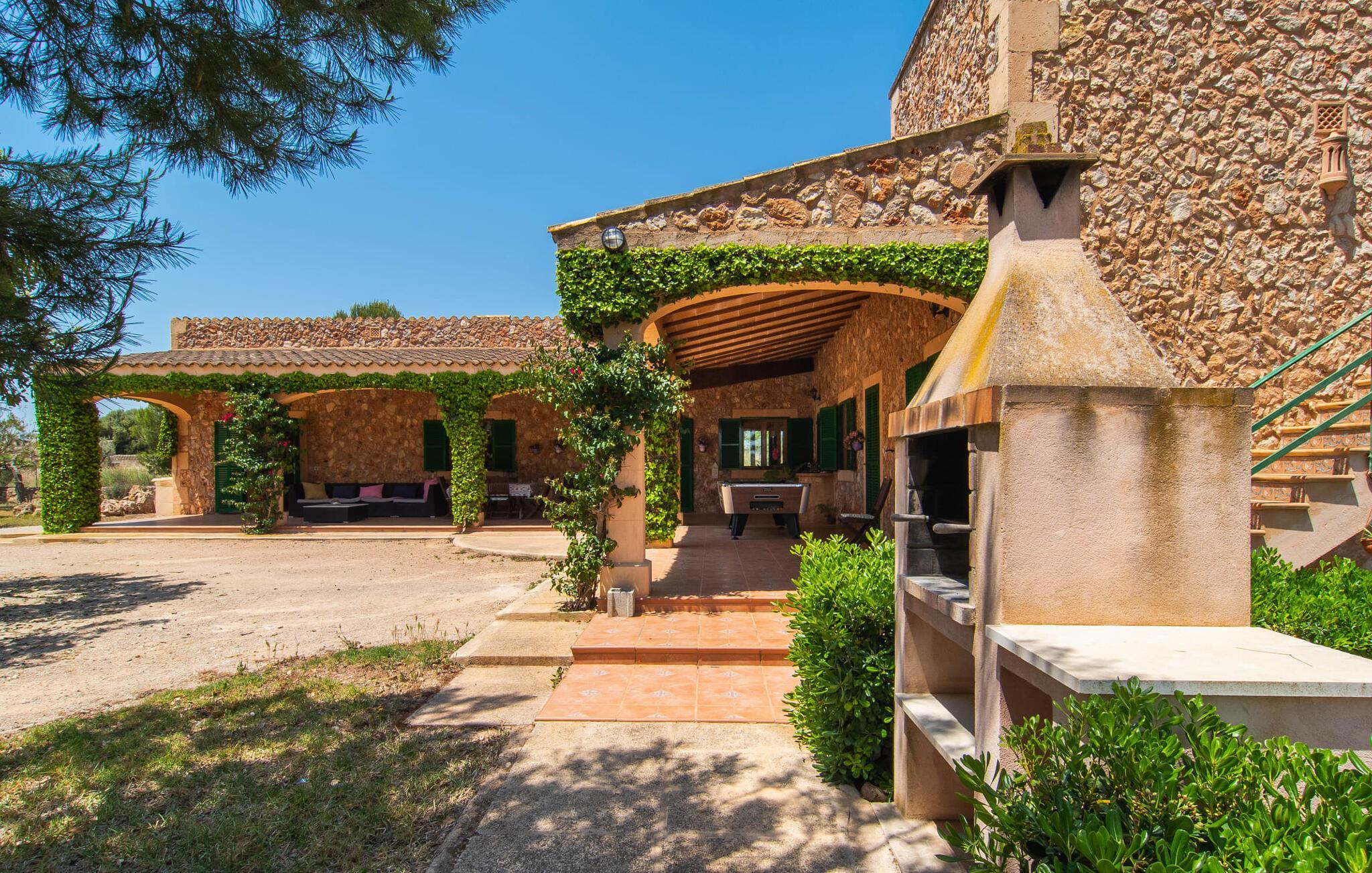Den familievenlige villa "Els Girasols" er et roligt beliggende landsted, der imponerer med en meget vellykket blanding af mallorcansk arkitektur og moderne indretning. Det er beklædt med natursten typisk for øen og byder på rummelighed og variation både inde og ude. Det 10.000 m² store udendørsareal har forskellige græsplæner, kærligt anlagte middelhavsplanter, små stier og søde hække. Dette skaber et behageligt afslappet helhedsbillede, hvori poolen, smagfuldt flisebelagt med blå mosaikfliser og med nem adgang til trappen foran, passer ind. Det er omgivet på to sider af en solterrasse, hvor du kan sole dig i solen eller under en af de tilgængelige parasoller. I alt otte komfortable liggestole er tilgængelige. Huset har en rummelig overdækket terrasse, som fremstår vidunderlig hjemlig takket være sine søjler, hvoraf nogle er beklædt med vinstokke. En afslappet loungesofa og et stort spisebord indbyder til at blive hængende og slappe af med udsigt til haven - på dejlige dage kan du blot bruge tiden udenfor og nyde det. Et højdepunkt i det overdækkede terrasseområde er formentlig bordfodboldsættet, hvor du kan spille som du vil. Dette er et Fincallorca feriehus. Når man træder ind i villaens indre fra terrassen, bliver man mødt af en stor, meget rustik stue, som ikke kun tilbyder gæsten komplet udstyr inklusiv elkedel, filterkaffemaskine og espressomaskine, men også en meget komfortabel opholdsstue/ spiseplads. Pejsen er bekvemt installeret her, og fjernsynet finder også sin plads i dette rustikke hjørne af huset. Det lange træbord kan komfortabelt rumme mindst otte personer. En lille stenbænk ved pejsen tilbyder opbevarings- eller siddemuligheder, det samme gør den komfortable sofa. En attraktiv skænk giver ikke kun opbevaringsplads, men er også et smukt blikfang. De fire rummelige soveværelser er komfortable og hyggelige med masser af træelementer og subtile farver. De indeholder hver to 0,9 x 2 m senge, så du har plads nok til en afslappende feriesøvn selv om natten. Det lyse væg- og loftdesign samt de matchende gulvfliser sikrer et rent, behageligt klima i disse rum. Der er fire smagfulde dagslysbadeværelser til rådighed, hvoraf to er bekvemt en-suite. Du kan nemt lade din hårtørrer blive hjemme. Hvis du vil besøge smukke strande, er Villa "Els Girasols" et godt valg for dig. De smukkeste strande på den sydøstlige kyst - såsom den familievenlige Es Trenc strand med dens lavvandede indgang - ligger mindre end 10 km væk og kan hurtigt nås med en lejebil. Efter en smuk dag med udflugter vender du tilbage til din smukke ferievilla "Els Girasols", hvor du kan afslutte aftenen. Villaen "Els Girasols" er et smukt naturstenshus på den sydlige del af øen med et smukt designet, rummeligt udendørsområde. Den fantastiske sandstrand Es Trenc ligger kun 8 km væk. Herfra kan du også nemt nå den gamle bydel i øens hovedstad Palma, som er værd at se.