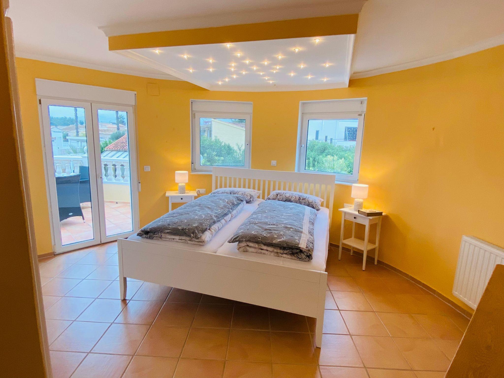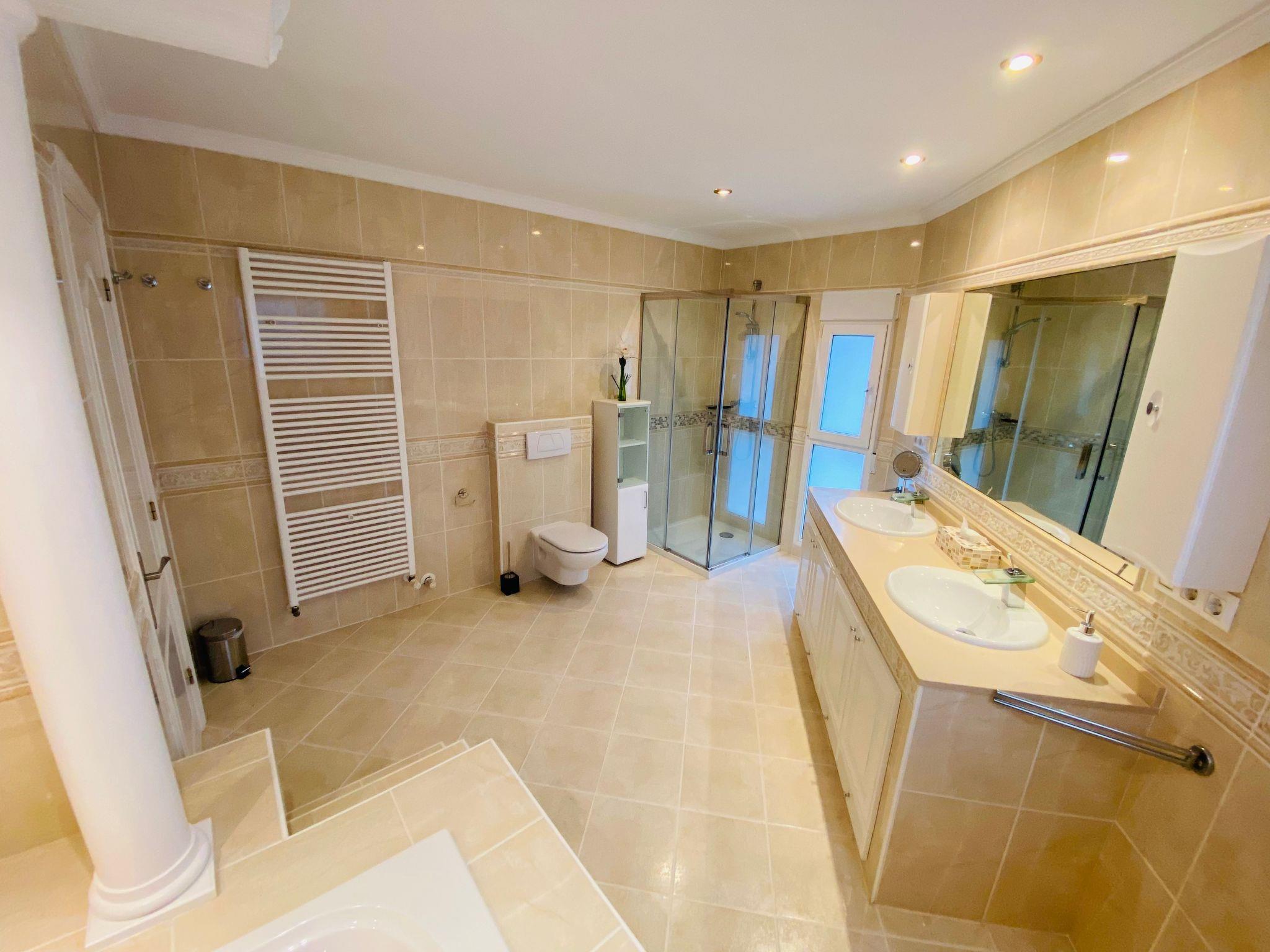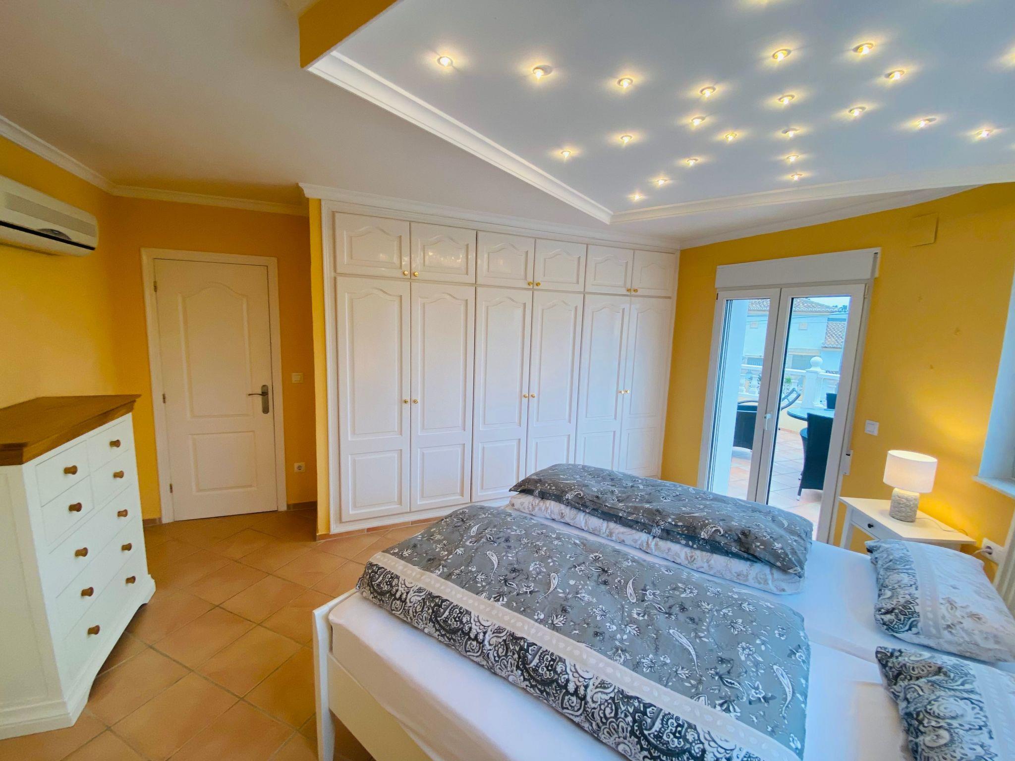 The two other bedrooms are tastefully furnished and have double beds measuring 1.60 x 2 metres. All bedrooms on the 1st floor have patio doors that lead directly onto a surrounding outdoor terrace measuring approx. 40 square metres. Opposite the bedrooms you will find an outstanding luxury bathroom. It is equipped with a comfortable double washbasin, large mirror unit, floor-level shower with real glass screen, towel heating and two window units. The highlight of this large room is a "royal" bathtub unit with large storage areas on both sides, framed by massive pillars. All south-facing bedrooms are flooded with light through the patio doors and therefore have direct access to the outside terrace. An external staircase leads from this area directly to the large roof terrace. There you have a spectacular panoramic view to all sides as well as to the sea. Especially in spring, autumn and winter, you will find warming rays of sunshine there!