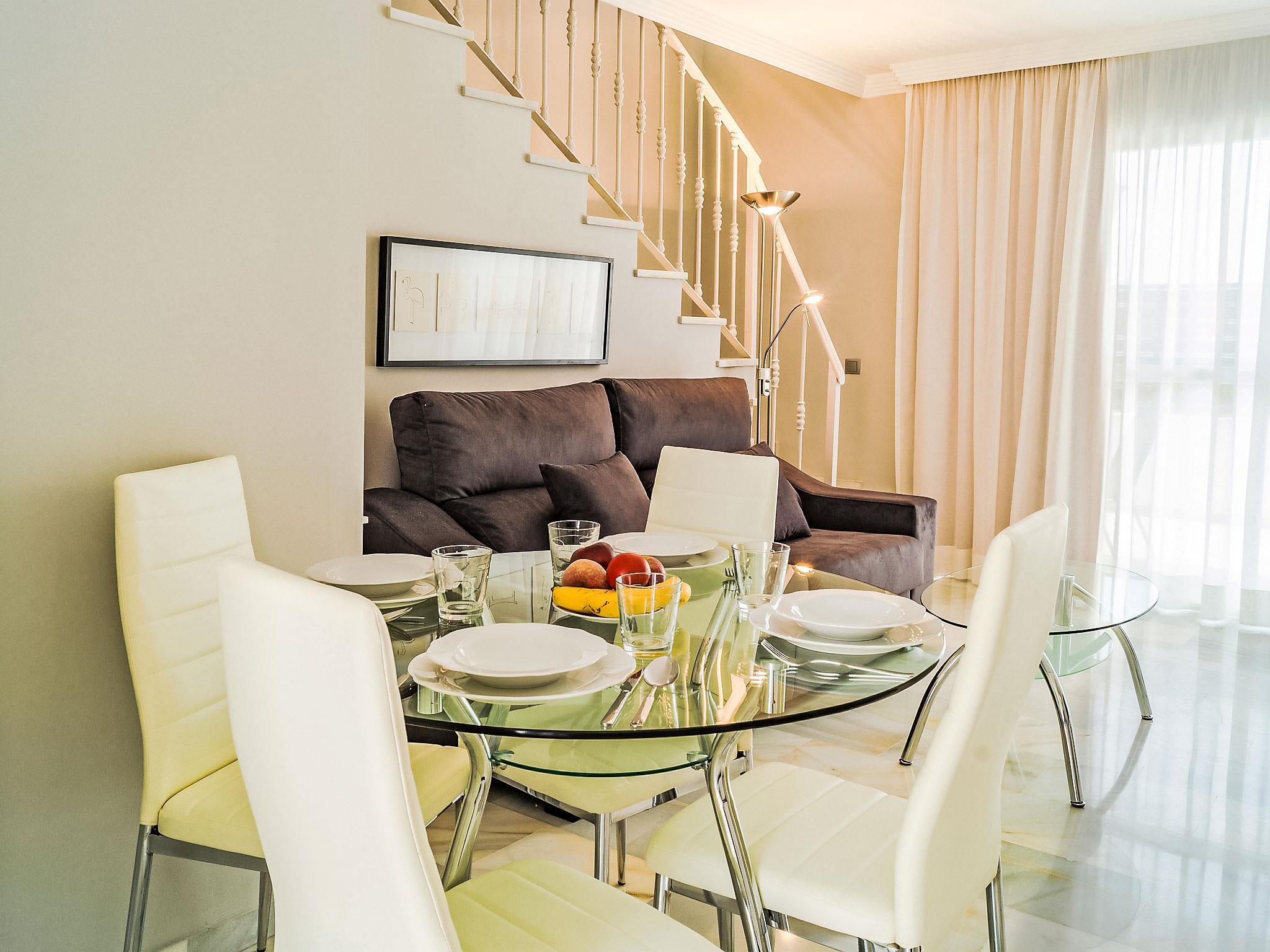 Modern, beautiful terraced house "La Reserva de Marbella". 14 km from the centre of Puerto banus, 9 km from the centre of Marbella, in the district Las Chapas, in a sunny position, 2 km from the sea, 2 km from the beach, south facing position. For shared use: garden, swimming pool, indoor pool heated (seasonal availability: 01.Jan. - 31.Dec.). Children's pool, outdoor shower, hot tub. In the complex: WiFi, sauna, fitness room, central heating system, air conditioning, washing machine. Public parking on the road. Supermarket 400 m, shopping centre 3 km, restaurant 200 m, bakery 100 m, café 200 m, bus stop 300 m. Please note: airfield 40 km from the property.