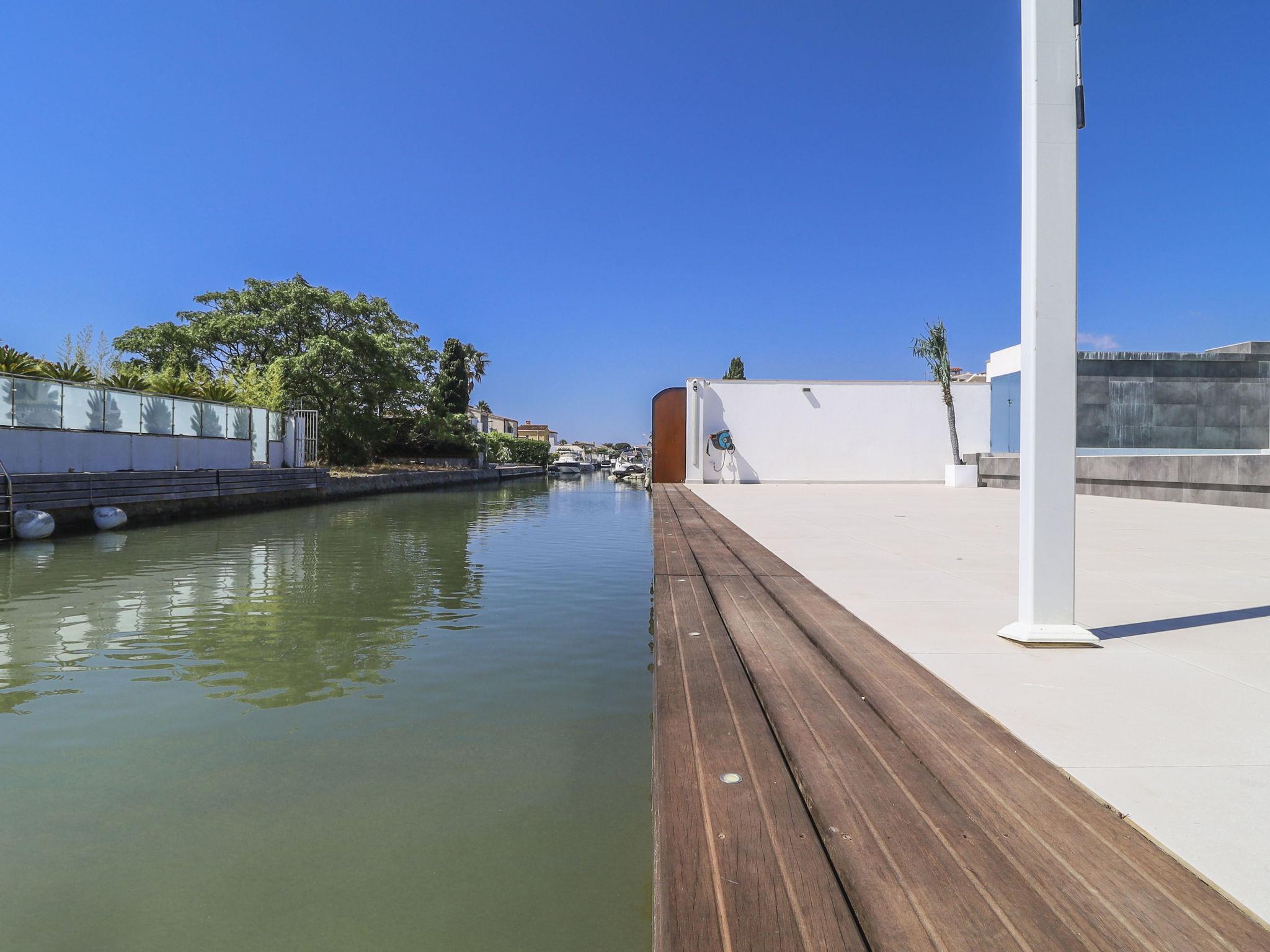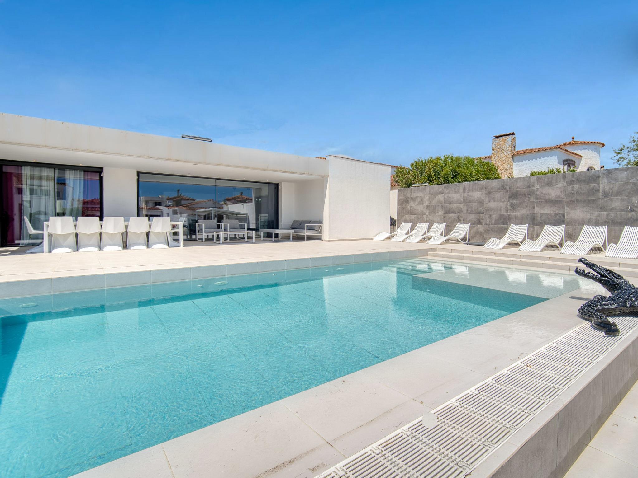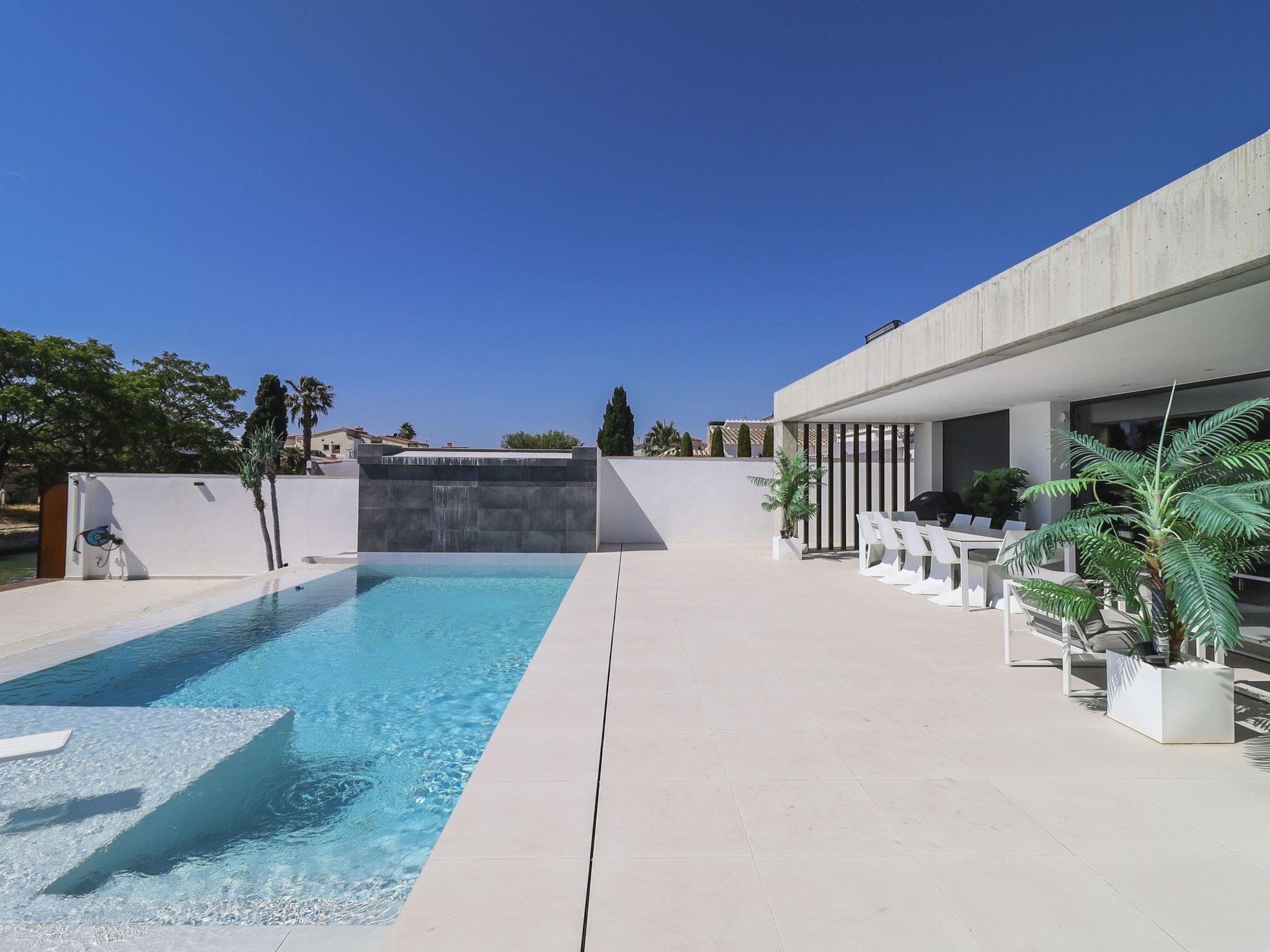 Casa al canal: Modern, comfortable, luxurious single-family house "Lighthouse". In the district of Medes 1 km from the centre of Empuriabrava, in a quiet, sunny position residential area (villas), traffic calmed area, 900 m from the sea, directly by the canal, in a cul-de-sac. Private: property (fenced), swimming pool (8 x 5 m, 40 m2, depth 50 - 160 cm, seasonal availability: 01.Apr. - 30.Oct.) with salt-electrolysis pool-cleaning system. Unconventional pool shape. Terrace, garden furniture. In the house: central heating system, air conditioning. Parking (for 2 cars) on the premises, single garage. Supermarket 1 km, restaurant 600 m, pedestrian zone 500 m, bicycle rental 1.5 km, pub garden 1 km, bus stop "Empuriabrava Cruïlla" 2.8 km, railway station "Figueres Renfe Adif" 15 km, sandy beach "La Rubina / Empuriabrava" 900 m. Sports harbour 2 km, golf course (18 hole) 15 km, surf school 1.5 km, sailing school 1.5 km, tennis 1.5 km, minigolf 900 m, riding stable 800 m, sports centre 1 km, walking paths from the house 300 m, cycle lane 100 m. Nearby attractions: Parque Acuático Roses 5 km, Museo Dalí Figueres 12 km, Ruinas de Empuries 20 km, Castillo y Festival de Perelada 12 km, Centro de Paracaidismo y Túnel de viento 1 km, Cadaqués y Cap de Creus 23 km. Please note: groups of teenagers on request only. Private mooring, on request. The keys‘ handover takes place by the agency Interhome in Empuriabrava.