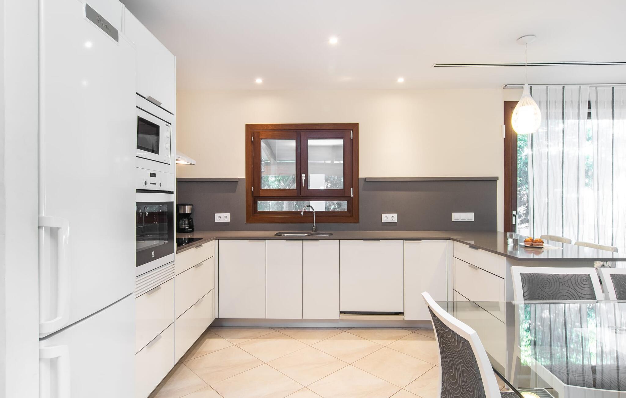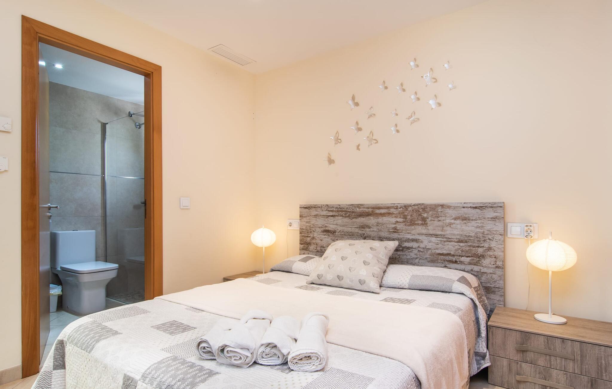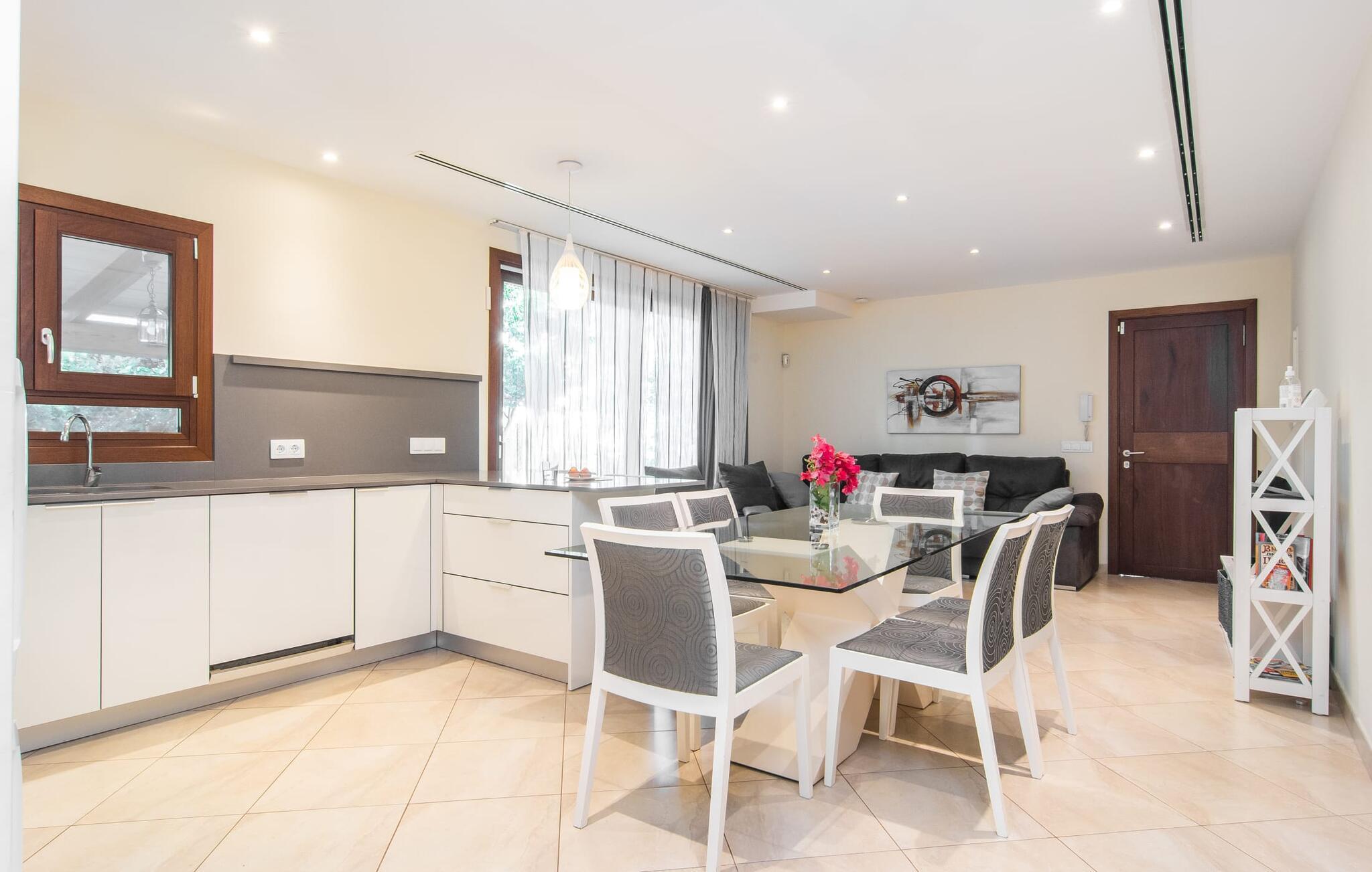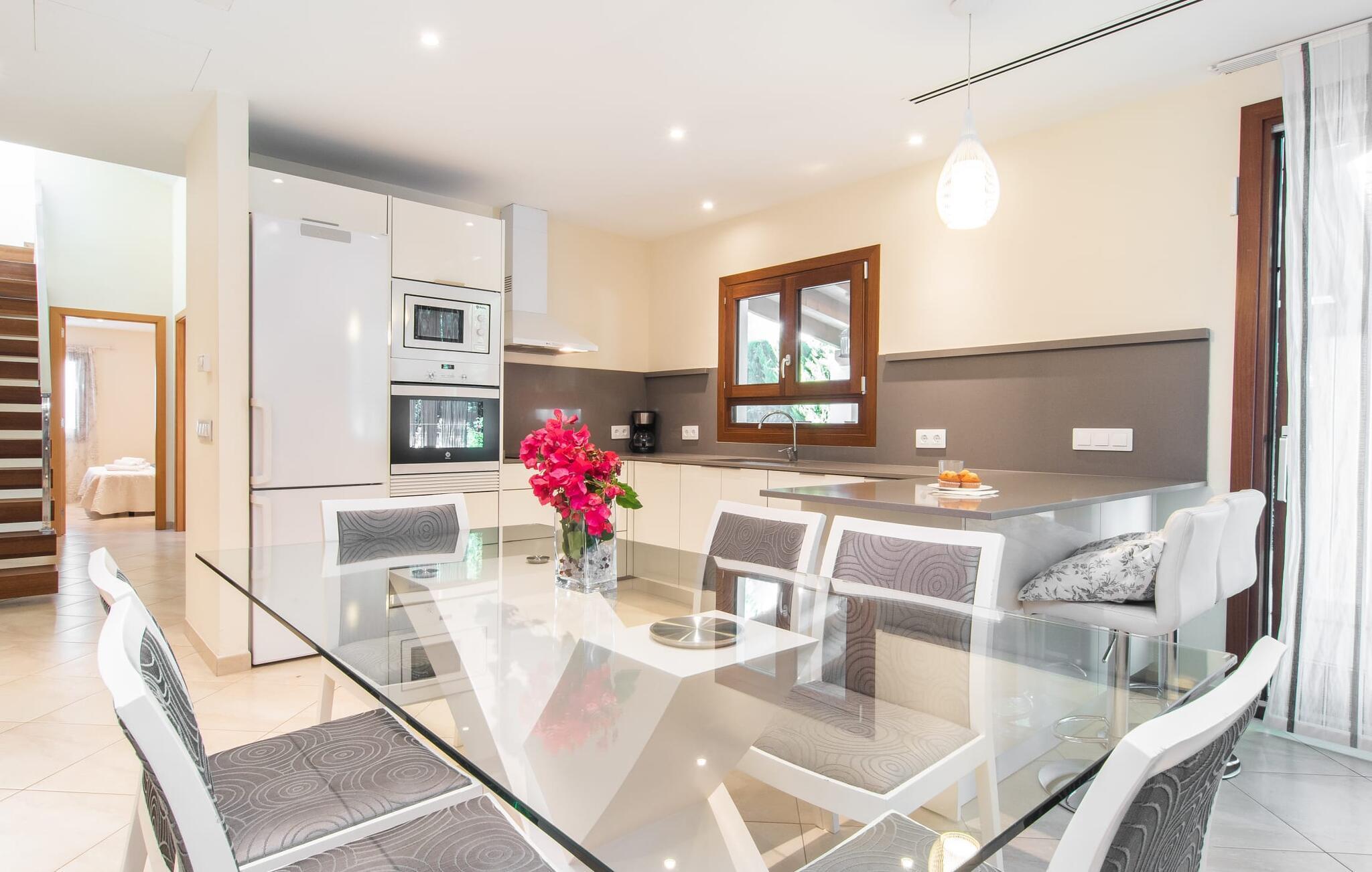 Strandvillaen "Es Baladre Beach" er en sand perle for feriegæster. Kun 100 meter fra stranden er det ideelt placeret, hvilket betyder, at der er lidt behov for en lejebil og ingen behov for en pool. Middelhavet med sin forfriskende brise og duften af fyrretræer er praktisk talt lige uden for døren. Dette er et feriehus i Fincallorca. Villaens udendørsområde er omgivet af middelhavsplanter, hvilket giver privatliv og en rolig atmosfære. To overdækkede terrasser giver mange muligheder for at slappe af. Den ene har en spiseplads med komfortable kvalitetsmøbler nær kulgrillen, velegnet til både morgenmad og aftensmad. Den anden terrasse er et afslappende loungehjørne, ideelt til at slappe af om aftenen. Liggestole er tilgængelige til solbadning eller en afslappende siesta. Villaens indre er lige så afslappet som dens beliggenhed, med lyse gulvfliser og blød stemningsbelysning. Den åbne stue, spisestue og køkken er rummelig og alsidig. Køkkenet er fuldt udstyret og morgenmadsbaren i amerikansk stil med barstole sikrer en omgængelig selvforplejningsoplevelse. I stueetagen er der to soveværelser med dobbeltsenge, et med en-suite badeværelse, mens et tredje soveværelse er ovenpå, også med en-suite badeværelse. Villaens gulvvarme sikrer komfort hele året rundt, hvilket gør "Es Baladre Beach" til et perfekt rejsemål selv i de milde vintermåneder. Strandvillaen med middelhavshave ligger i den velkendte havneby Alcúdia. Shopping i byen, besøg på restauranter, barer eller caféer kan kombineres med hyggelige gåture uden at skulle leje en bil. Den lange sandstrand i Platja d'Alcúdia ligger ca. 100 m væk.