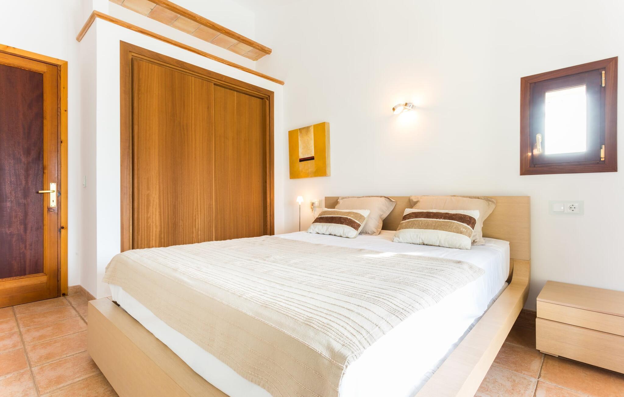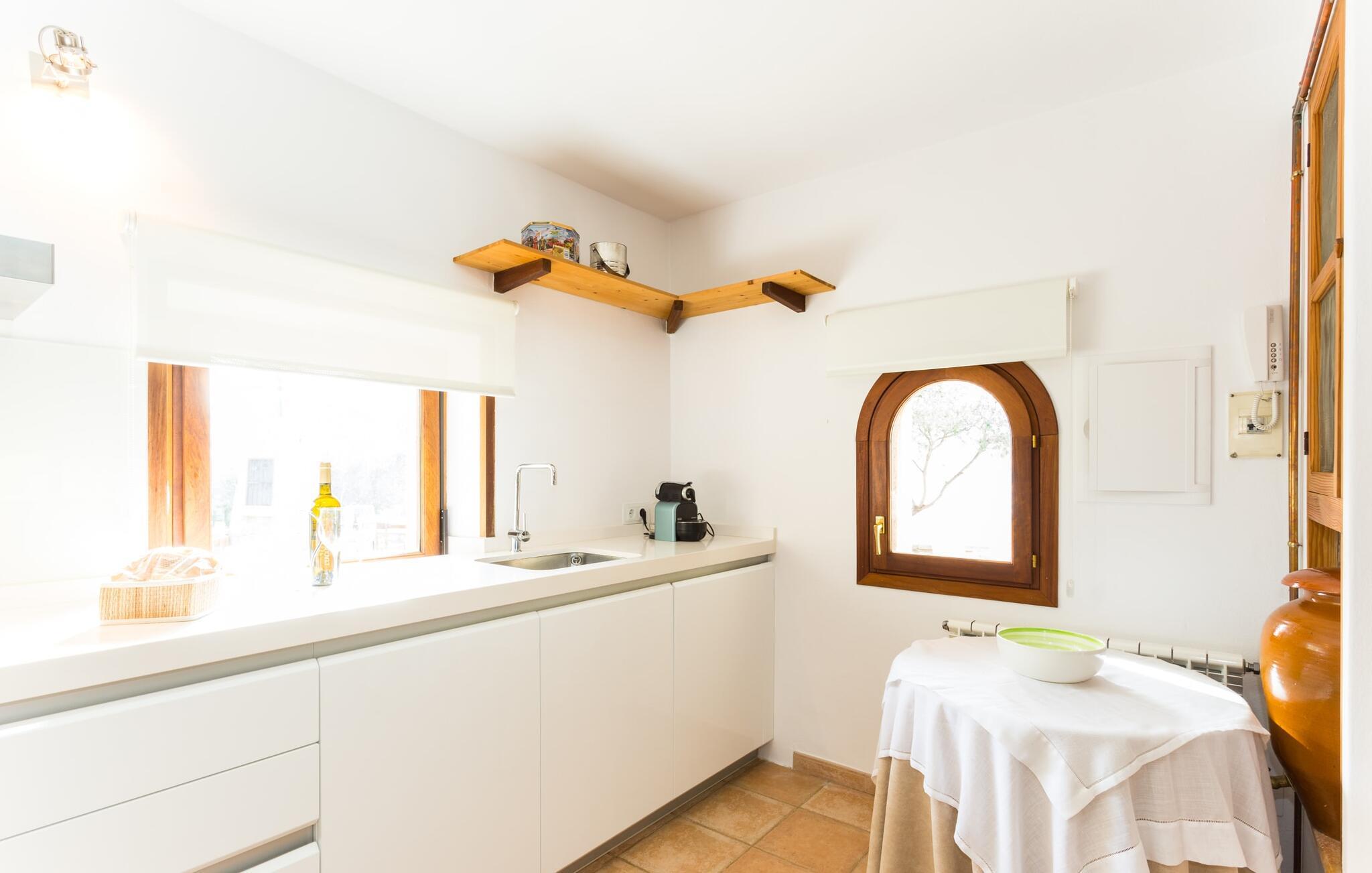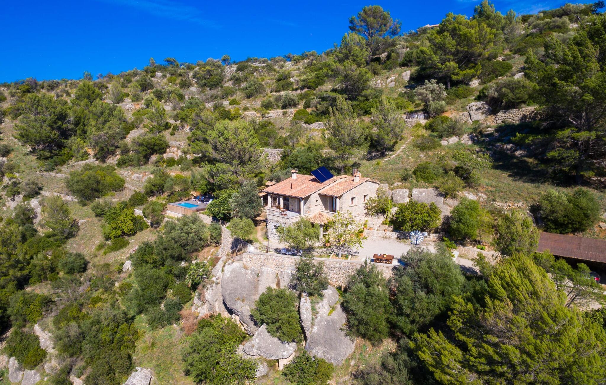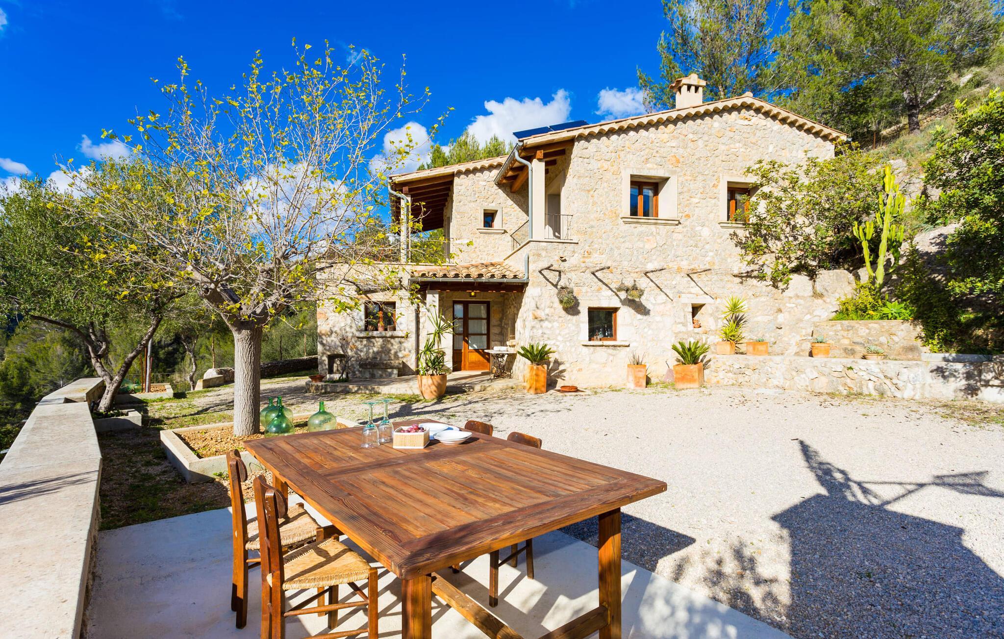 Den landlige villa "Es Guerol" med et lille stop for forfriskning er en speciel ejendom for familier, naturelskere og vandrere, der søger fred og ro. Du kan næsten ikke bo et mere originalt sted end dette naturreservat på Mallorca. Den gamle villa blev nænsomt restaureret af sine ejere, som boede der i lang tid, uden at fjerne dens stemning, men med nye egenskaber såsom en lille pool midt på en træterrasse. Huset ligger på et bjerg, så du må forvente en stejl stigning og er bygget ind i bjerget, så du har en fantastisk panoramaudsigt over Tramuntana-bjergene fra terrassen og altanen. Hvis du ikke kan lade batterierne op her... Læn dig komfortabelt tilbage mod en varm murstensvæg, lad dine øjne og tanker vandre i det fjerne fra dine liggestole ved poolen, varm den rummelige grillplads op og sæt bordet ved siden af det gamle vindmølle – ren nydelse af naturen. Dette er et Fincallorca feriehus. Original på ydersiden, behagelig på indersiden! Dette er blevet renoveret og moderniseret med en masse kærlighed og god smag. Den dekorative natursten er altid en påmindelse om, at dette er en gammel villa med robuste vægge. Lige bag stuen, der er indrettet helt i jordfarver, fører en gang ind i det åbne, skinnende hvide køkken, som er udstyret med de nyeste hårde hvidevarer og masser af arbejdsplads. Du kan hele tiden kigge ud af vinduet, mens du forbereder og laver mad. Den nærende pejs eller den knitrende ild vil give en hyggelig stemning – der kan trods alt blæse en kølig vind på et bjerg, så du trænger til lidt varme i huset. De tre soveværelser på øverste etage, hvoraf to har altanudgang og dermed panoramaudsigt, minder om en eremitage med hyggefaktor. Der er også to badeværelser, hvoraf det ene er i stueetagen. Betagende panorama, absolut fred, afsondret beliggenhed og sund bjergluft i et naturreservat: Du kan nå den originale gourmetvilla "Es Guerol" fra læder- og vinbyen Inca via Ma-13 mod Selva og Mancor de la Vall (begge er ca. 10 minutter i bil fra villaen). Det sidste stykke kan være lidt stejlt til shopping på det ugentlige marked eller supermarked. Du er dog helt afsondret i paradis. Havet er omkring 30 km væk i bil, så en dag på stranden kan helt sikkert indgå i din planlægning.