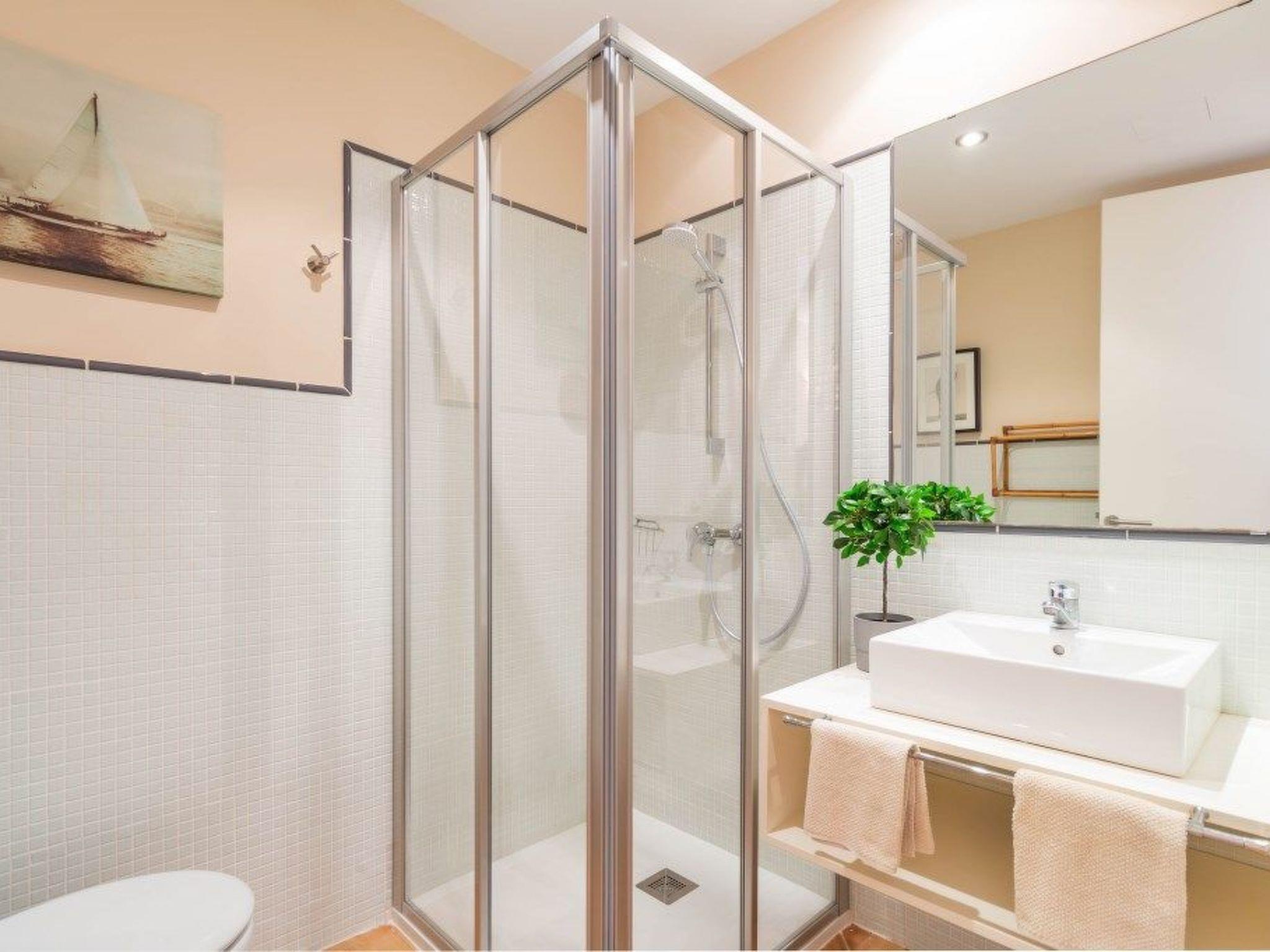 This newly built villa is equipped with three bedrooms and three bathrooms. The sanitary facilities include floor-level showers and modern washbasins. The entire living space is spread over two levels. The living and dining room, kitchen, two bedrooms and two bathrooms (one ensuite) are located on the ground floor. The first bedroom has two single beds measuring 90 x 200 cm, the second has a double bed measuring 200 x 200 cm. On the first floor there is a further bedroom (bed: 180 x 200 cm) with bathroom and a large terrace with views over the bay of Pollensa. The villa is also equipped with double-glazed windows and air conditioning (hot/cold).