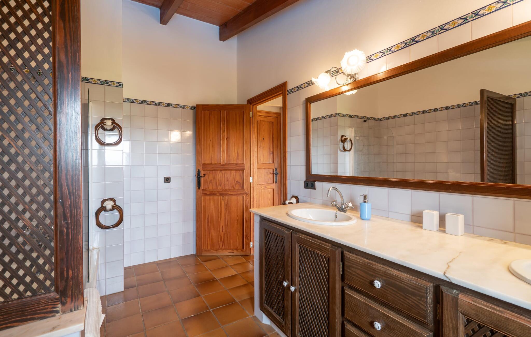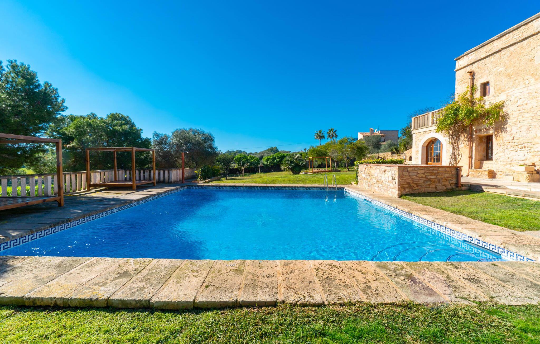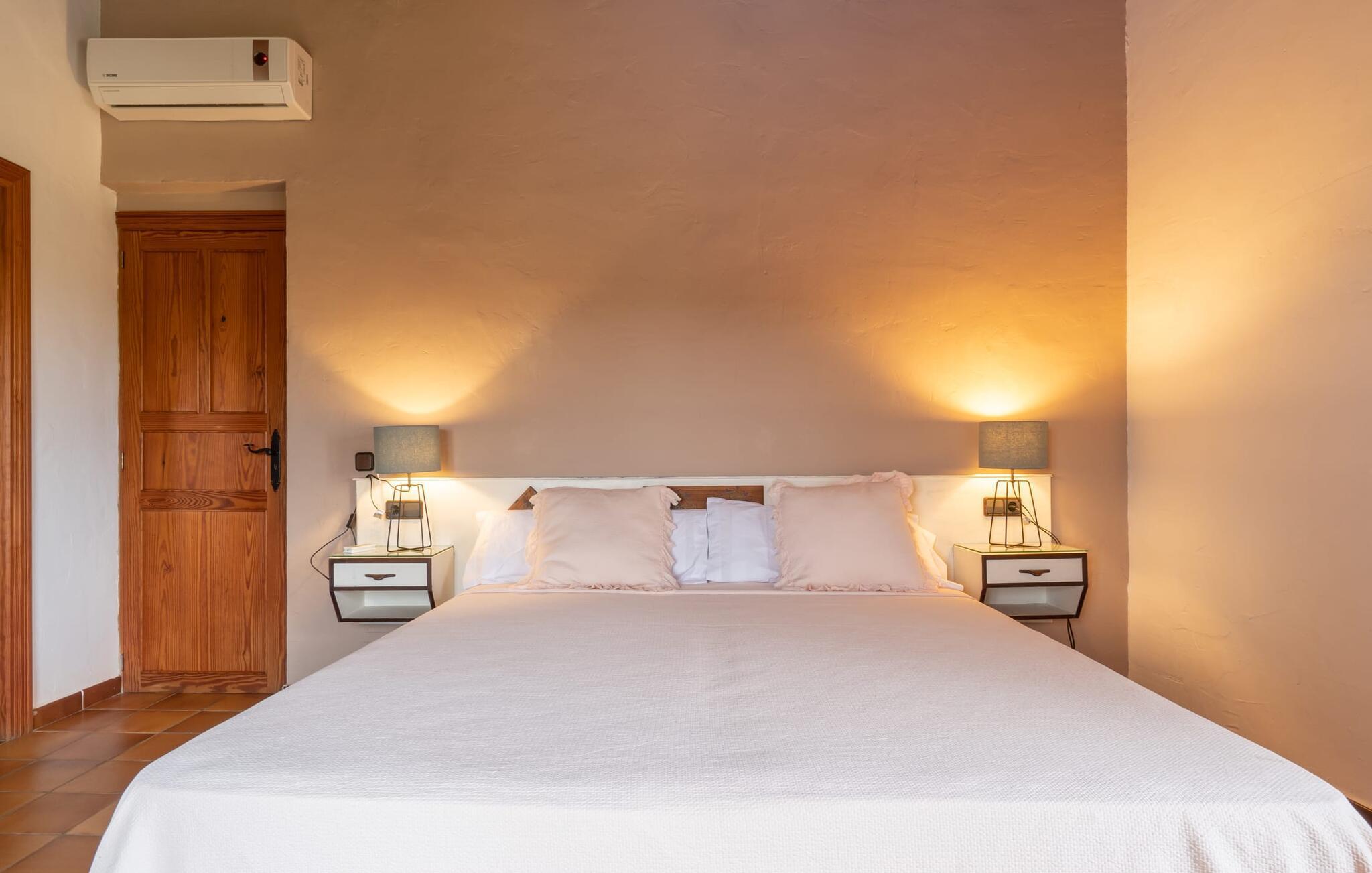 Sol, afslapning, masser af privatliv, en smuk udsigt, at bo tæt på Mallorcas smukkeste strande - alt dette er muligt i lejligheden "Es Turo Cabrera", der præsenterer sig selv som et meget alsidigt feriehus for to gæster. På det enorme, parkagtige og naturområde kan du nyde en lang række perspektiver på korte gåture og lade dit ferieblik vandre i fred og ro. Nogle steder kan vise sig at være yndlingssteder, såsom at sidde og ligge ved poolen, på græsplænen, direkte under åben himmel eller i den luftige naturlige skygge af et træ. Den indbydende udendørsservering direkte ved lejligheden og på tagterrassen byder på helt vidunderlige muligheder for at sidde udenfor og slappe af og nyde. Dette er et Fincallorca feriehus. Selve lejligheden har en hyggelig, rustik flair: hvide vægge, terracotta fliser, synlige bjælkelofter, træ og typiske mallorcanske møbler såsom gyngestole formidler straks den autentiske ø-følelse. En rummelig stue-spisestue med pejs og TV tilbyder alle mulige muligheder for elegante indendørs ophold. Køkkenet, smukt adskilt af en bred bue og en disk, er fuldt udstyret og ideelt til omfattende måltidstilberedning. Der er endda plads til endnu et bord. Der er også et lille badeværelse med bruser på denne stueplan. Du kan slappe af i to hyggelige soveværelser på øverste etage, som hver er udstyret med dobbeltsenge (bestående af to enkeltmadrasser). Denne hyggelige ferierede er derfor ideel til en lille familie eller to par, der rejser sammen. De to badeværelser - rummelige og med naturligt lys - har hver en suite og har badekar. En meget behagelig funktion er det varme/kolde klimaanlæg, som giver dig mulighed for at have behagelige indendørstemperaturer året rundt. Vores konklusion: "Es Turo Cabrera" har bestemt en portion original Mallorca ombord uden at ofre komforten. Denne lejlighed er en af fem boligenheder på ejendommen. De kaldes også "S'Hort des Turó Eivissa", "S'Hort des Turó Menorca", "S'Hort des Turó Mallorca" og "S'Hort des Turó Formentera" og kan alle bookes gennem Fincallorca. Lejligheden "Es Turo Cabrera" er beliggende på landet på ejendommen "S'Hort des Turó de ses Illes" og kun 3 km sydvest for Ses Salines. Ejendommen på 28.520 m² byder på masser af plads. De umiddelbare omgivelser inviterer til lange gåture gennem naturen. Takket være den strategisk gode beliggenhed er omkringliggende landsbyer og strande også nemme at nå. Colonia de Sant Jordi (ca. 2,7 km) har to smukke sandstrande, den nordlige, Es Trenc, er den største naturlige strand på Mallorca.