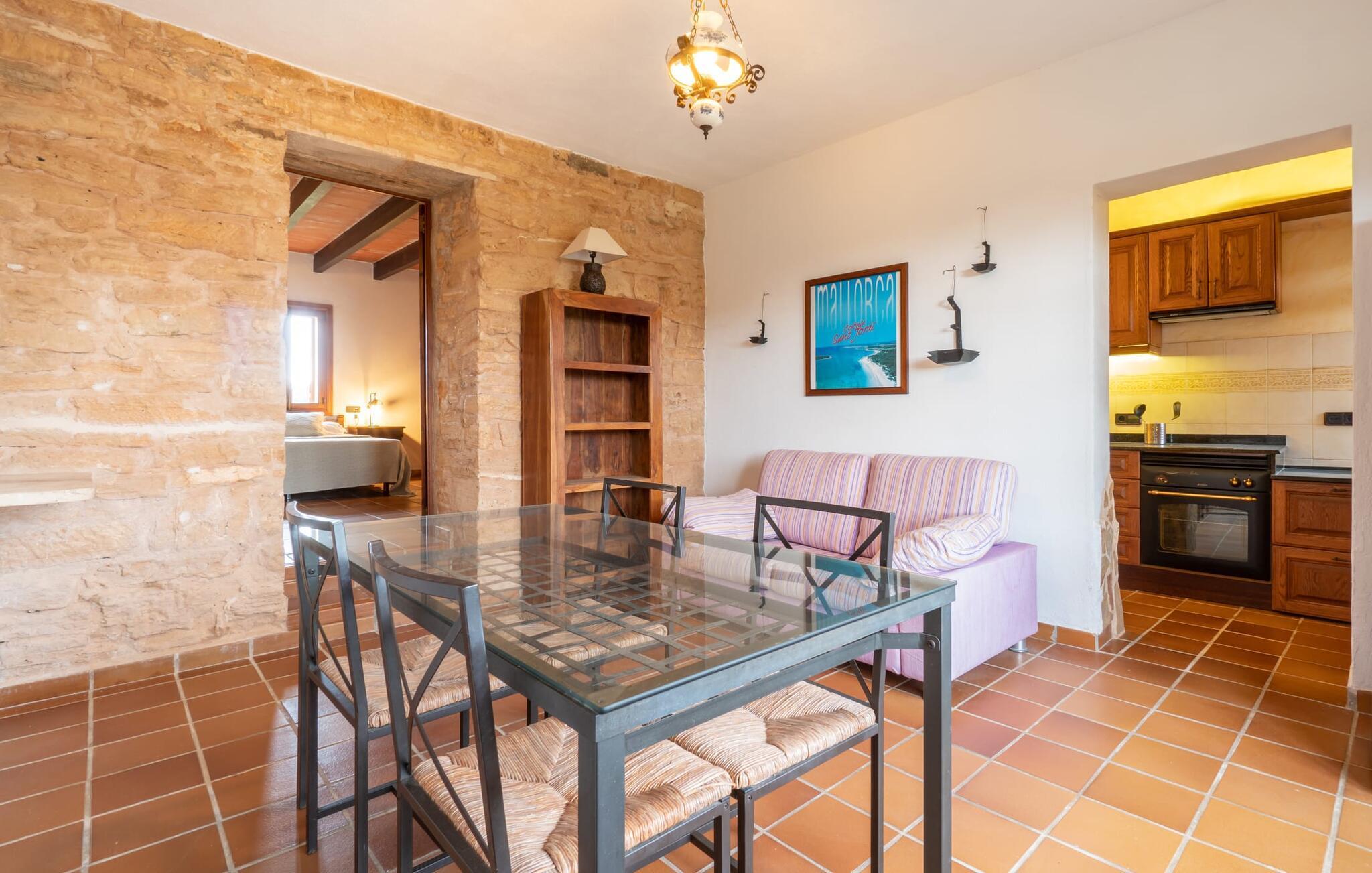 Lejligheden "Es Turo Mallorca" er beliggende i landlige omgivelser på den 28.520 m² store ejendom "S'Hort des Turó de ses Illes" og byder på sol, afslapning, privatliv og smuk udsigt. Dette er et feriehus i Fincallorca. Beliggende på en stor parklignende grund, kan du nyde fredelige gåture og opdage forskellige steder at slappe af. Uanset om det er ved poolen, på græsplænen, under åben himmel eller i den kølige skygge af et træ, vil du finde mange steder at slappe af her. Den indbydende terrasse lige ved siden af lejligheden byder på et skønt sted at sidde udenfor og nyde den rolige atmosfære. Indvendigt har lejligheden en rustik charme med hvide vægge, natursten, terracotta fliser, træ og synlige bjælker, der giver dig en ægte ø-følelse. Den åbne stue og spisestue med et halvåbent køkken tilbyder alt hvad du behøver for et behageligt ophold. Det rummelige soveværelse med en dobbeltseng (to enkeltmadrasser) lover afslappende nætter, badeværelset har naturligt lys og et badekar. Aircondition sikrer komfort hele året rundt. "Es Turo Mallorca" tilbyder en autentisk Mallorca-oplevelse uden at gå på kompromis med komforten. Denne lejlighed er en af fem boligenheder på ejendommen. De er "S'Hort des Turó Cabrera", "S'Hort des Turó Eivissa", "S'Hort des Turó Menorca" og "S'Hort des Turó Formentera" og kan alle bookes via vores hjemmeside. Ferielejligheden "Es Turo Mallorca" ligger kun 3 km sydvest for Ses Salines. Takket være den strategisk gode beliggenhed kan omkringliggende landsbyer og strande også nås hurtigt. Colonia de Sant Jordi (ca. 2,7 km) har to smukke sandstrande, den nordlige, Es Trenc, er den største naturlige strand på Mallorca.