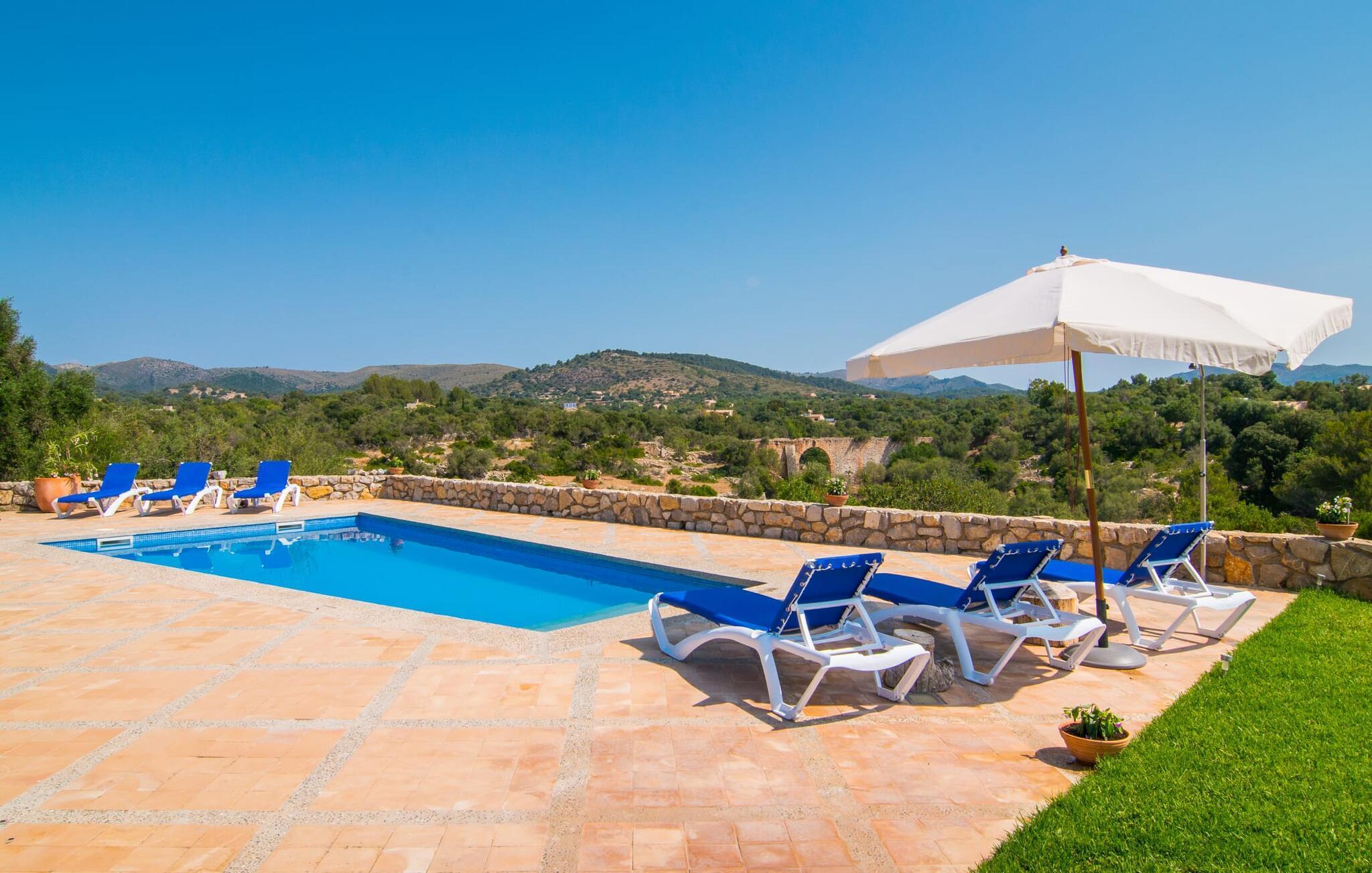 Søger du primært fred og ro på ferien, så er du kommet til det rette sted – og det vil du straks bemærke: glade får, der græsser fredeligt på begge sider af indkørslen til huset villa "Escanellas". Landstedet, bygget i mallorcansk stil med smukke grønne skodder, ligger på en kæmpe ejendom nær byen Artà. Den byder på mere end blot en velholdt græsplæne, som børnene kan lege på, men også en fortryllende kombination af fyrretræer, høje nåletræer og vidunderligt duftende buske, der er typiske for øens vegetation. Fra den delvist overdækkede terrasse, chik og komfortabel på samme tid og udstyret med flere sofagrupper, kan du nyde en fantastisk udsigt over det omkringliggende område af denne kystregion så langt øjet rækker. Slap af på rattansofaen inklusive sofapuder eller nyd middelhavsdelikatesser ved det store spisebord. Et andet overdækket terrasseområde lige ved siden af hovedbygningen giver også plads til måltider; Foruden bord og stole har den en praktisk vask og flere hylder og bordplader til tilberedning af små udendørs snacks, såsom en frisk frugtsalat. Trænger du til at køle af, så svøm et par længder i poolen, der glitrer turkis i sollyset, og varm derefter hurtigt op på en af liggestolene. Dette er et Fincallorca feriehus. Villaen udstråler også typisk mallorcinsk charme indeni: mørke træbjælker og stenbuer forbinder rummene, mens lofterne, som nogle steder er afsluttet med sofistikerede kurver lavet af Mares-sten, og de smukke gulvfliser skaber en rustik, men hjemlig atmosfære, meget ren, stemning. Det stilfulde hus kan træde ind fra to sider: enten ind i en imponerende, over 8 m høj foyer eller direkte ind i den rummelige stue/spisestue. Det rummer et langt træbord til uforglemmelige aftener med lækker mad og livlige debatter, samt komfortable sofaer til afslapning foran en spændende film. Lige ved siden af finder du et åbent, moderne og fuldt udstyret køkken, som stadig har en landlig karakter takket være kærligt integrerede elementer: for eksempel den smukke murstensvask eller den vidunderligt varme Aga. Er du træt af dagens spænding, kan du trække dig tilbage til et af de fire dobbeltværelser. En af dem er i stueetagen, mens de andre er på øverste etage og kan nås via en stor trætrappe. De er alle lyse og venlige, ned til sidste kærlige detalje, og garanterer søde drømme. Et af værelserne er på loftet og har ingen lås, hvilket gør det perfekt til to børn. Et højdepunkt af villaens tre badeværelser er de enkelte fliser og vægge i middelhavsfarver samt murede bruse- og badekarområder. Det vil helt sikkert give dig den skønne følelse af en spa-oplevelse derhjemme. Villaen "Escanellas" ligger i et idyllisk landskab, der er et besøg værd: for eksempel ligger den romantiske kunstnerby Artà kun 2 km væk. Populær blandt turister, har den stadig formået at bevare sin vidunderlige autentiske mallorcanske atmosfære. De smalle gader, mange små gallerier, fremragende restauranter og caféer og de talrige seværdigheder fra det gamle kloster til museet sætter scenen for en succesfuld dagstur. Hvis du vil til stranden, kan du måske køre din lejebil til Canyamel, omkring 12 km væk. Omgivet af grønne bakker har stranden fremragende infrastruktur med livreddere, toiletter og restauranter. Nogle gange kan du endda se vilde gæs og andre vandfugle ved et nærliggende vandløb. Den utroligt smukke naturstensvilla "Escanellas", bygget på en kæmpe, landlig ejendom i en rolig beliggenhed, byder ikke kun på ren afslapning, men også en virkelig spektakulær udsigt over kunstnerbyen Artà, kun 2 km væk. Der er talrige indkøbsmuligheder samt gode restauranter og barer. Lige over de imponerende grønne bakker, der omgiver det populære feriested, finder du også nogle af de smukkeste naturlige sandstrande, som Mallorca har at byde på.