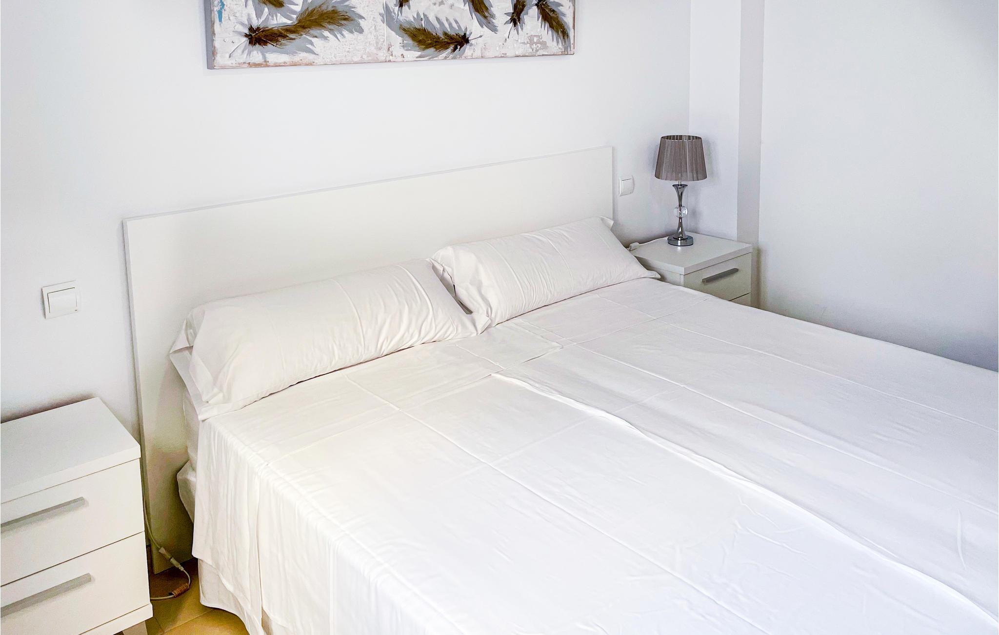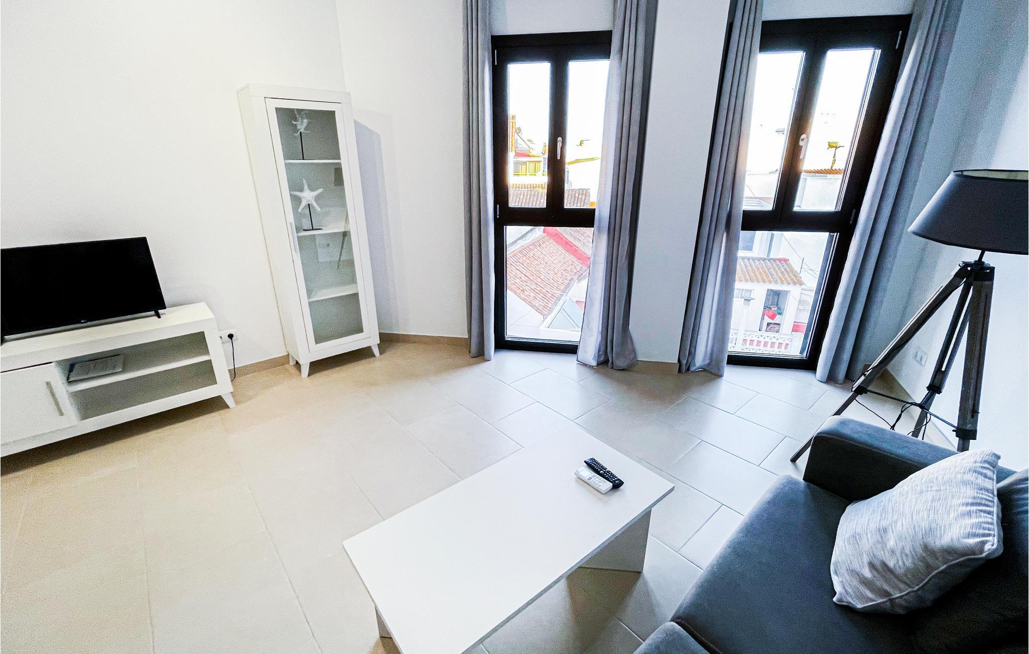 Med et soveværelse og to ekstra senge i stuen er der plads til op til 4 personer. Interiøret er lyst og moderne, og gulv-til-lof-vinduer lukker masser af dejligt lys ind i lejligheden. Takket være aircondition kan I altid nyde behagelige stuetemperaturer, selv om sommeren.