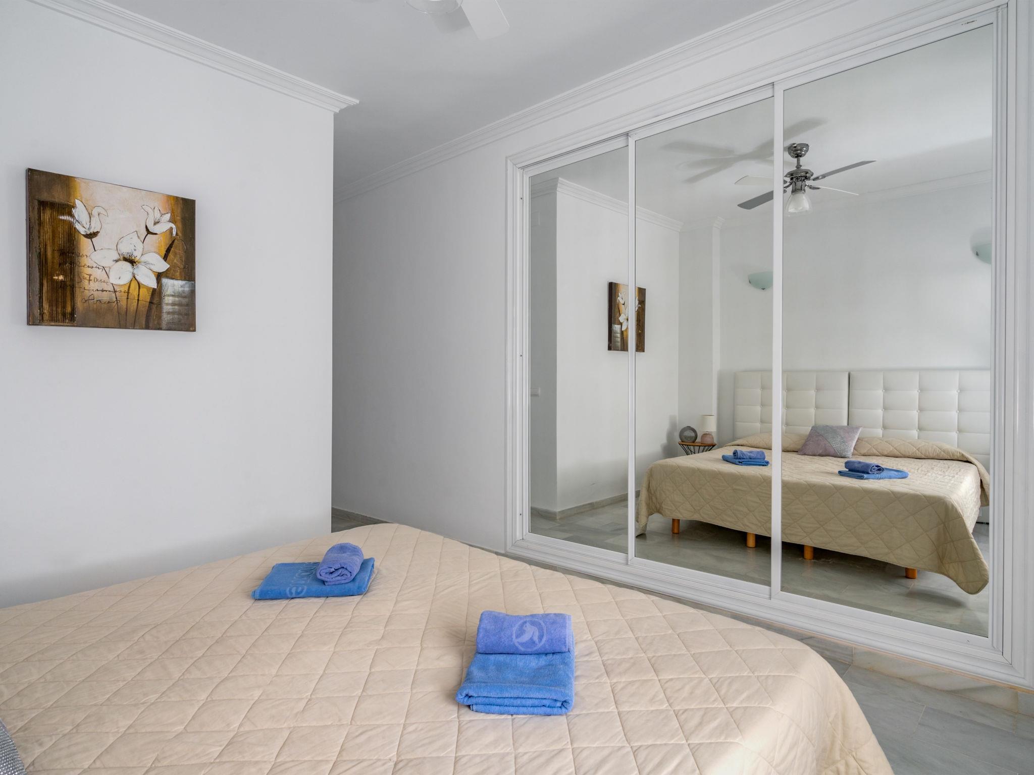 "Las Brisas Estepona Golf", 3-room apartment 139 m2, on the upper floor, south-west facing position. Object suitable for 4 adults. Bright, very practical furnishings: living/dining room with digital TV, air conditioning and forced-air heating. Exit to the terrace. 1 room with 2 beds (90 cm, length 190 cm), bath/shower/bidet/WC and double hand-basin (private) electric heating. 1 room with 1 french bed (180 cm, length 190 cm), electric heating. Exit to the terrace. Kitchen (oven, dishwasher, 4 ceramic glass hob hotplates, toaster, kettle, microwave, freezer, electric coffee machine, Capsules for coffee machine (De Longhi) free) with bar. Bath/shower/bidet/WC, double hand-basin. Natural stone floors. Terrace 16 m2, west facing position terrace 8 m2, south facing position and, east facing position. Terrace furniture. Facilities: washing machine, iron, children's high chair, baby cot for up to 2 year olds, hair dryer. Internet (WiFi, free). Parking space n 1 (1 car) at the house. Please note: non-smokers only. Maximum 1 pet/ dog allowed. VUT/MA/30083