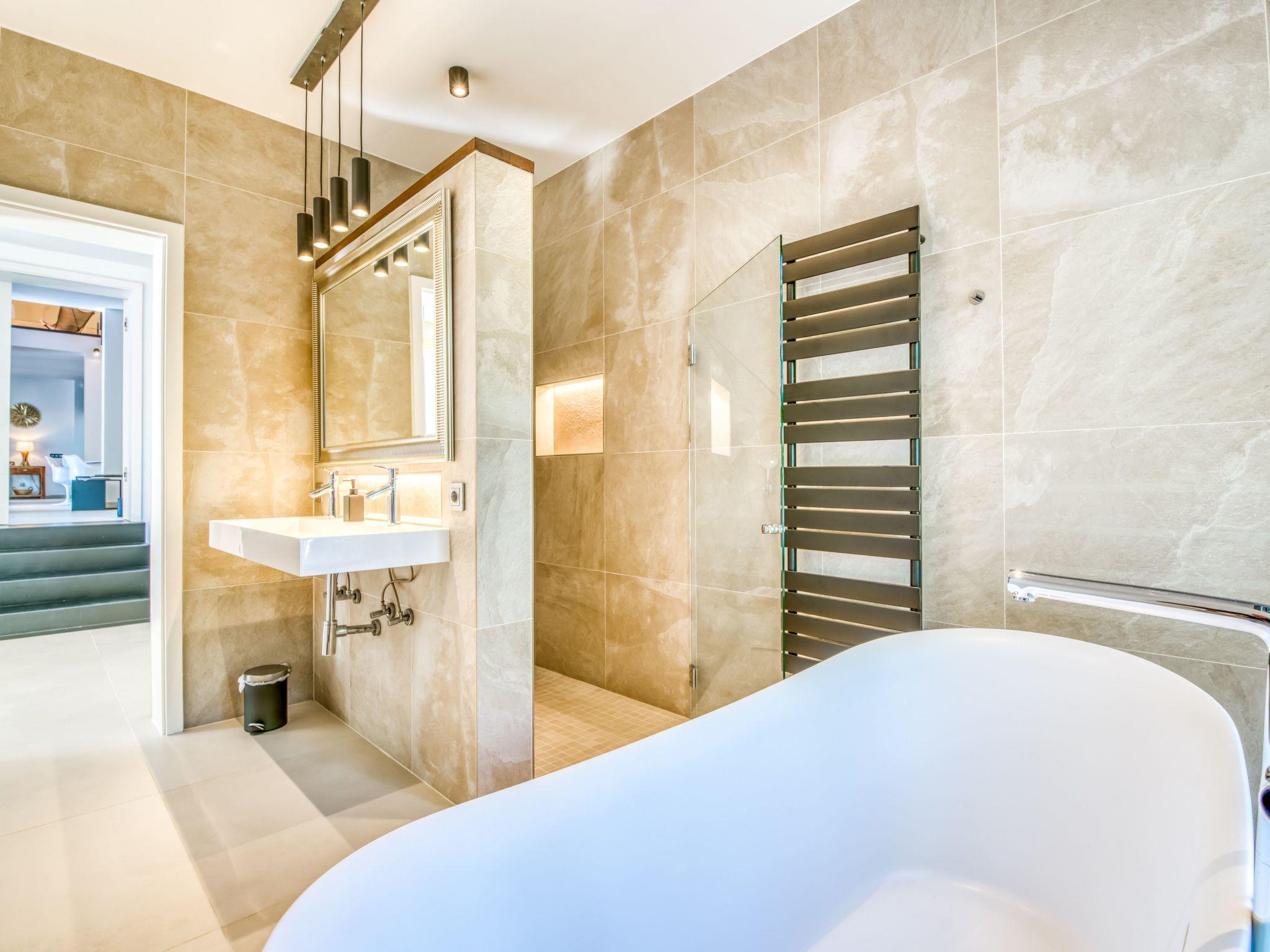 Other bedroom furnishings: bedroom with large double bed (1.80x2.00m with single mattresses), large wardrobe, access to private roof terrace, shares the adjoining bathroom (via corridor) with bedroom 5. The shared bathroom has a bathtub, large massage shower, washbasin, WC. Further shower facilities in the guest bathroom on the ground floor