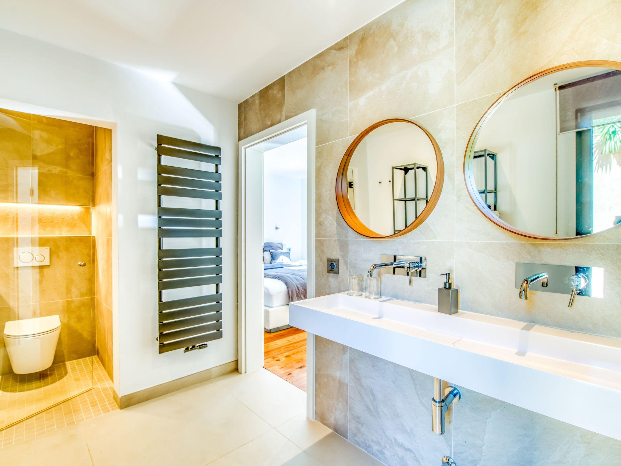 Other bedroom furnishings : Suite with bathroom with bathtub, massage shower, bidet, double washbasin, separate WC, dressing table, 32' TV, Philips speaker system for iPhone, iPad, iPod, access to private terrace, air conditioning, bed size 1.80x2.00m with single mattresses, location: ground floor
