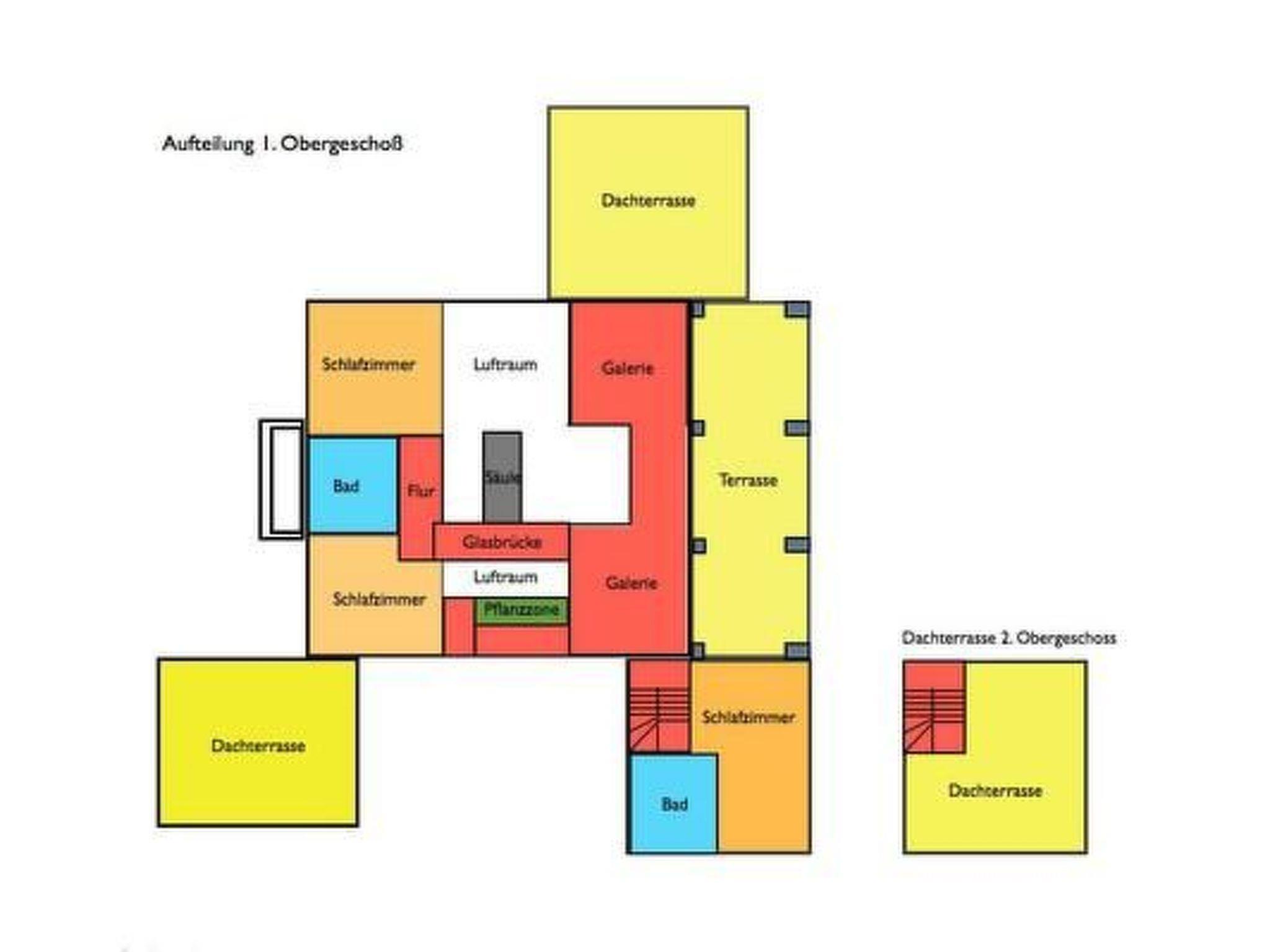 Other living room facilities : The living/dining/lounge area has approx. 150m2 on 2 levels, with an open gallery on the upper floor with a further seating area and exits to 2 terraces of approx. 100m2. On the ground floor there is a dining area with 2 large wooden tables that offer seating for up to 12 people. A spacious and elegant lounge area with an exclusive designer leather sofa landscape rounds off the living area. The unique architecture with ceilings up to 7.50 metres high and a view into the beams of the house, a steel bridge with a glass floor as a connection between the two galleries and a large planting zone with live cacti ensure a special spatial experience.