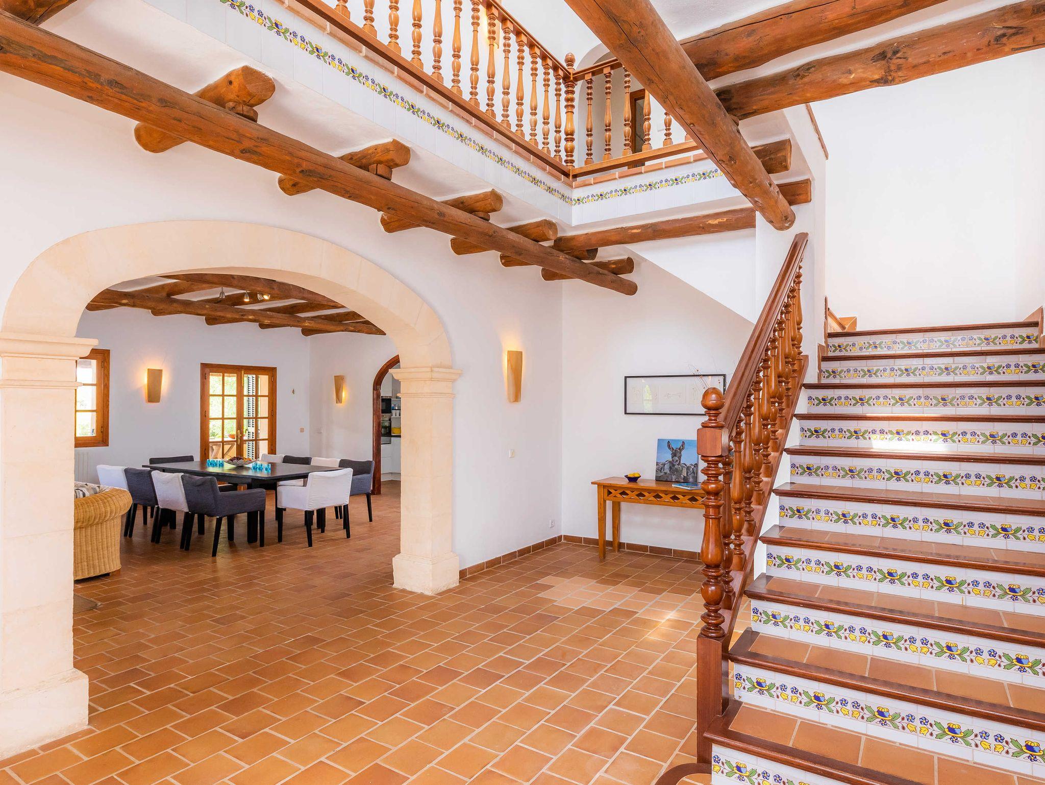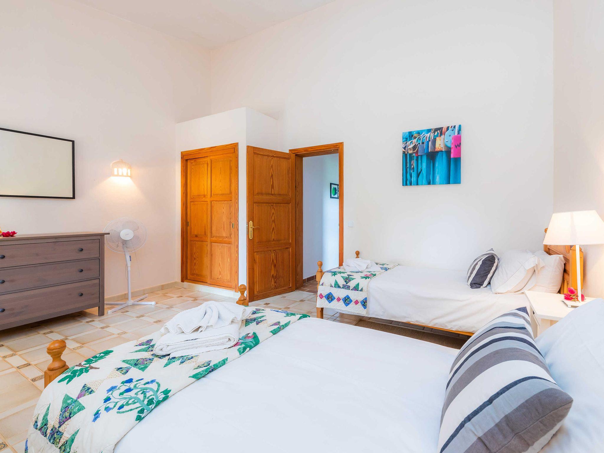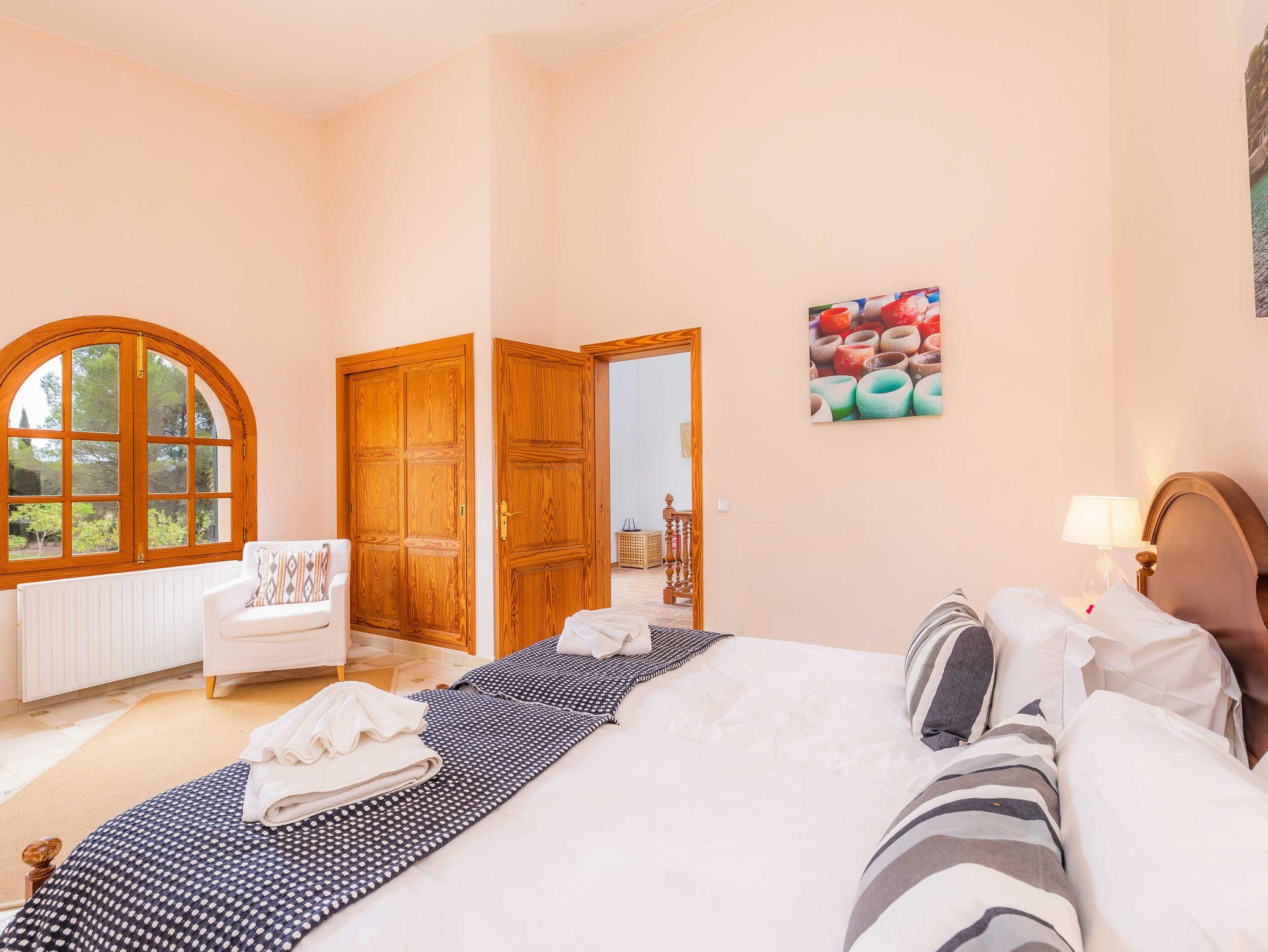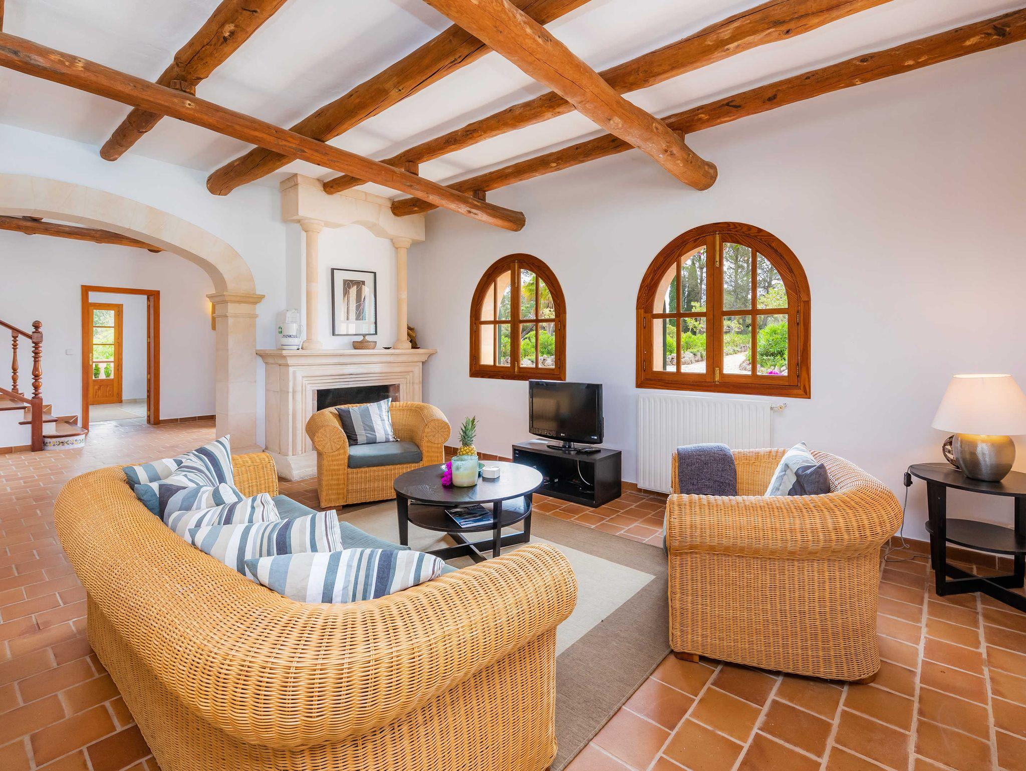 Großzügige Finca mit Pool und kostenloser Klimaanlage in schöner Alleinlage und gepflegtem Garten für 10 Personen + 2 Kinder. Neben dem gemütlichen Wohnzimmer mit Kamin, einem großen Essbereich und moderner Küche mit Zugang zur Terrasse mit Grillbereich befinden sich im Erdgeschoss zwei große Schlafzimmer und ein geräumiges Badezimmer. Hier gibt es auch Zugang zu einer weiteren Terrasse mit Tischtennisplatte. Im ersten Stock befinden sich zwei weitere Schlafzimmer mit Zugang zur Terrasse und zwei Badezimmer mit Dusche. Auf der gleichen Ebene ist die Mastersuite mit wunderbarem Ausblick, ausgestattet mit einem grossen Doppelbett, einem geräumigen Badezimmer mit Dusche und Badewanne und einem Salon mit Schlafcouch für zwei Personen. Mit mehreren Außenterrassen auf verschiedenen Ebenen sowie einem großen Pool - und Barbecue-Bereich bieten sich viele Gelegenheiten für entspannte Zusammentreffen als Familie, mit Freunden oder Gästen. Der Pool ist durch seinen Nichtschwimmerbereich besonders gut für Kleinkinder geeignet.