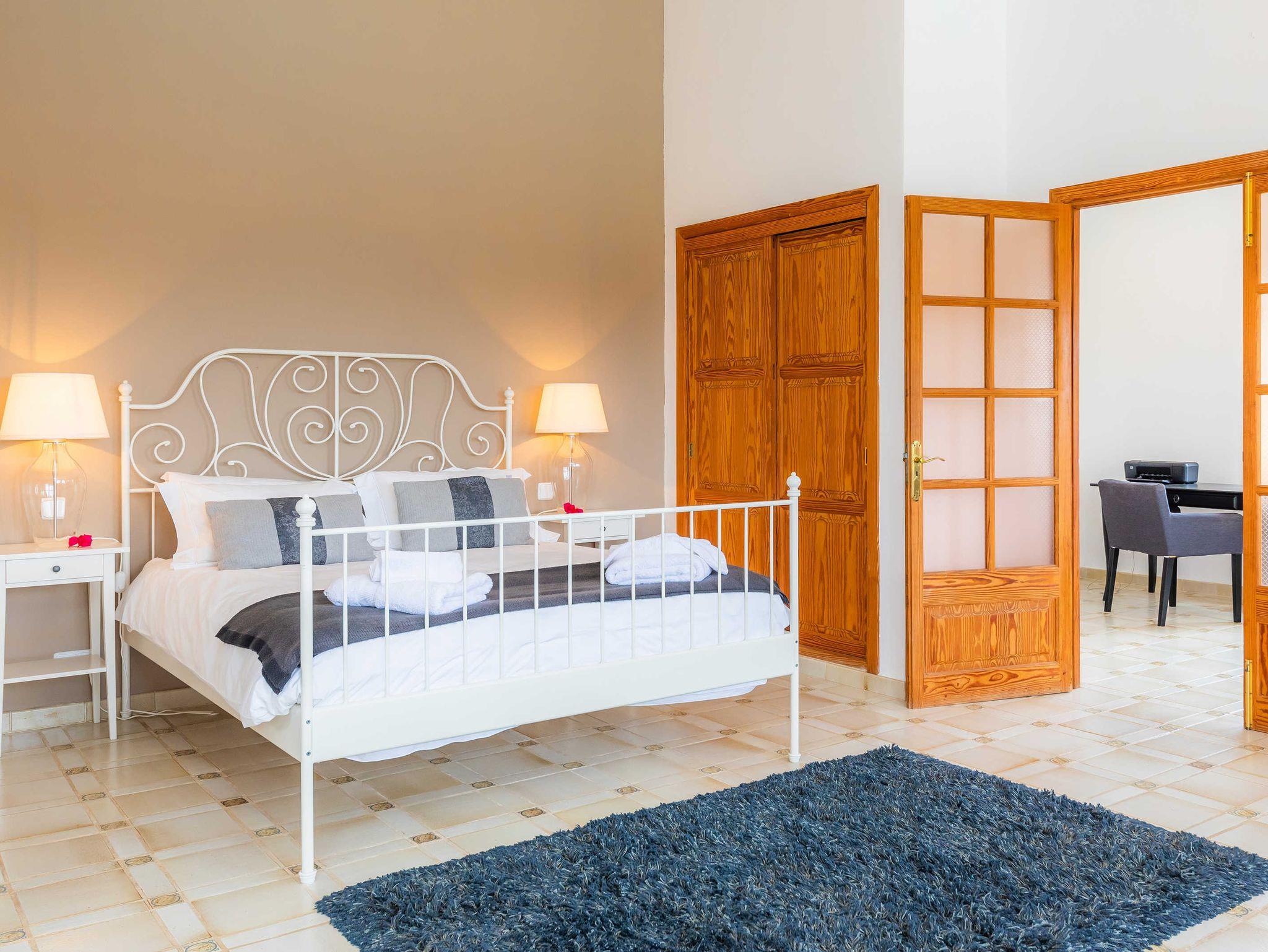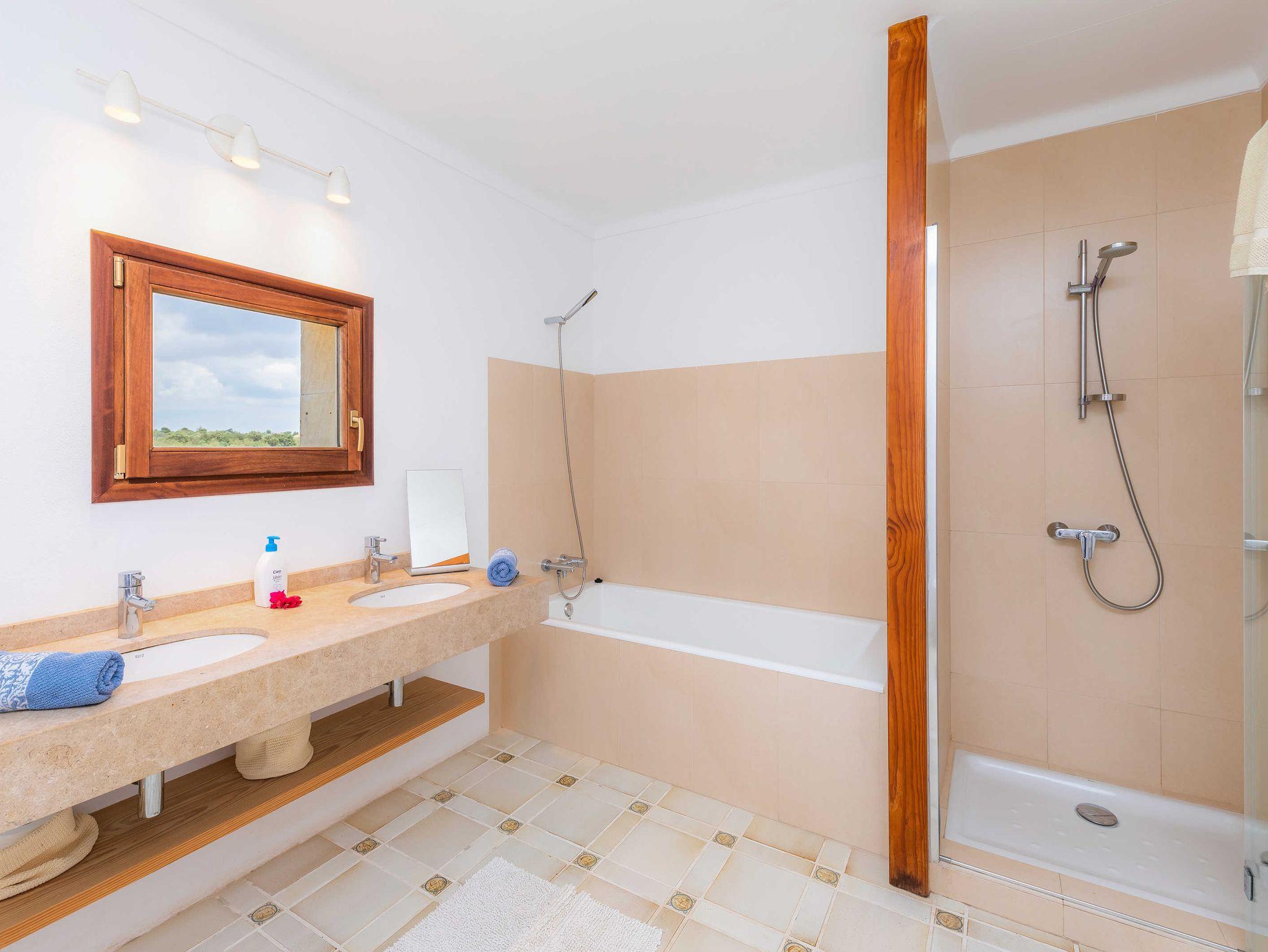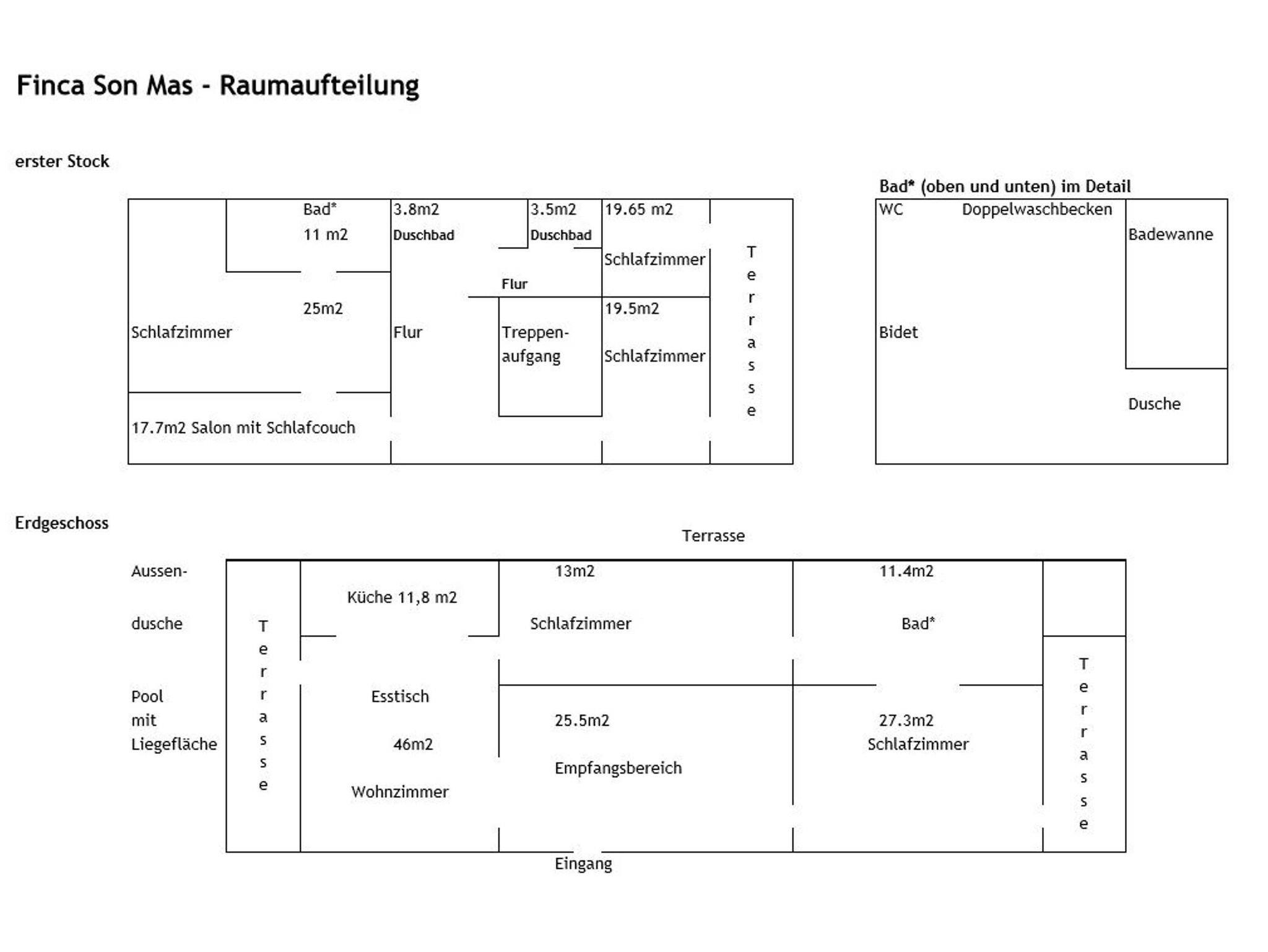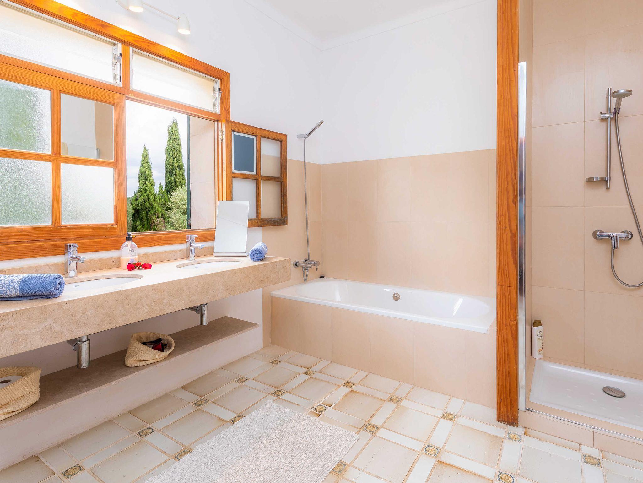 Großzügige Finca mit Pool und kostenloser Klimaanlage in schöner Alleinlage und gepflegtem Garten für 10 Personen + 2 Kinder. Neben dem gemütlichen Wohnzimmer mit Kamin, einem großen Essbereich und moderner Küche mit Zugang zur Terrasse mit Grillbereich befinden sich im Erdgeschoss zwei große Schlafzimmer und ein geräumiges Badezimmer. Hier gibt es auch Zugang zu einer weiteren Terrasse mit Tischtennisplatte. Im ersten Stock befinden sich zwei weitere Schlafzimmer mit Zugang zur Terrasse und zwei Badezimmer mit Dusche. Auf der gleichen Ebene ist die Mastersuite mit wunderbarem Ausblick, ausgestattet mit einem grossen Doppelbett, einem geräumigen Badezimmer mit Dusche und Badewanne und einem Salon mit Schlafcouch für zwei Personen. Mit mehreren Außenterrassen auf verschiedenen Ebenen sowie einem großen Pool - und Barbecue-Bereich bieten sich viele Gelegenheiten für entspannte Zusammentreffen als Familie, mit Freunden oder Gästen. Der Pool ist durch seinen Nichtschwimmerbereich besonders gut für Kleinkinder geeignet.