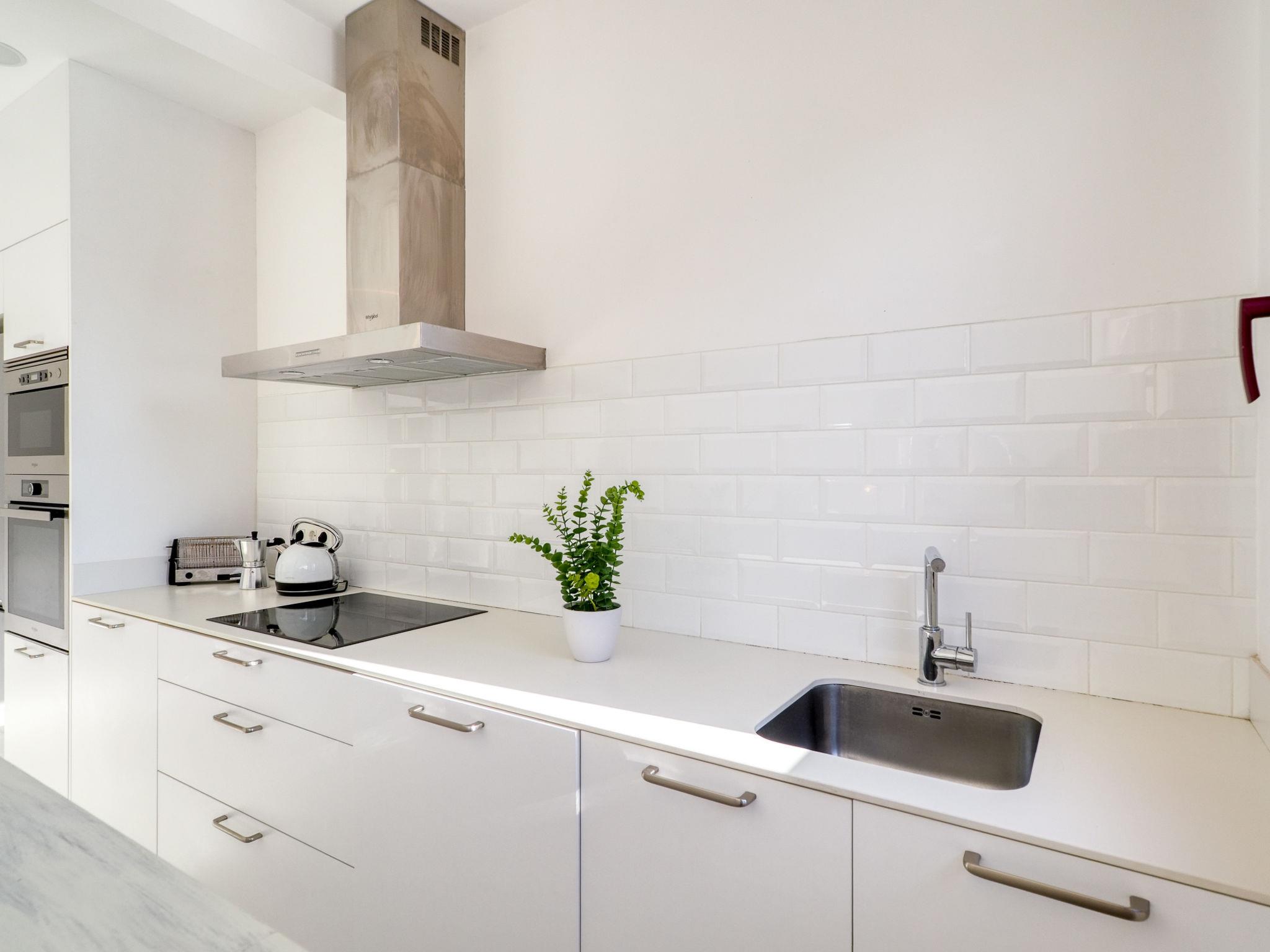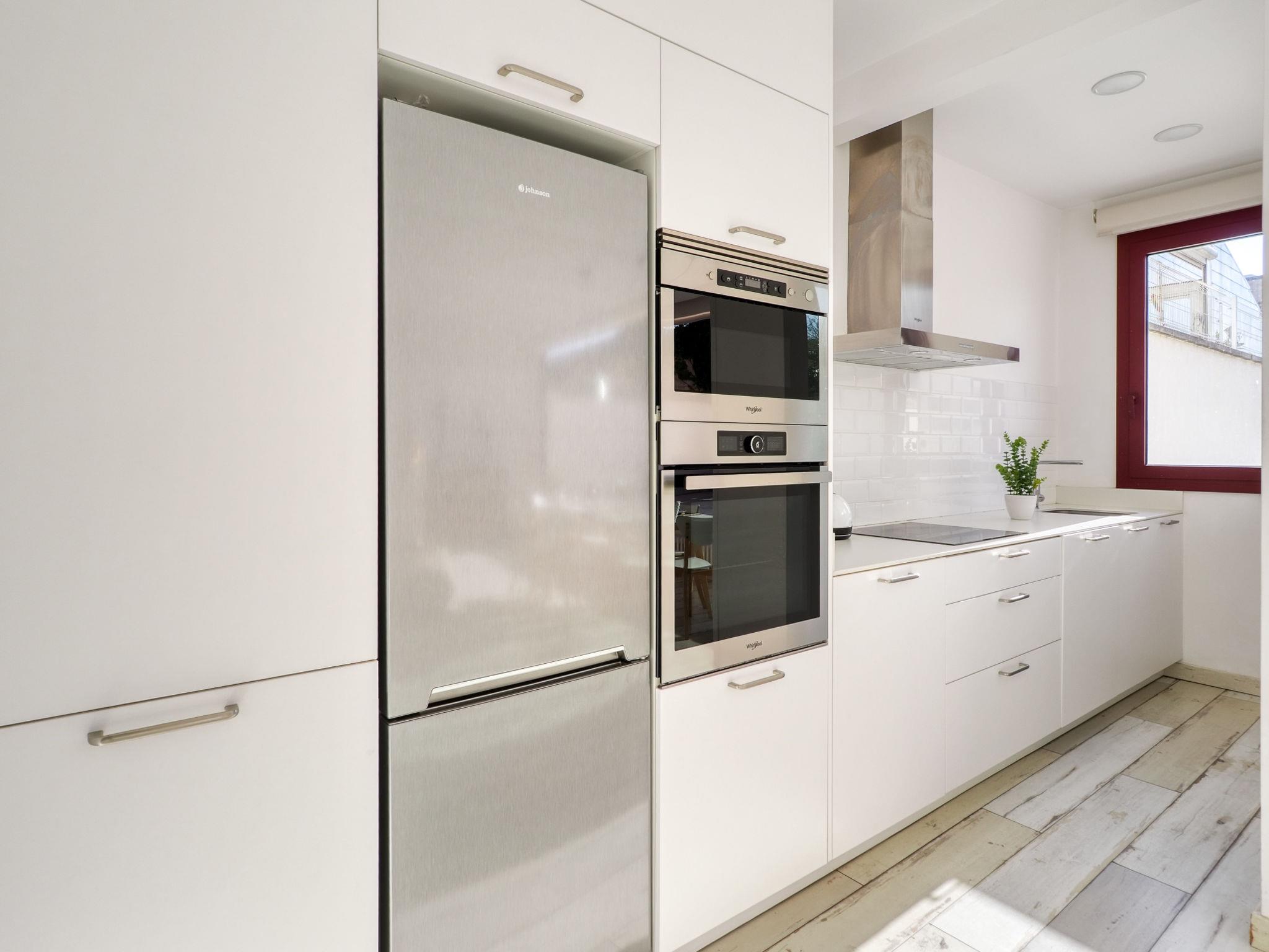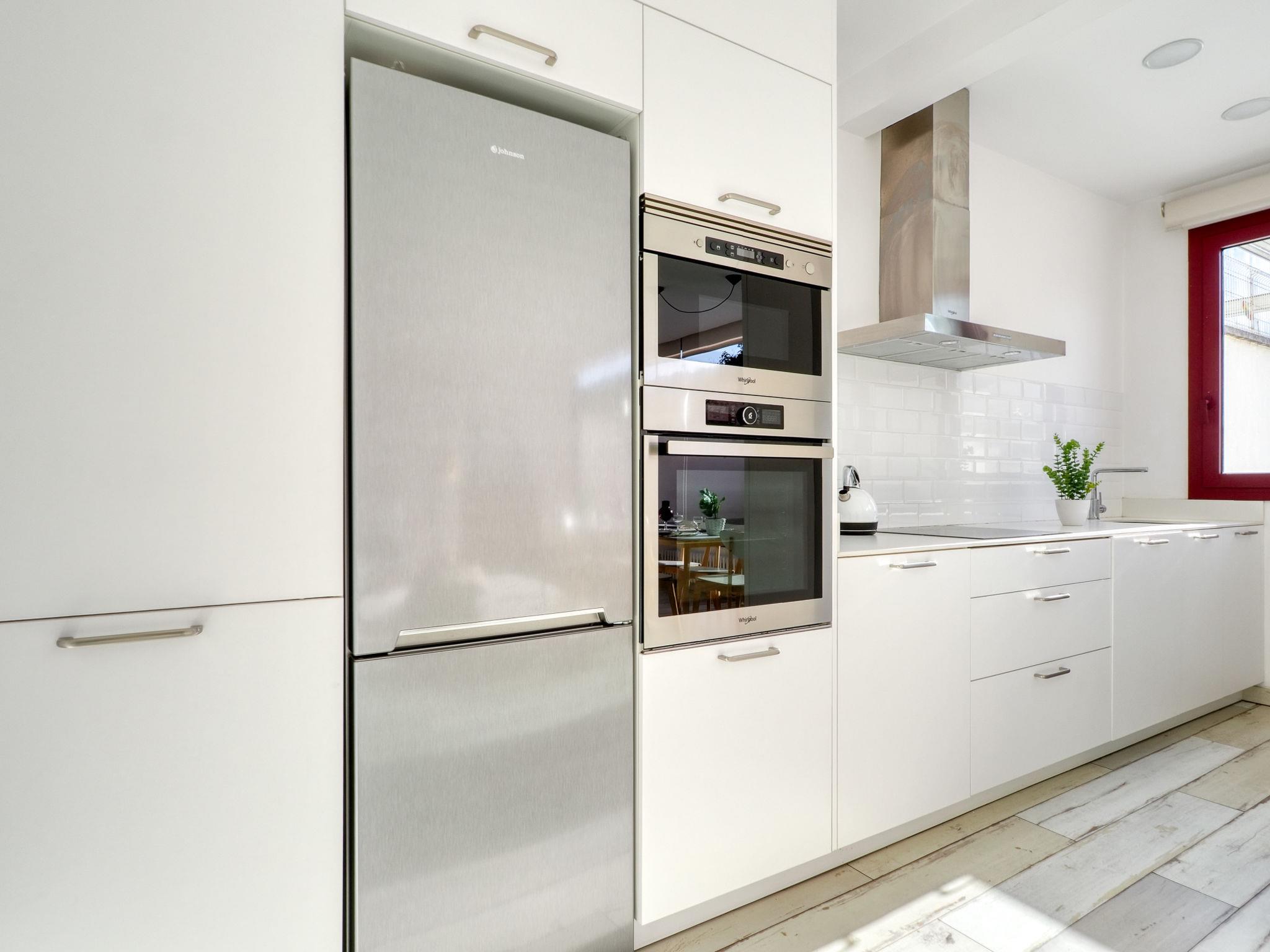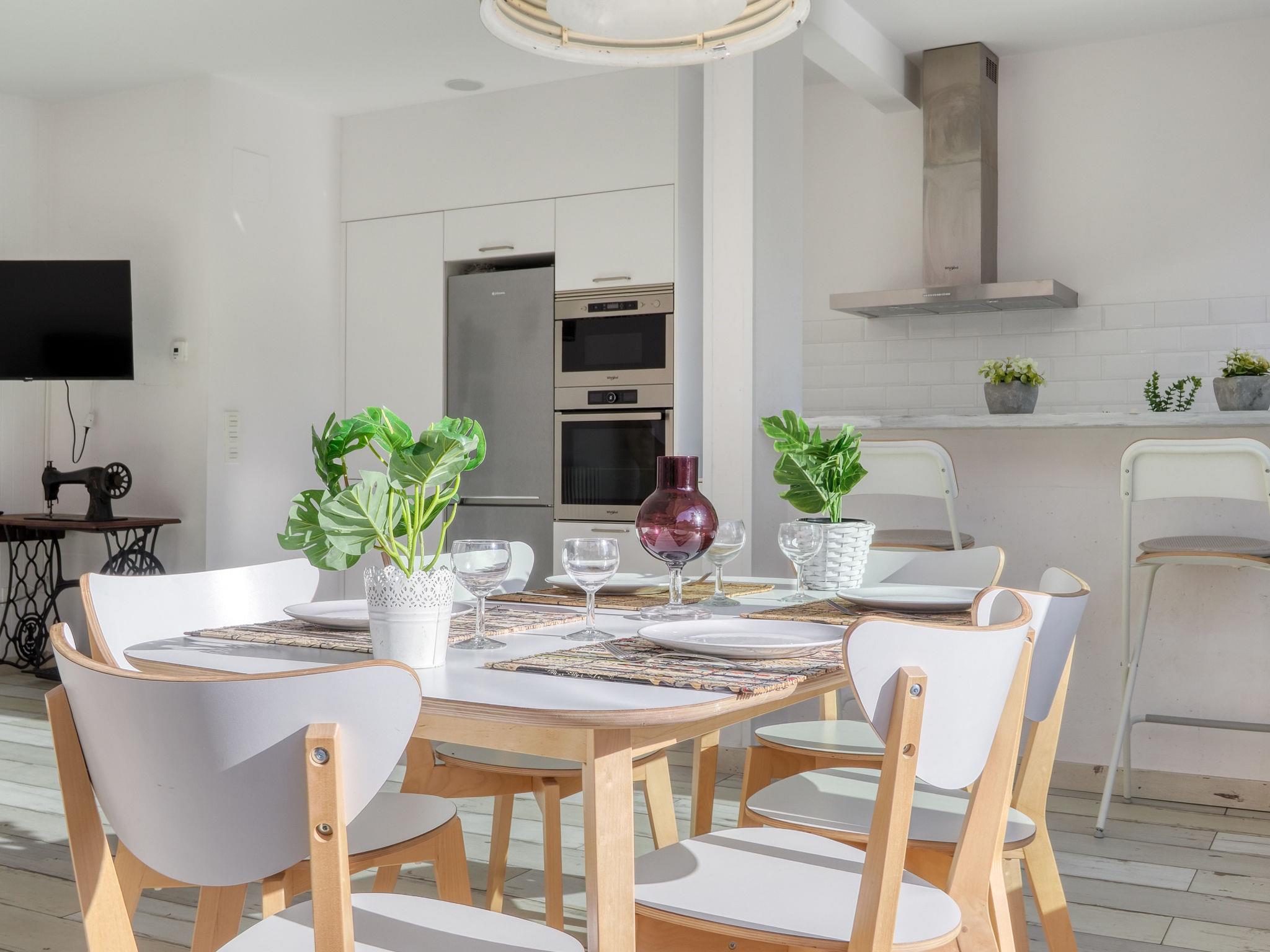 3-room terraced house 90 m2, on the upper floor. Bright, modern and stylish furnishings: living/dining room with dining table, satellite TV, gas heating, air conditioning and forced-air heating. Exit to the terrace. Kitchen (oven, dishwasher, 3 ceramic glass hob hotplates, toaster, kettle, microwave, freezer, electric coffee machine). Shower/WC. Upper floor: 1 room with 1 french bed (150 cm, length 190 cm). 1 room with 2 beds (90 cm, length 190 cm). Patio. Terrace furniture. Facilities: washing machine, iron, hair dryer. Internet (WiFi, free). Parking (fenced). Please note: non-smoking house. No lift. HUTG-052923 // Reg. Nr.: ESFCTU00001700800005948600000000000000HUTG-052923-689