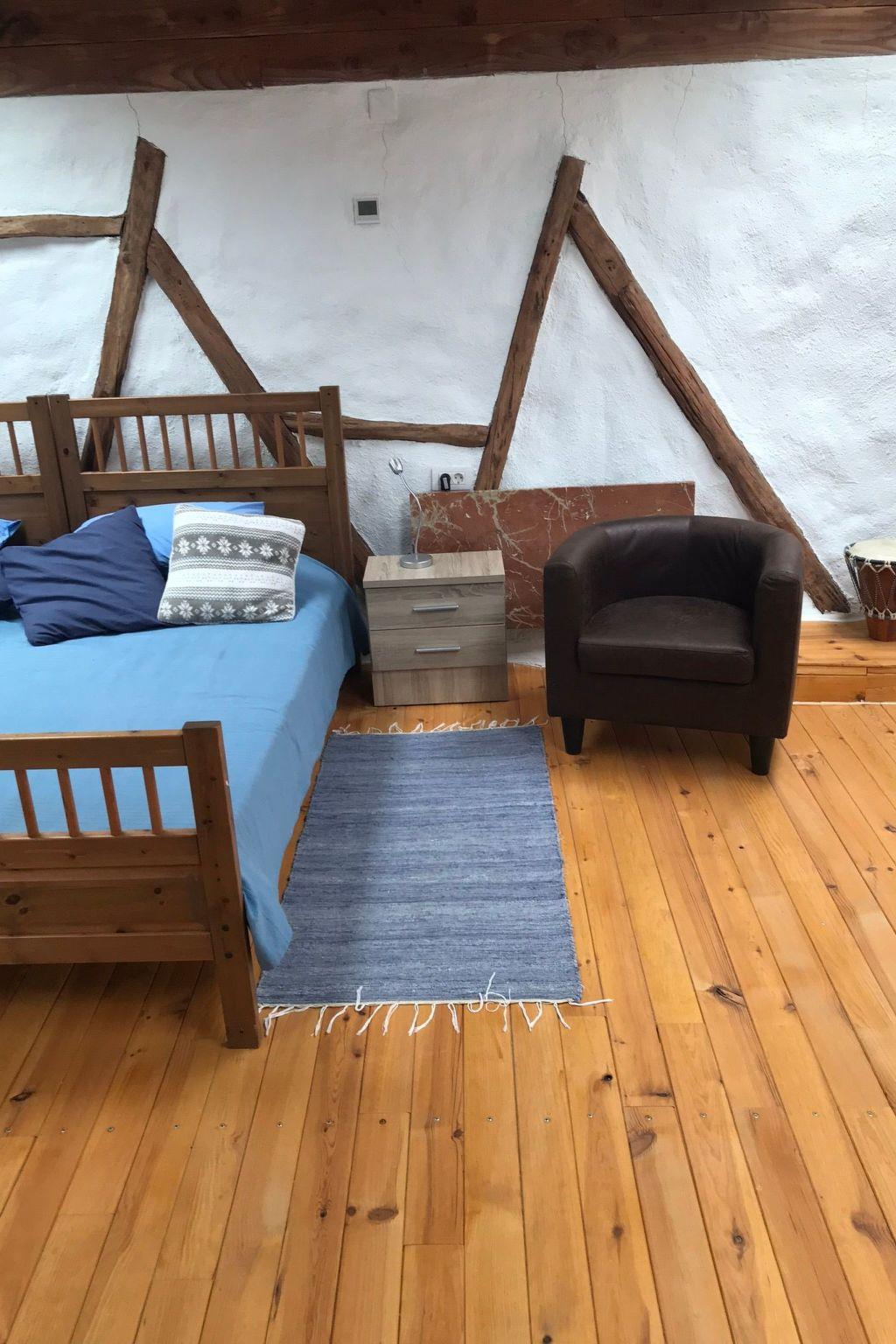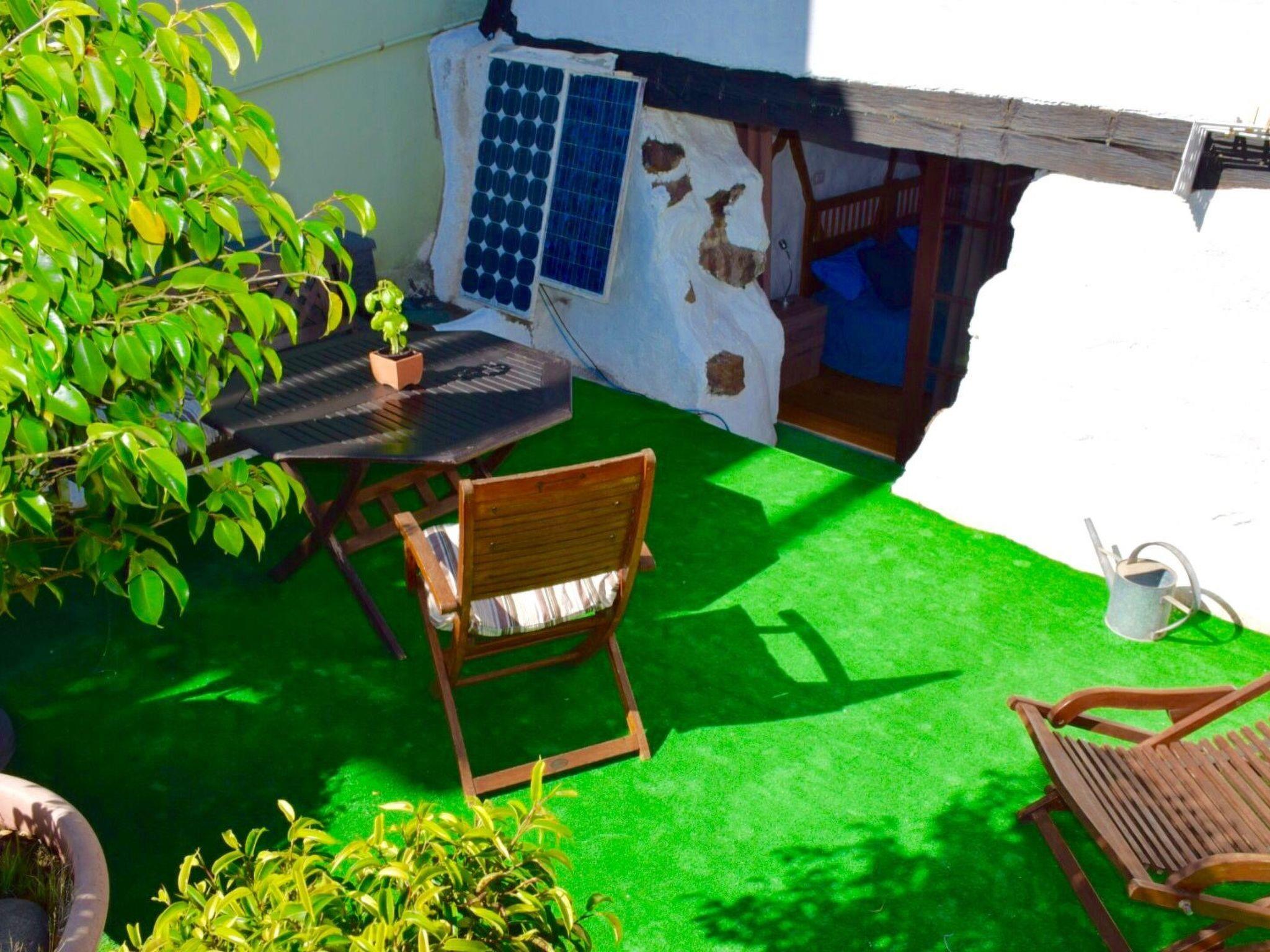 The sustainably run finca holiday home has an area of 45 sqm and consists of one large room. There is a flatscreen TV and a double bed, which can also be placed separately. The kitchen is integrated into the room. The dining table separates the fully equipped kitchen with cooker, fridge, oven/microwave, coffee machine, kettle, blender and lemon squeezer from the living/sleeping area. The adjoining bathroom has a WC, a walk-in shower and a washing machine.