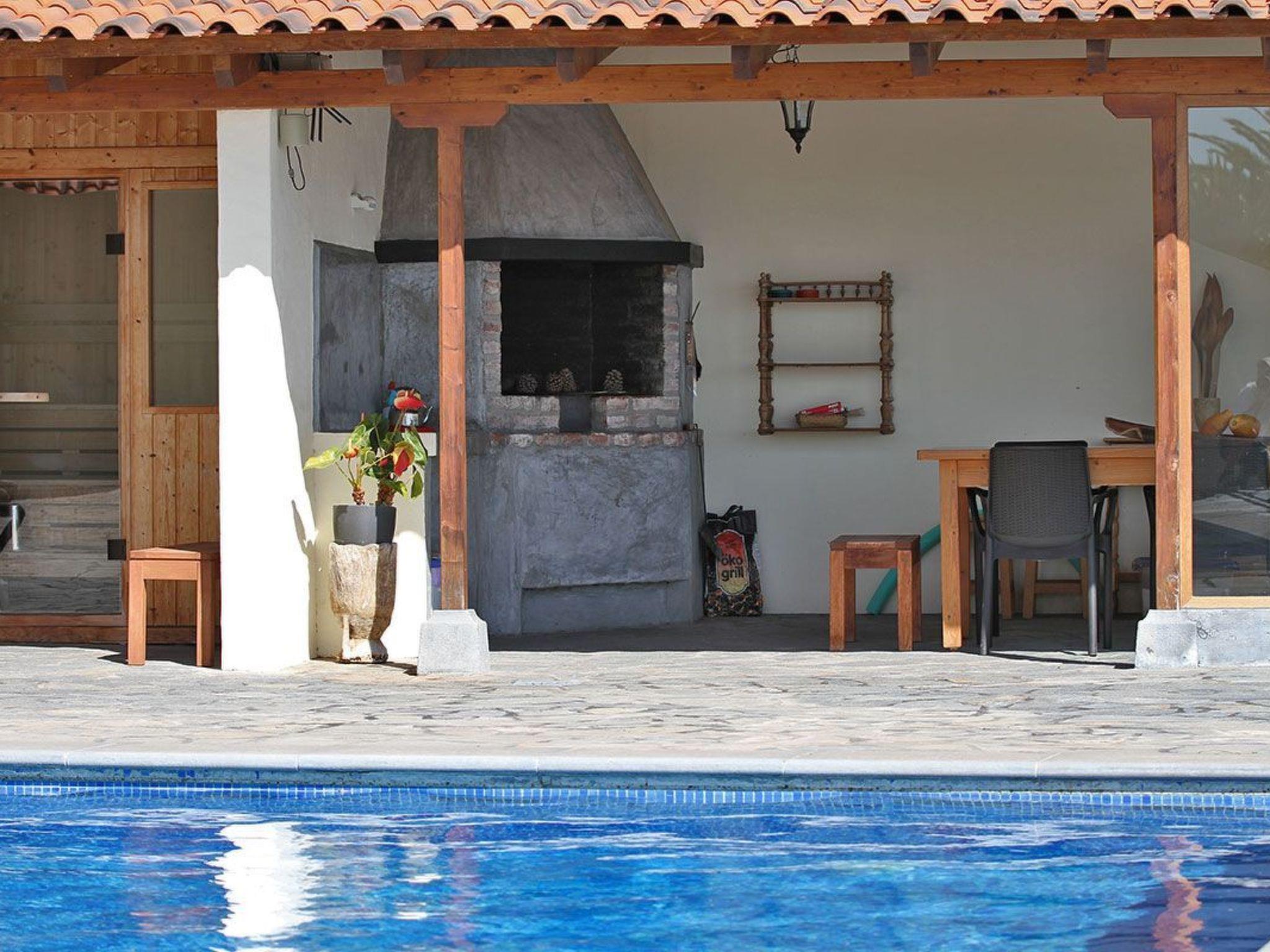 In the common outside area, there are large gardens, a pool area where there are sun loungers for each client, sauna, bathroom, washing machine, a communal barbecue that is sheltered from the possible cold of the night, which has a large table, a refrigerator. In the pool area there is an excellent view of the beach of Puerto de Naos and surroundings. It has private parking.