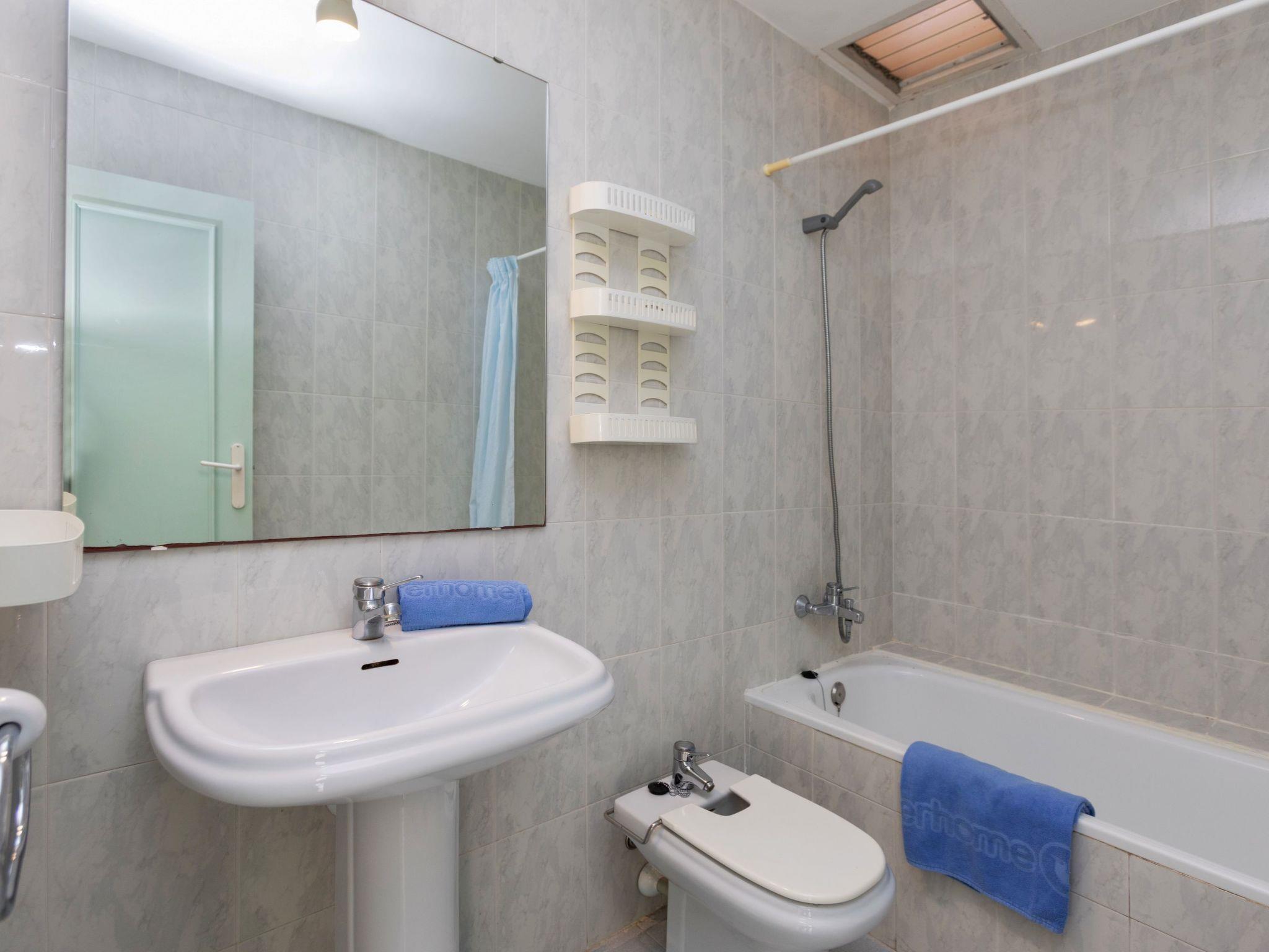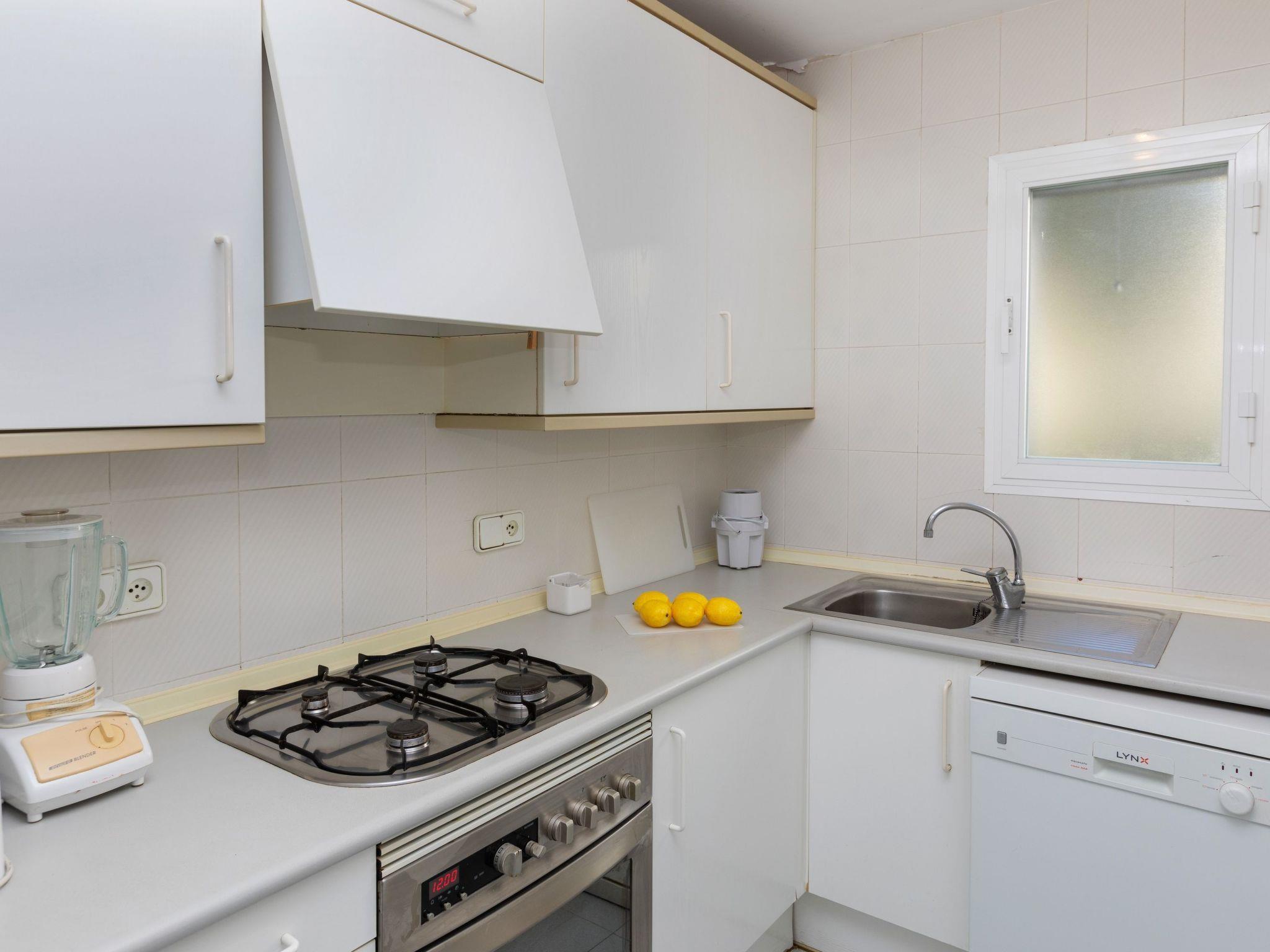 "Residencial Cap de Grifeu", 4-room terraced house 115 m2 on 2 levels. Practical and cosy furnishings: living/dining room with TV and digital TV (flat screen). Exit to the terrace. Kitchen (4 hot plates, oven, dishwasher, toaster, microwave). Shower/WC. No heating option. Upper floor: 1 room with 1 french bed (1 x 160 cm). Exit to the terrace. 1 room with 1 x 2 bunk beds (90 cm), 1 pull-out bed. 1 room with 1 pull-out bed (2 x 90 cm). Bath/bidet/WC. Large terrace. Terrace furniture. Beautiful view of the sea. Facilities: washing machine, iron. Parking. HUTG-002290 // Reg. Nr.: ESFCTU00001702000032926000000000000000000HUTG-0193930