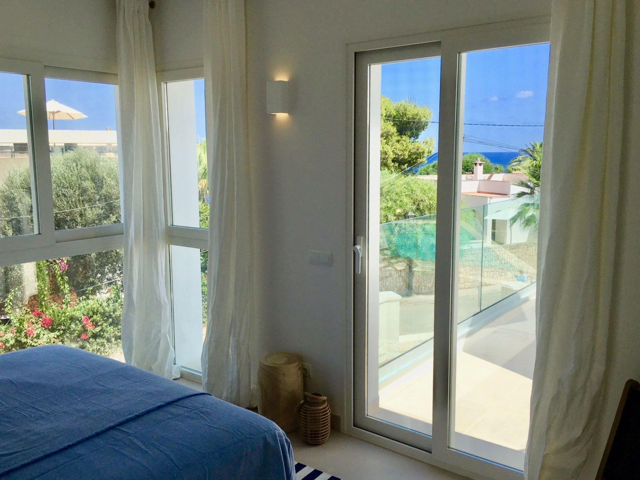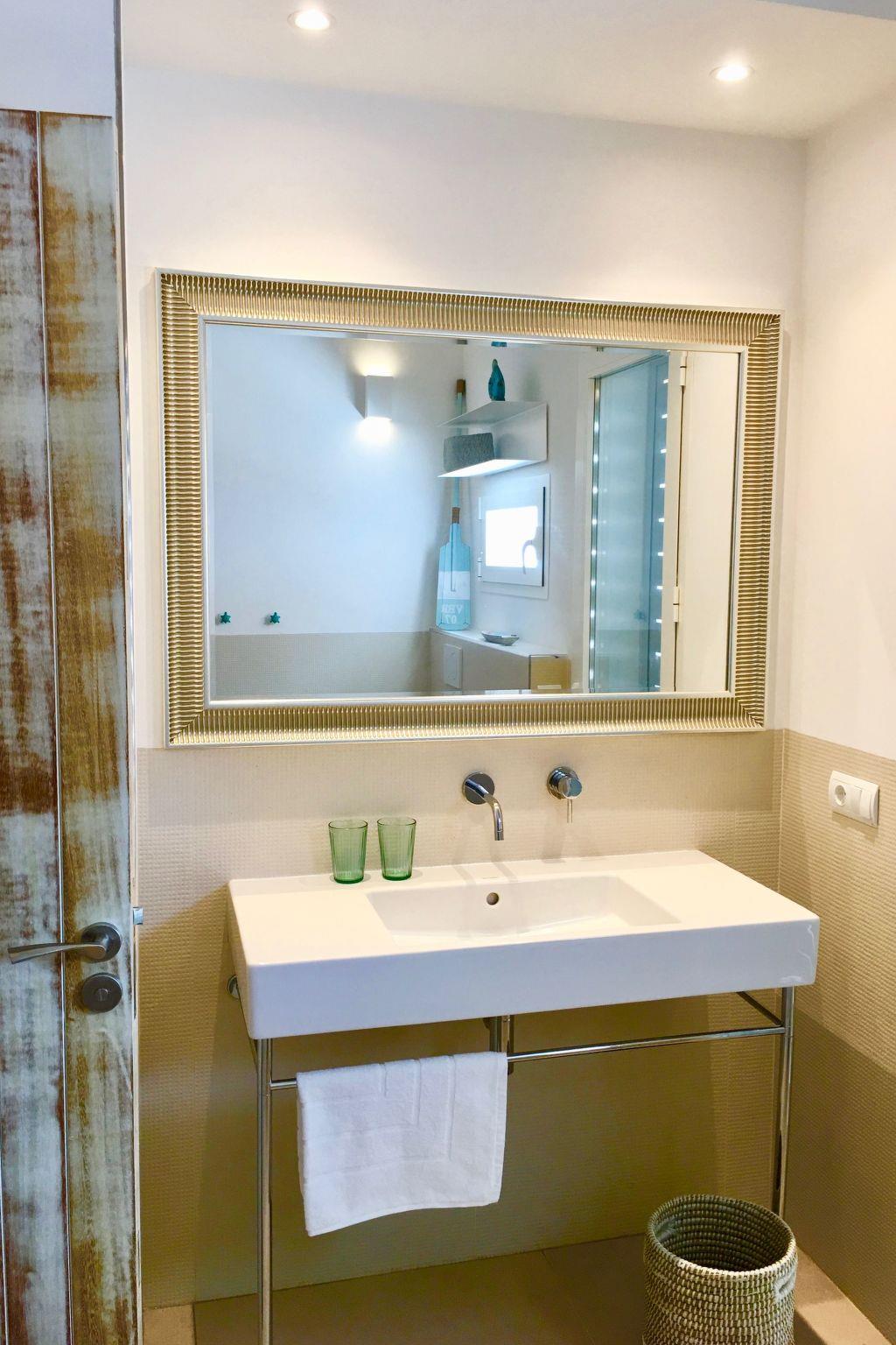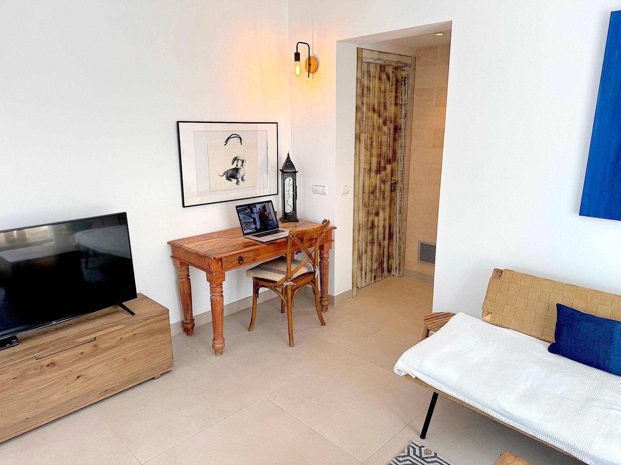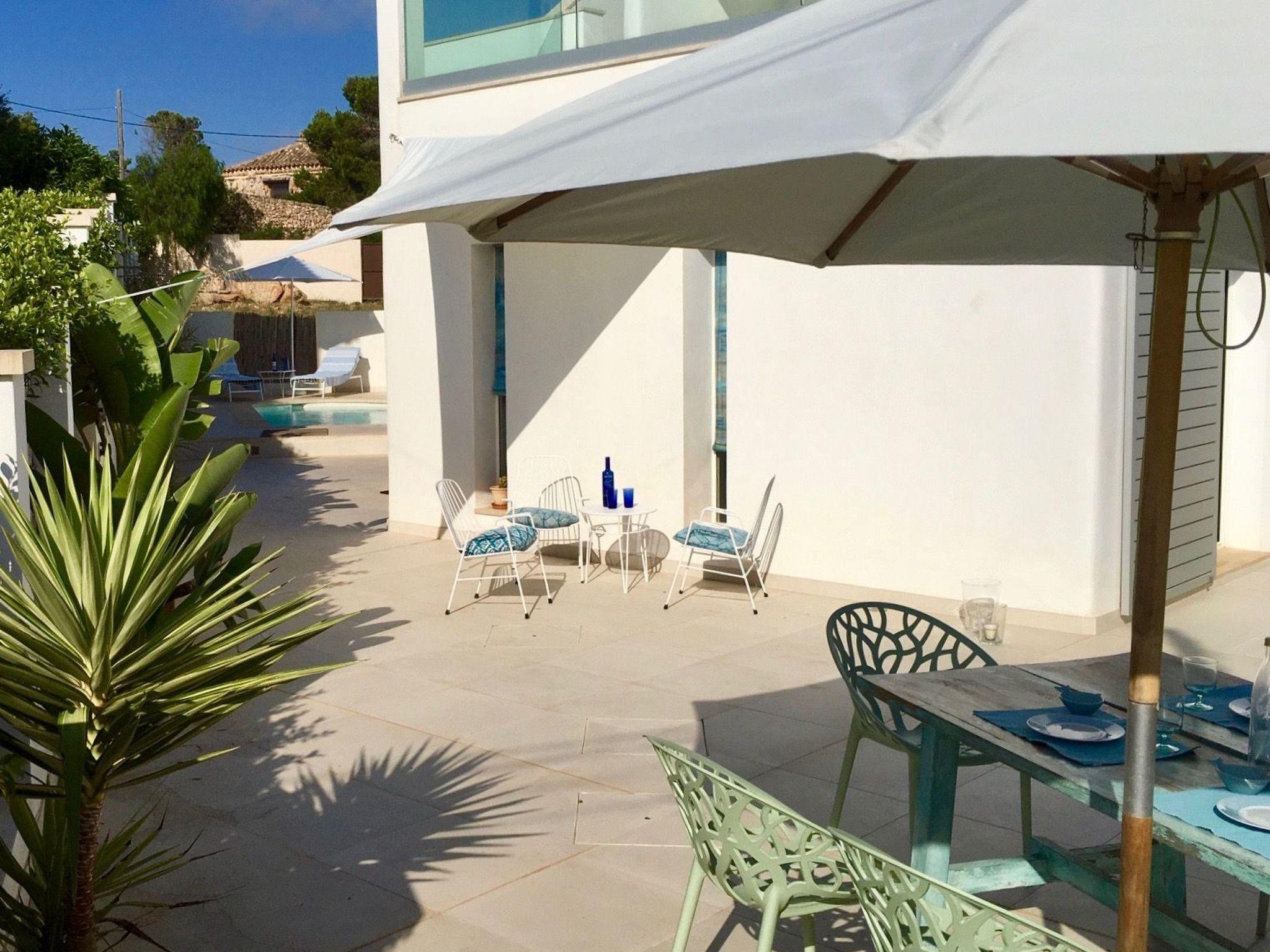 On the ground floor there is an open-plan living and dining area with an adjoining open-plan kitchen. A bedroom with safe and a bathroom are available on the ground floor. The second bathroom and the master bedroom with access to the terrace are located on the upper floor. Both the terrace and the bedroom offer fantastic views of the sea. An open staircase leads from the terrace to the roof terrace. From here you can see across the sea to Es Pontas and in the direction of Cala Santanyi. The terraces are equipped with sun loungers. All living rooms and bedrooms are air-conditioned. In the garden is the white-tiled pool 3.25 m x 7.5 m, up to 2.20 m deep and sun terraces, parasols and loungers. It takes on a turquoise colour during the day thanks to the light. In the evening with LED in any colour possible. A hatch opens up the kitchen to the patio and the outdoor barbecue, making it easy to open up the summer kitchen. There is a dining area with a large outdoor table. There is also a partial sea view from there.