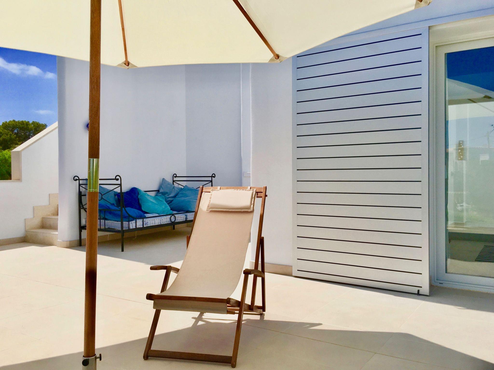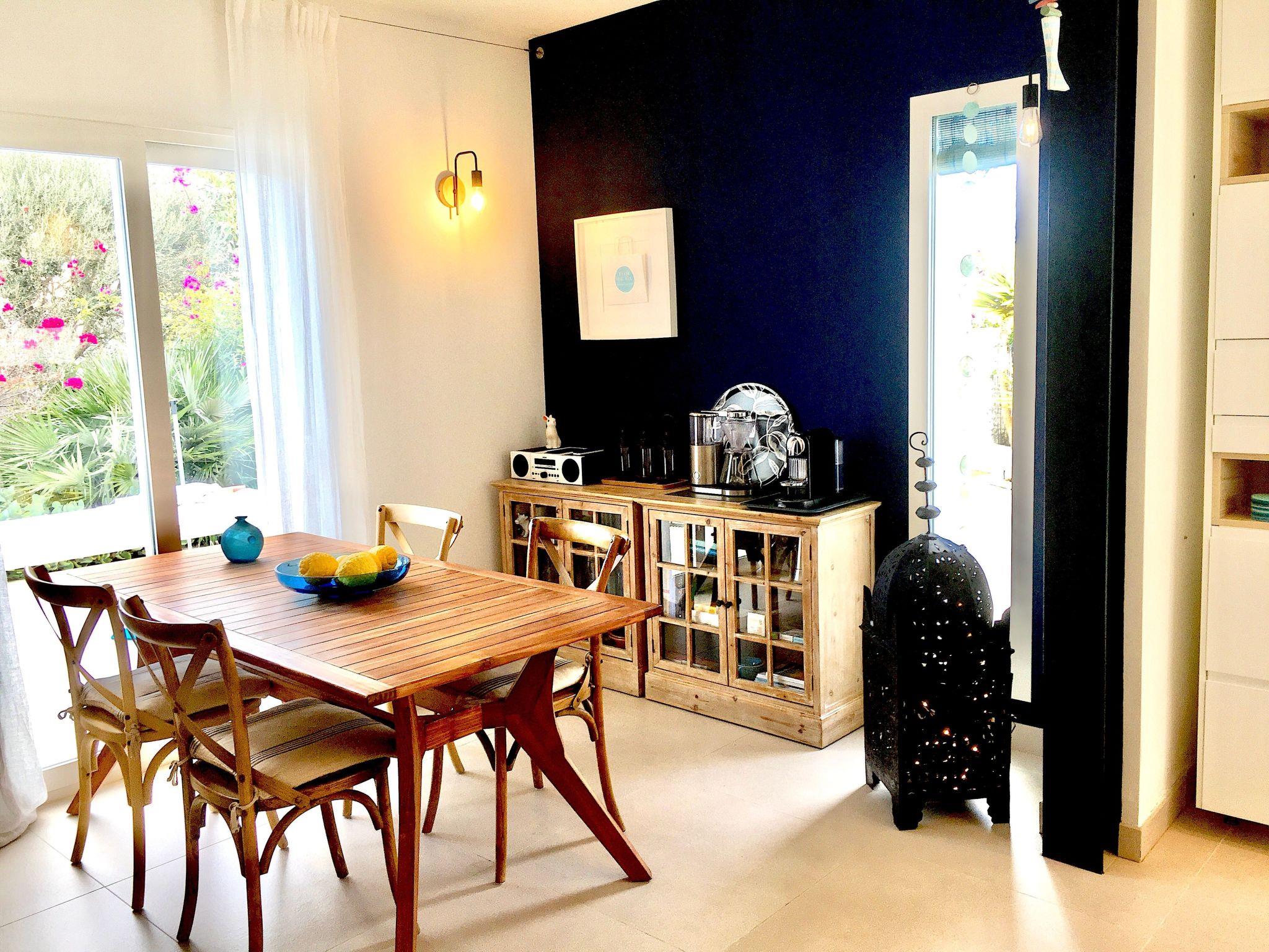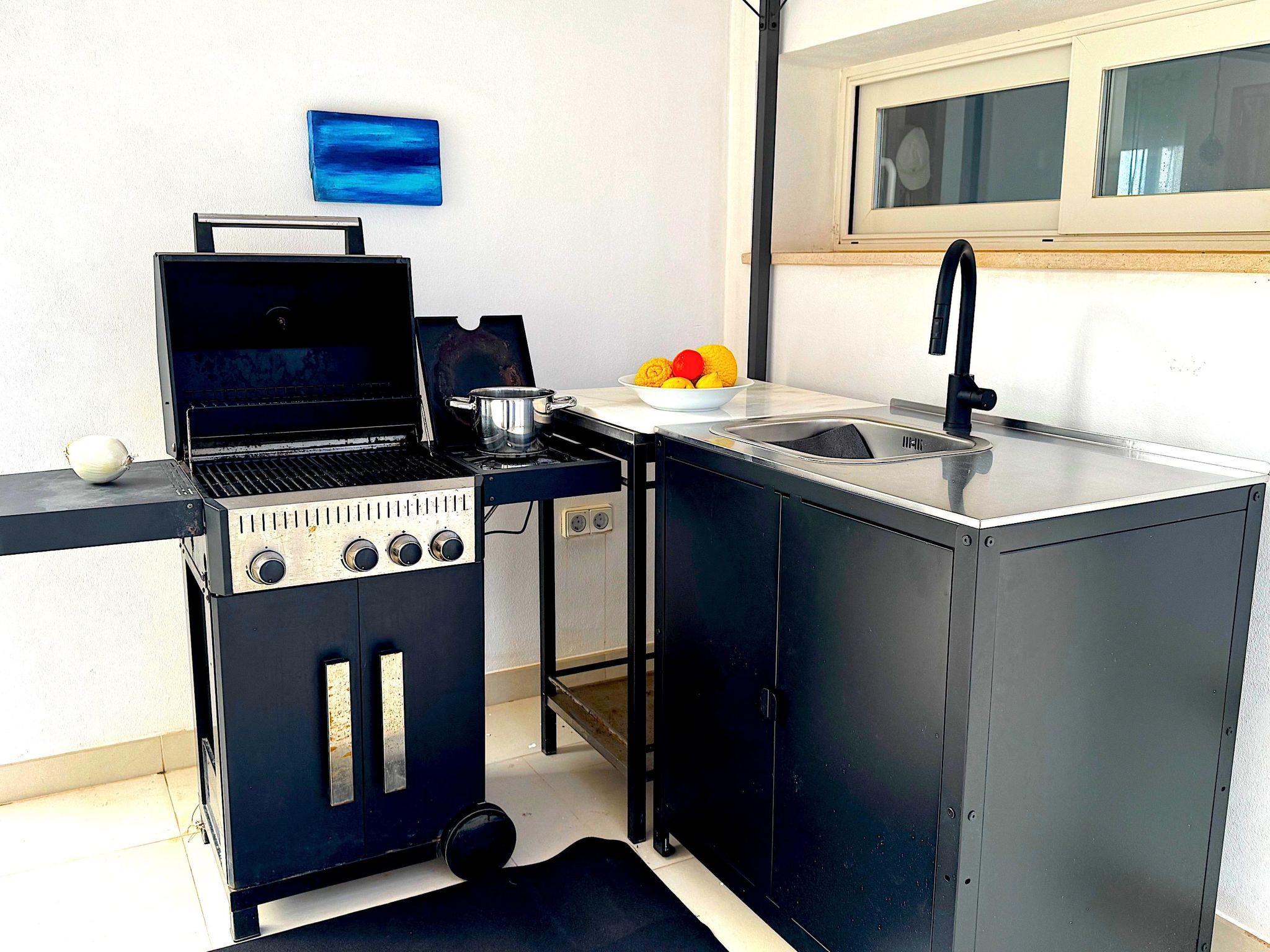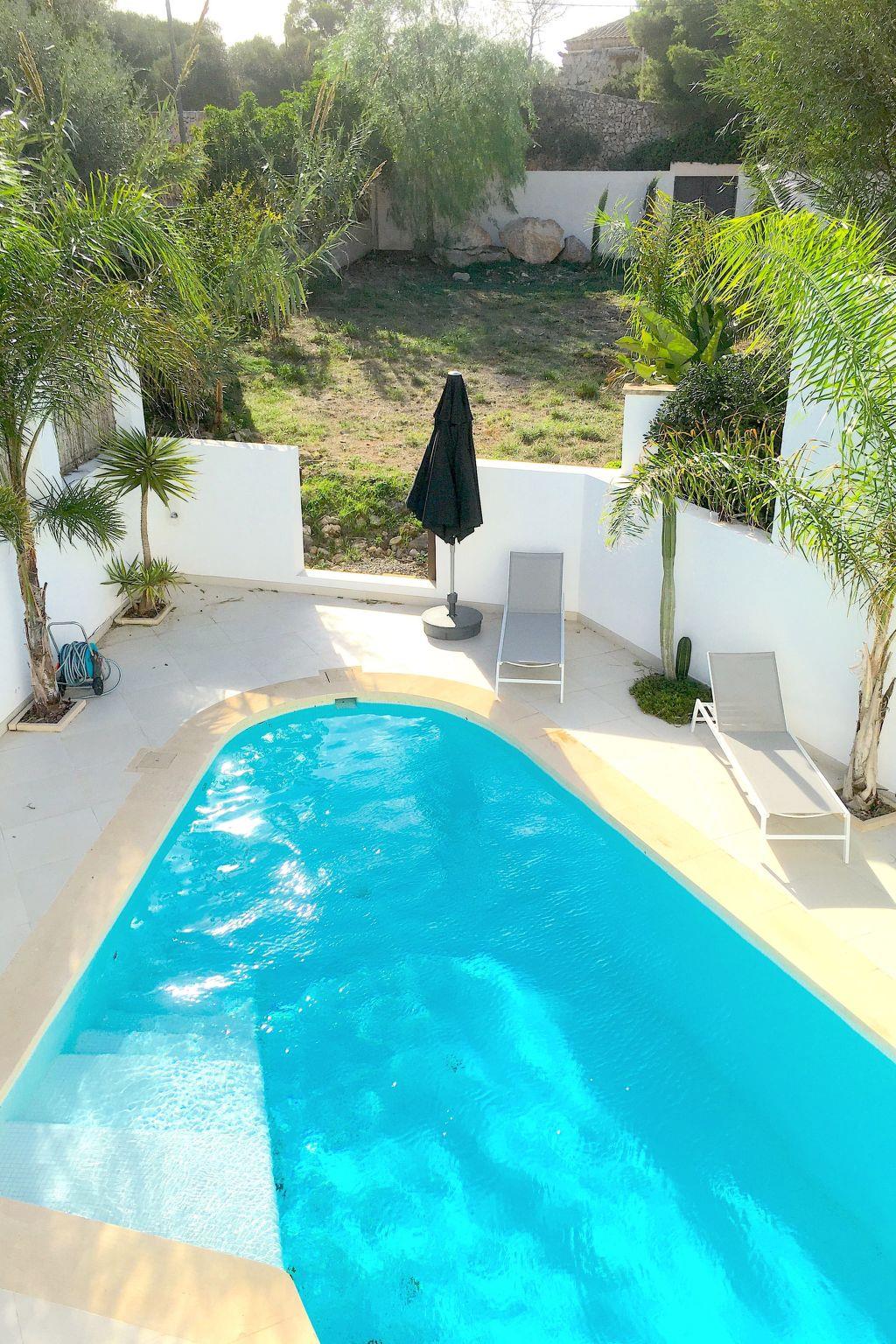On the ground floor there is an open-plan living and dining area with an adjoining open-plan kitchen. A bedroom with safe and a bathroom are available on the ground floor. The second bathroom and the master bedroom with access to the terrace are located on the upper floor. Both the terrace and the bedroom offer fantastic views of the sea. An open staircase leads from the terrace to the roof terrace. From here you can see across the sea to Es Pontas and in the direction of Cala Santanyi. The terraces are equipped with sun loungers. All living rooms and bedrooms are air-conditioned. In the garden is the white-tiled pool 3.25 m x 7.5 m, up to 2.20 m deep and sun terraces, parasols and loungers. It takes on a turquoise colour during the day thanks to the light. In the evening with LED in any colour possible. A hatch opens up the kitchen to the patio and the outdoor barbecue, making it easy to open up the summer kitchen. There is a dining area with a large outdoor table. There is also a partial sea view from there.