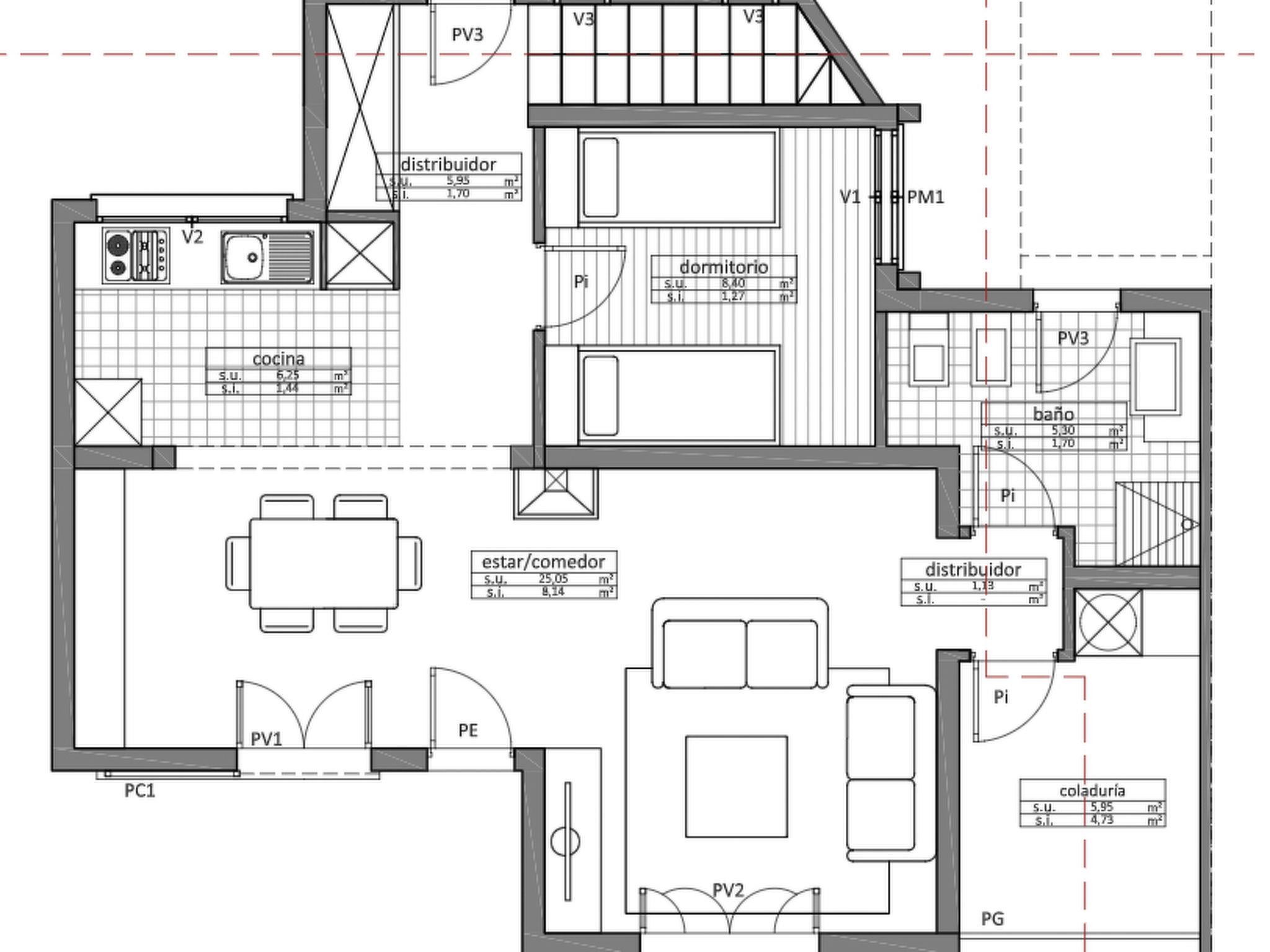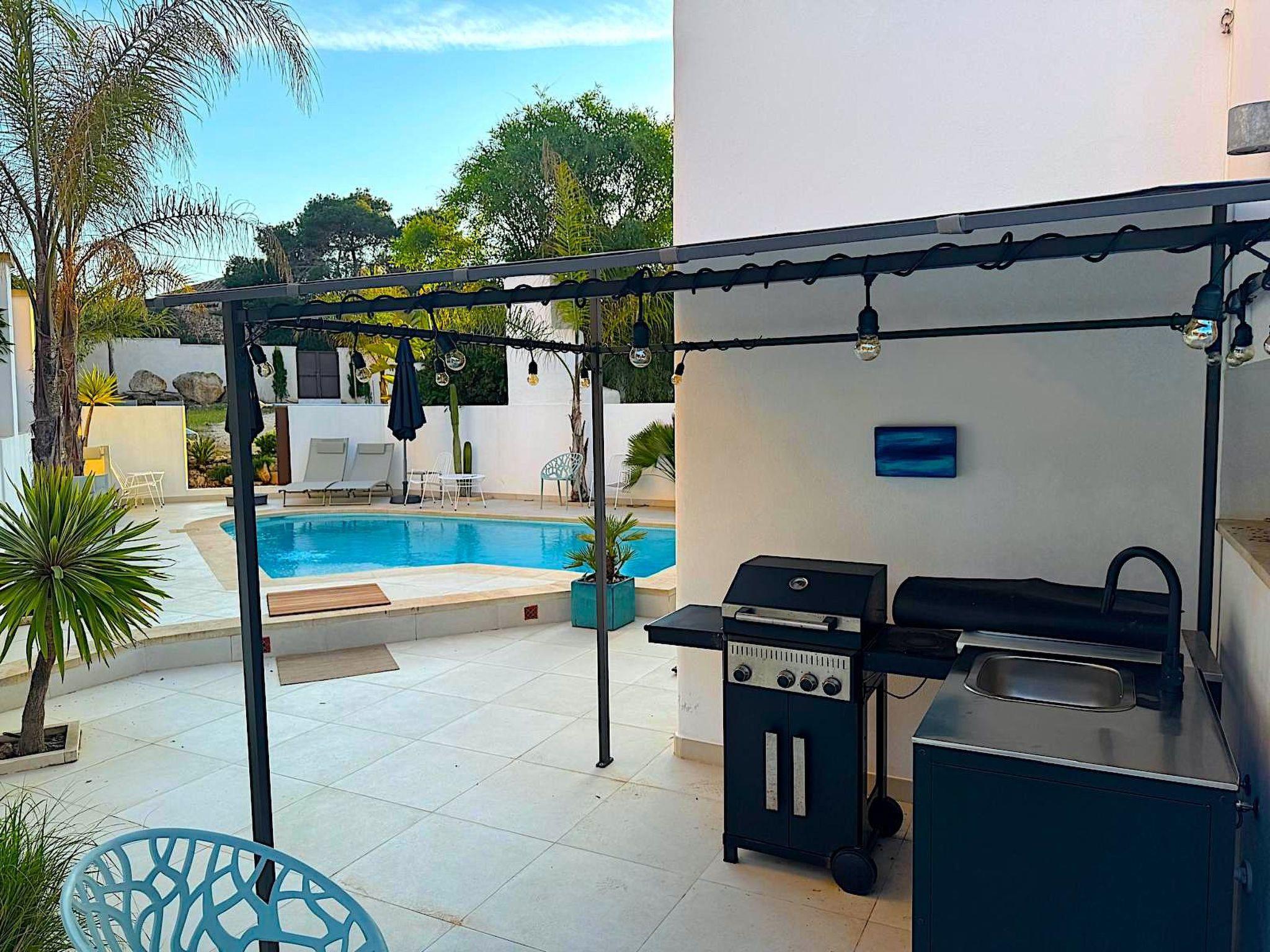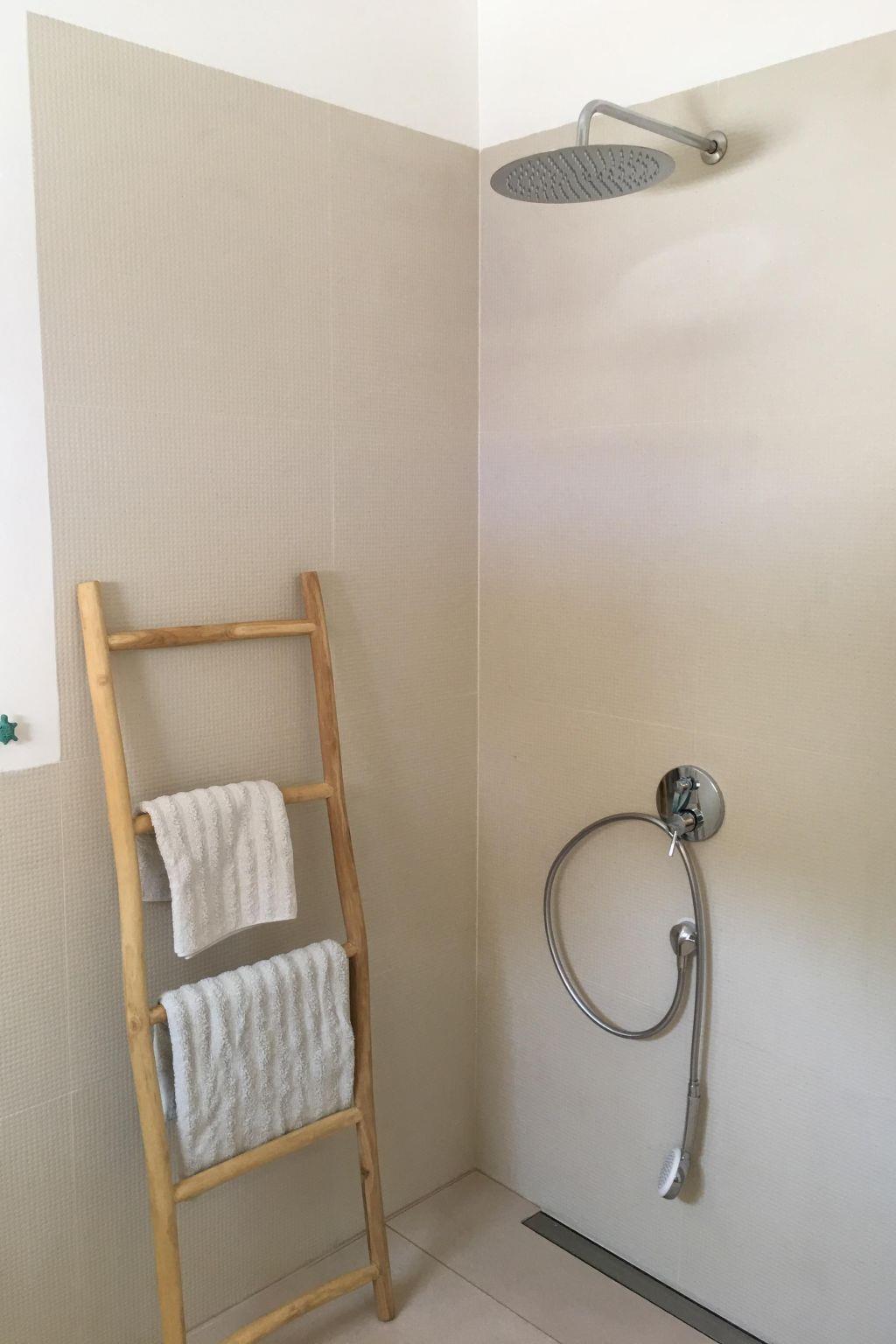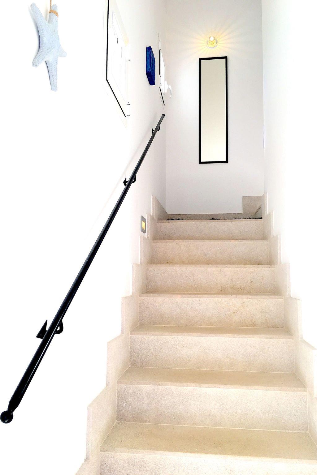 On the ground floor there is an open-plan living and dining area with an adjoining open-plan kitchen. A bedroom with safe and a bathroom are available on the ground floor. The second bathroom and the master bedroom with access to the terrace are located on the upper floor. Both the terrace and the bedroom offer fantastic views of the sea. An open staircase leads from the terrace to the roof terrace. From here you can see across the sea to Es Pontas and in the direction of Cala Santanyi. The terraces are equipped with sun loungers. All living rooms and bedrooms are air-conditioned. In the garden is the white-tiled pool 3.25 m x 7.5 m, up to 2.20 m deep and sun terraces, parasols and loungers. It takes on a turquoise colour during the day thanks to the light. In the evening with LED in any colour possible. A hatch opens up the kitchen to the patio and the outdoor barbecue, making it easy to open up the summer kitchen. There is a dining area with a large outdoor table. There is also a partial sea view from there.