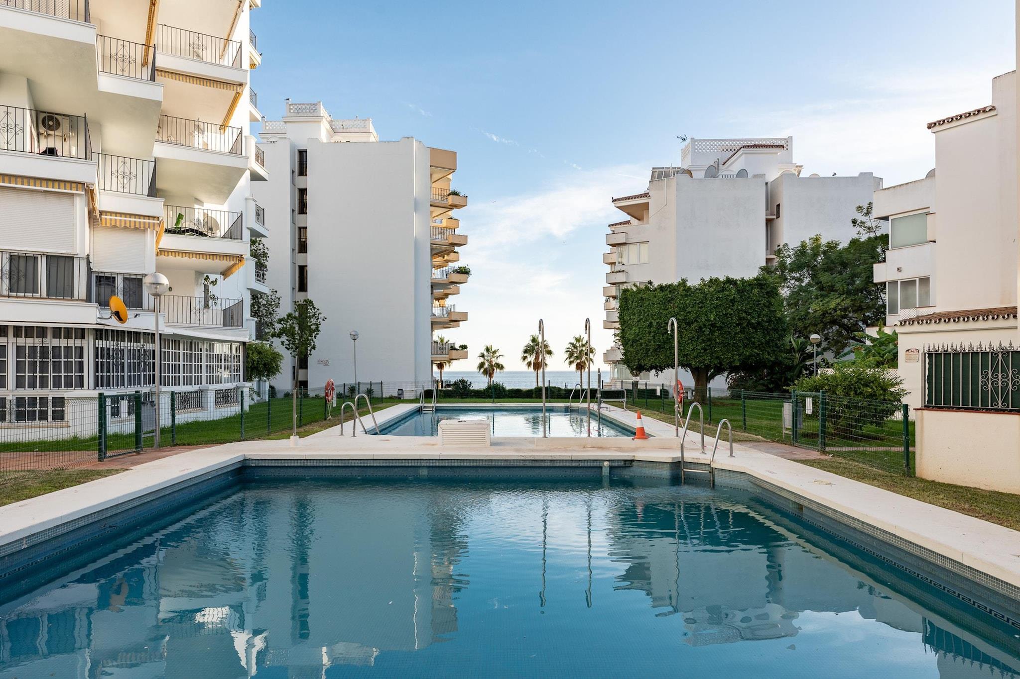 Velkommen til din drømmeferie i Marbella, hvor gyldne strande, havbrise og middelhavscharme møder moderne komfort. Beliggende i et eksklusivt strandkompleks med direkte adgang til sandet, er denne hyggelige lejlighed det perfekte fristed for en uforglemmelig Costa del Sol-ferie. Træd indenfor og føl dig hjemme i et lyst og indbydende rum designet til afslapning. Lejligheden har et komfortabelt soveværelse med en dobbeltseng, et elegant badeværelse med et forfriskende brusebad og et fuldt udstyret køkken, hvor du kan tilberede dine yndlingsmåltider. Den åbne stue og spisestue fører direkte til en privat terrasse, det perfekte sted at nyde morgenkaffen, nyde middage under åben himmel eller blot slappe af til lyden af bølgerne. Gæsterne kan også nyde den fælles swimmingpool omgivet af frodige haver, kun få skridt fra stranden. Marbella tilbyder den perfekte blanding af kystskønhed, levende kultur og lækker mad. Tilbring dine dage med at solbade på uberørte strande som Playa de la Fontanilla, Playa de Cabopino eller den glamourøse Playa de Puerto Banús. Gå en tur gennem Marbellas fortryllende gamle bydel, hvor hvidkalkede gader, blomstrende balkoner og den livlige Plaza de los Naranjos inviterer dig til at blive hængende. For eventyrlystne kan du prøve paddleboarding, sejle eller vandre på de naturskønne stier i Sierra Blanca. Golfentusiaster finder baner i verdensklasse i nærheden, mens shoppere og madelskere kan udforske de luksuriøse butikker og smarte restauranter i Puerto Banús. Uanset om du er her for at slappe af, udforske eller forkæle dig selv med den andalusiske livsstil, tilbyder denne lejlighed ved stranden alt, hvad du behøver for en perfekt Marbella-ferie - sol, hav, ro og løftet om uforglemmelige minder.