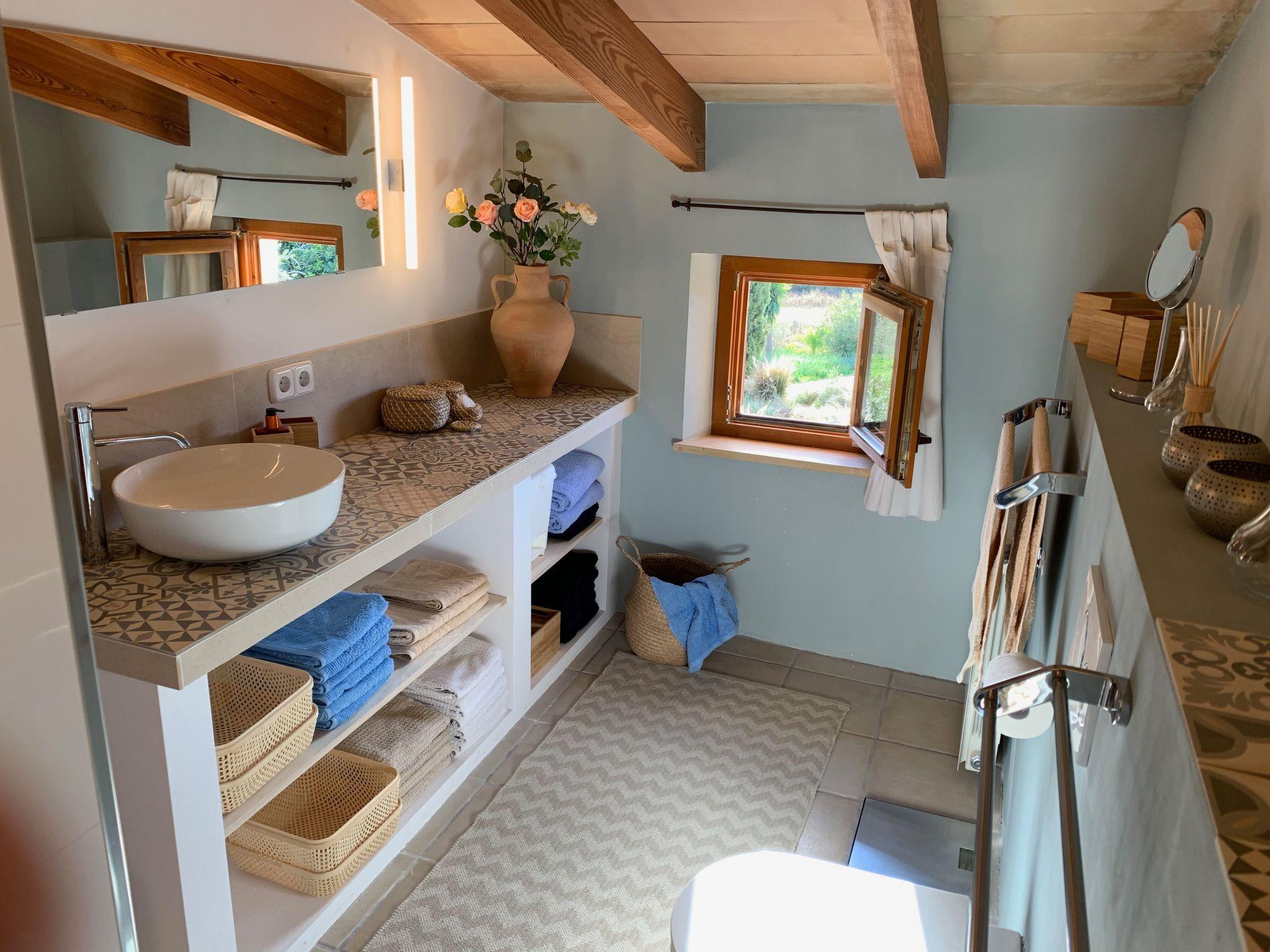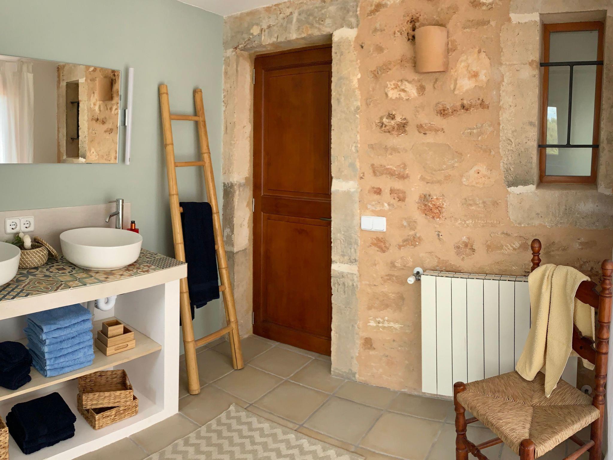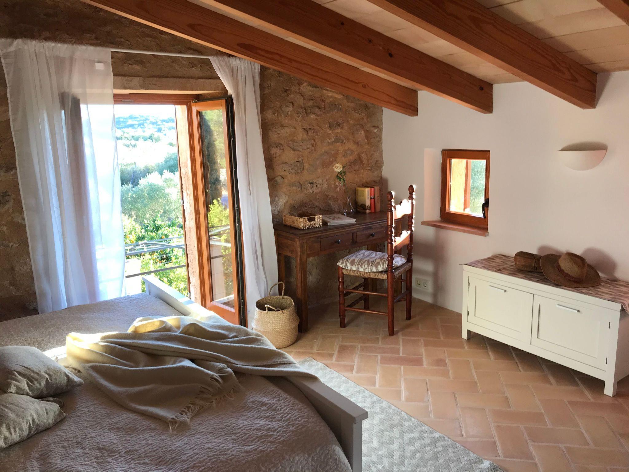 There is a large terrace right next to the house with direct access to the old Mallorcan orchard. From the terrace you enter the spacious kitchen and the generous living/dining area with fireplace. Also on the ground floor is a bedroom with a double bed, en suite bathroom and direct access to the terrace.