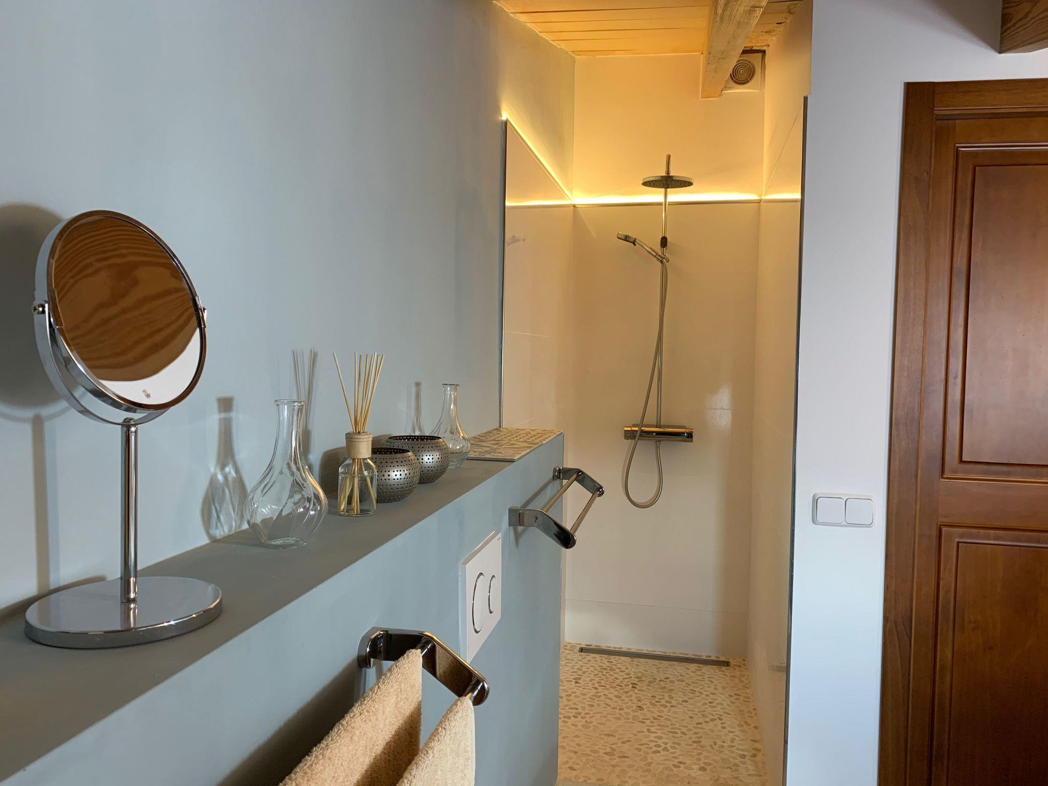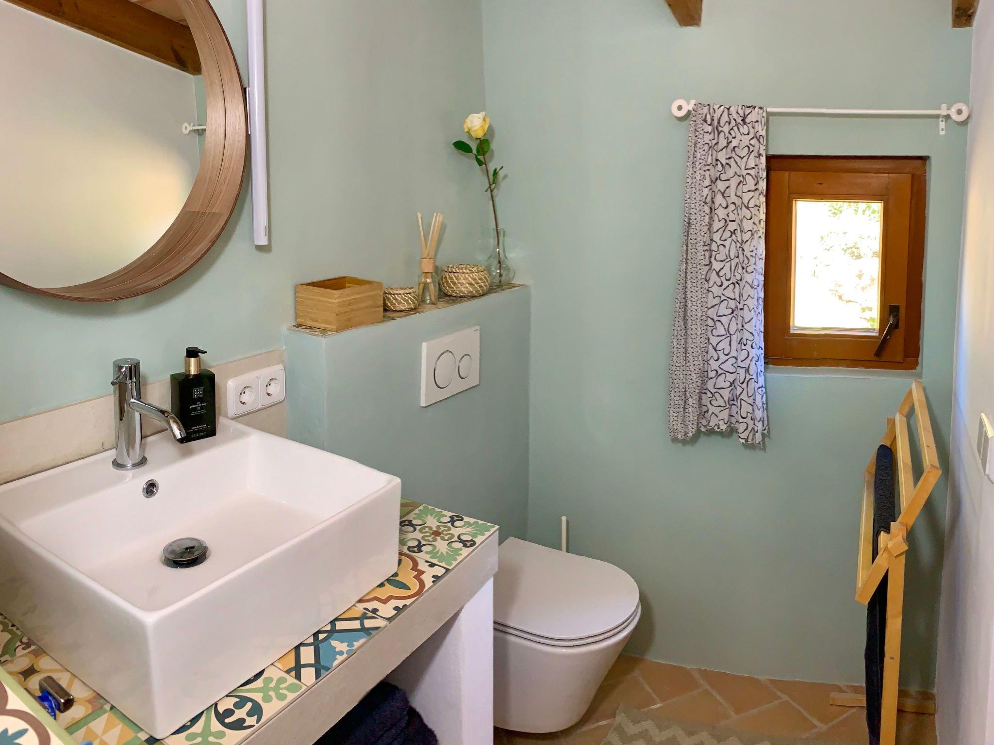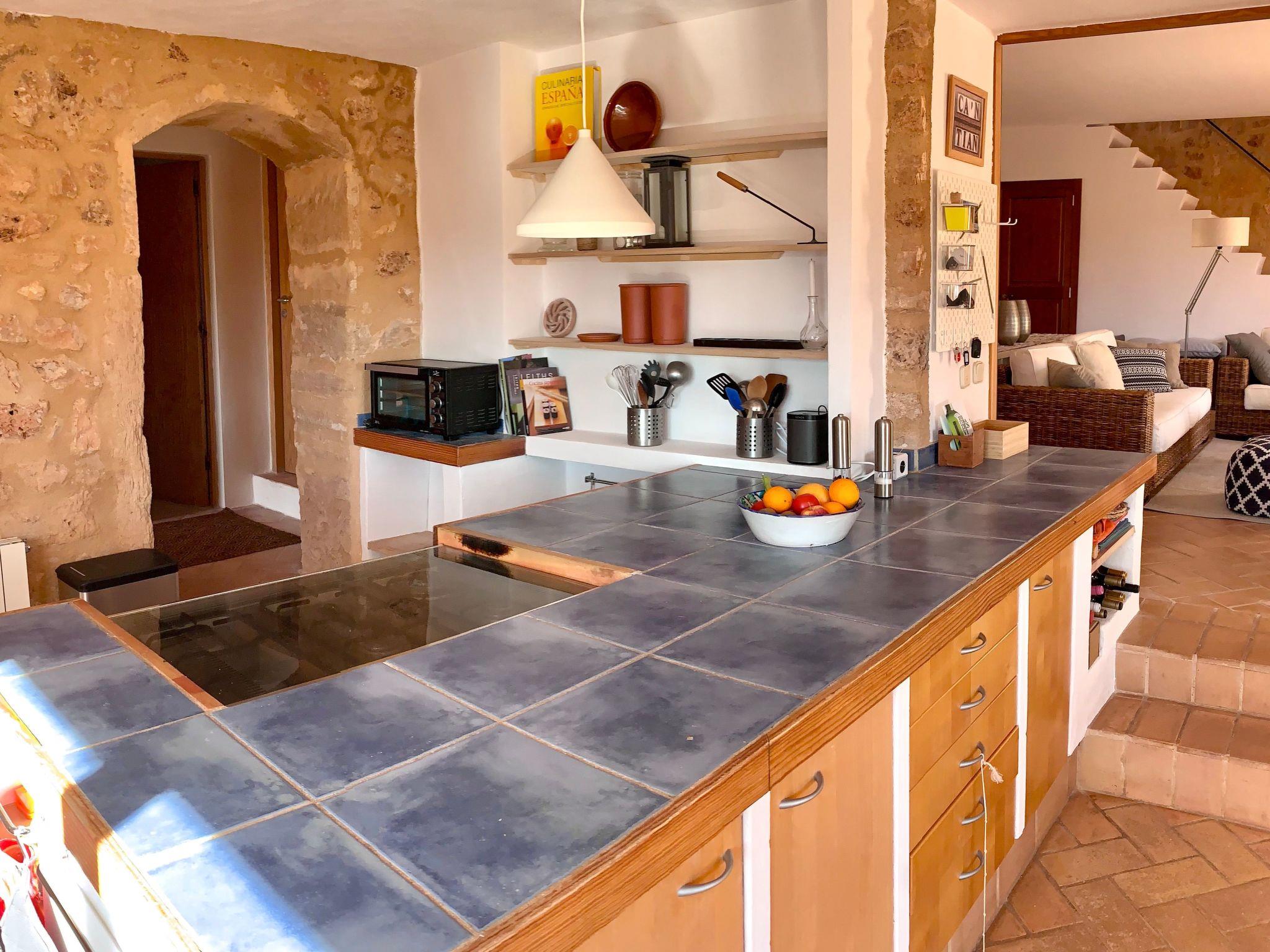 There is a large terrace right next to the house with direct access to the old Mallorcan orchard. From the terrace you enter the spacious kitchen and the generous living/dining area with fireplace. Also on the ground floor is a bedroom with a double bed, en suite bathroom and direct access to the terrace.