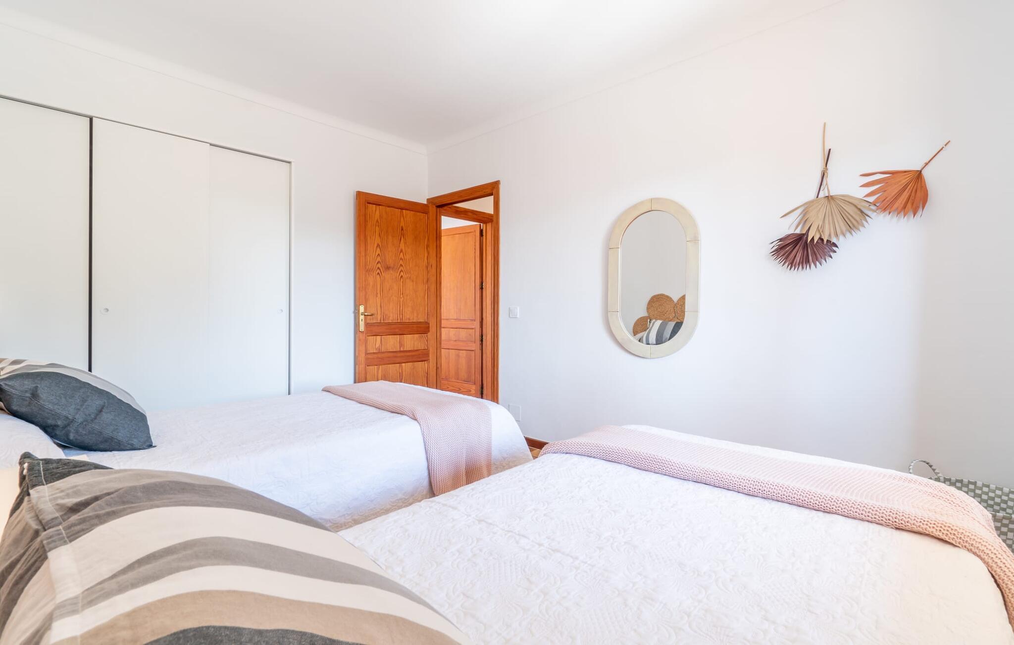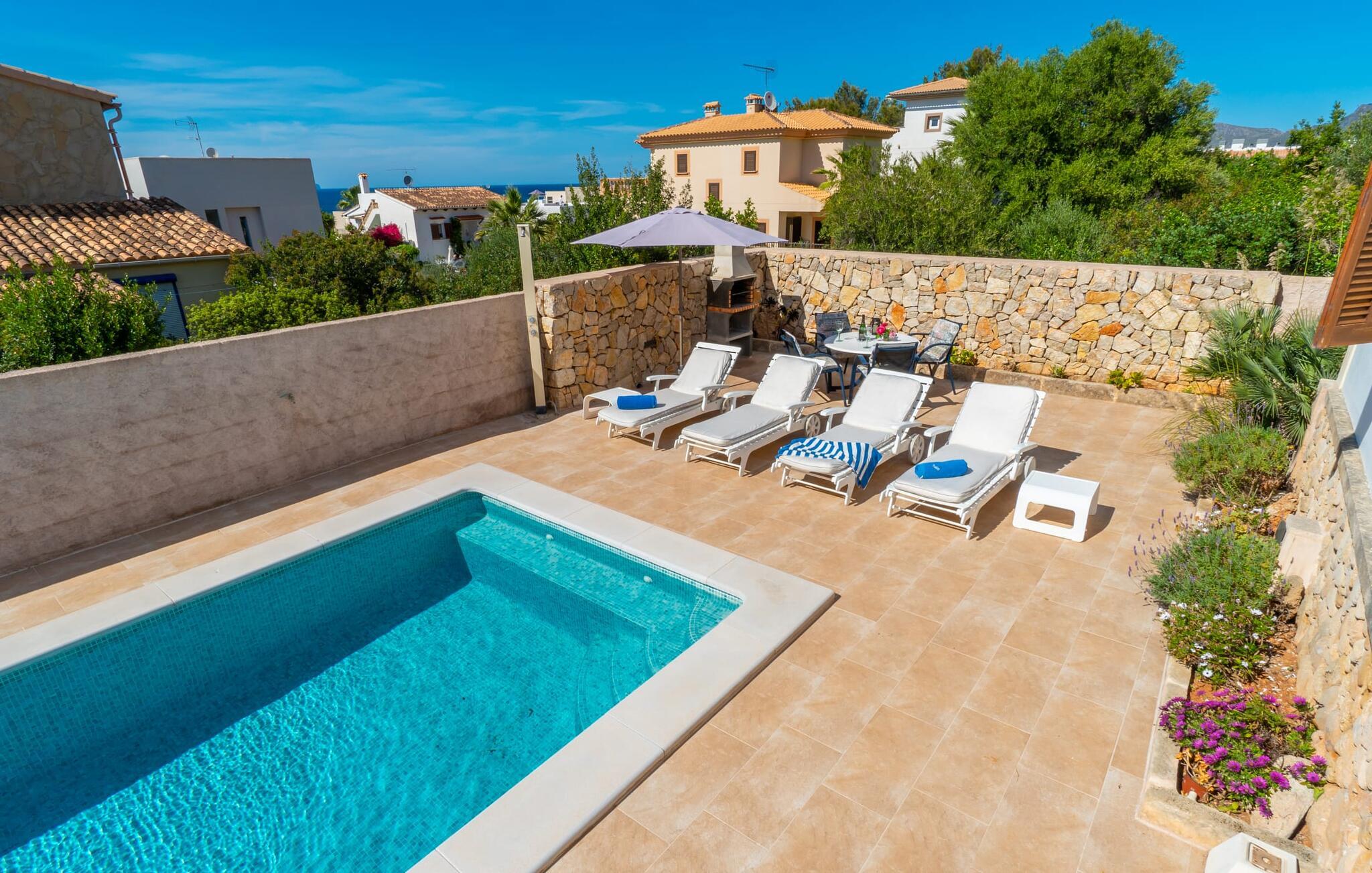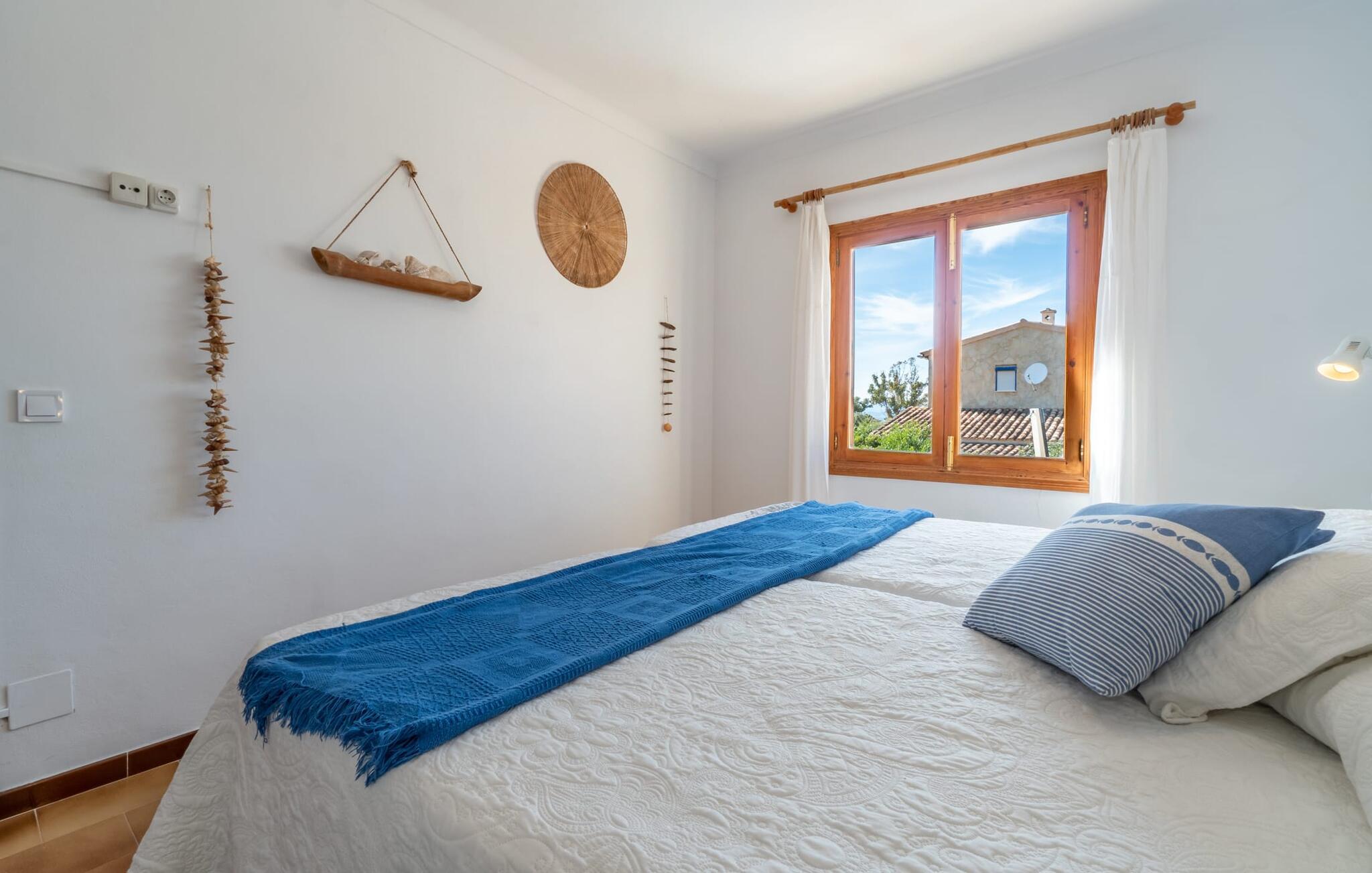 Hvad værdsætter I mest ved jeres ferievilla på Mallorca? Nærhed til stranden? Gode vandrestier i området? lange solbade? En rolig beliggenhed? Dejlige restauranter ved havet i gåafstand? Hvis I ikke vil gå glip af alt dette, kan villaen "Mar i Cel" være lige noget for jer. Den mindste af de to overdækkede terrasser ved indgangen giver en forsmag på den hygge, der venter jer i jeres sommerhus. Den større veranda er vært for et indbydende udendørs spiseområde til lange stearinlys sessioner langt ud i de varme sommernætter. Det nærliggende poolområde ligger i læ for vinden, så I kan få jeres måltider her lige ved siden af grillen. Har I brug for at være endnu tættere på solen? I skal blot gå op ad udvendige trapper til den perfekt placerede tagterrasse på jeres ferievilla. Den vidunderlige udsigt over havet er gratis her! Stueetagens opholdsstue er godt opdelt og har en skøn opholds- og spisestue. Det er udstyret med pejs og aircondition. Vinduerne byder på en vidunderlig udsigt over haven og de nærliggende foden af Ferrutx - et smukt sted at vandre. Både stuen og det tilstødende køkken har direkte adgang til den rummelige veranda. Et af de tre soveværelser har eget badeværelse en suite. De to andre soveområder deler et separat badeværelse med badekar. Villaen "Mar i Cel" er en del af boligområdet Colònia de Sant Pere på Mallorcas østkyst. Marinaen, små supermarkeder og restauranter er inden for nem gåafstand. Den lange naturlige strand Colònia de Sant Pere ligger kun 6 minutters kørsel fra feriehuset. Den smukke by Artà kan nås på 15 minutter i bil. Bemærk venligst, at denne ejendom ikke accepterer ungdomsgrupper eller polterabender. En ungdomsgruppe på denne ejendom består af personer under 30 år. Book ikke denne ejendom, hvis I er en ungdomsgruppe eller en polterabendgruppe, da jeres reservation vil blive afvist, når den er booket, hvilket også kan være tilfældet ved ankomst til ejendommen eller under jeres ophold, og I vil ikke modtage en refusion.