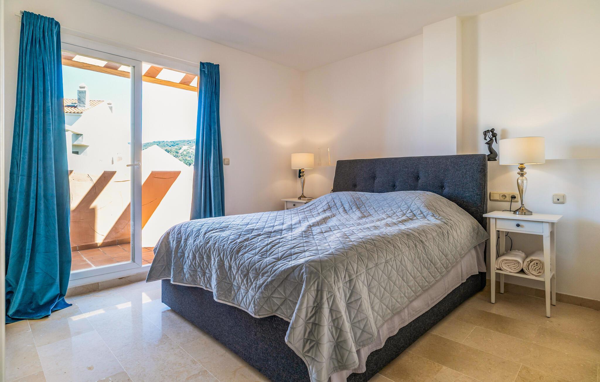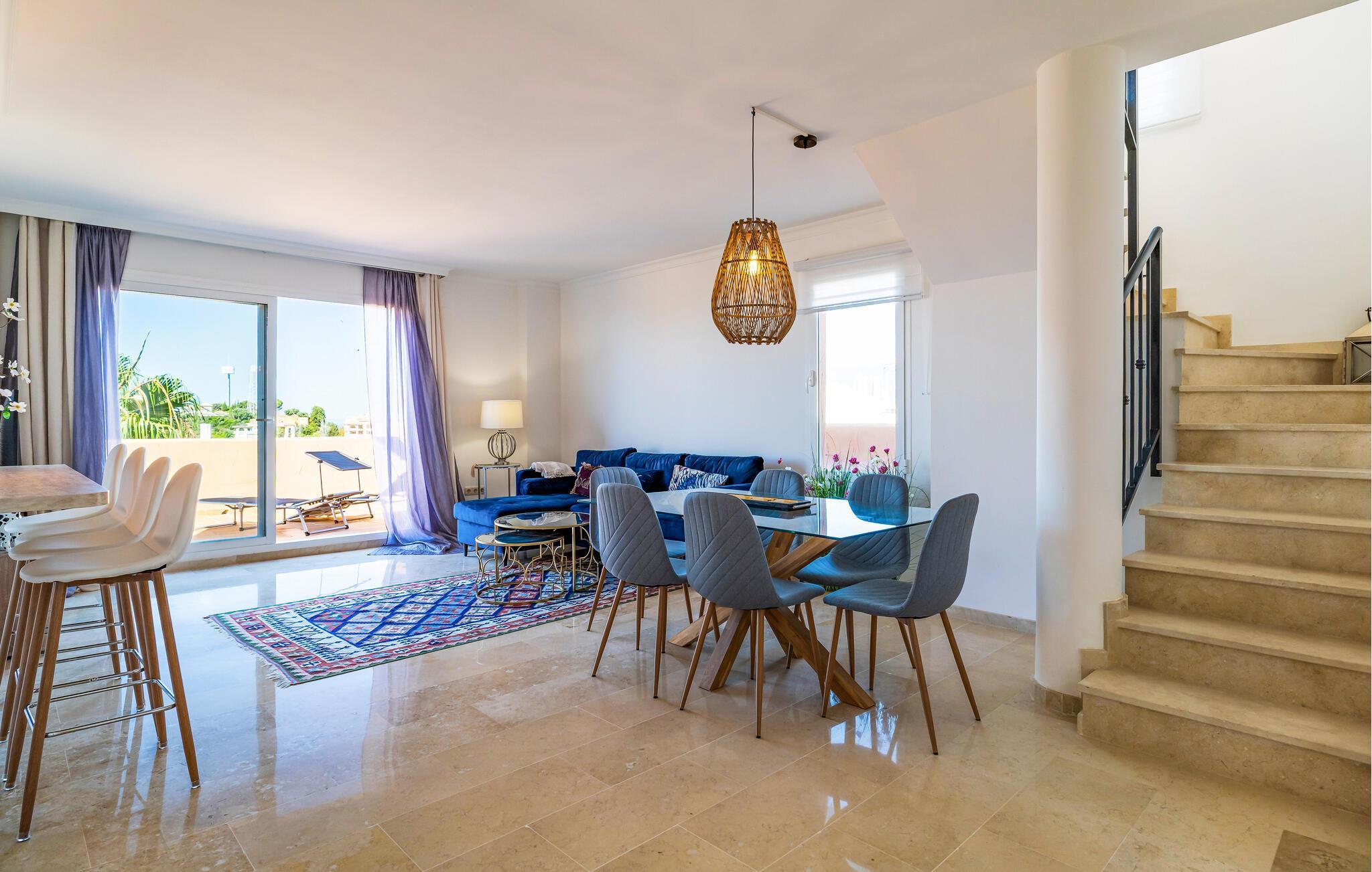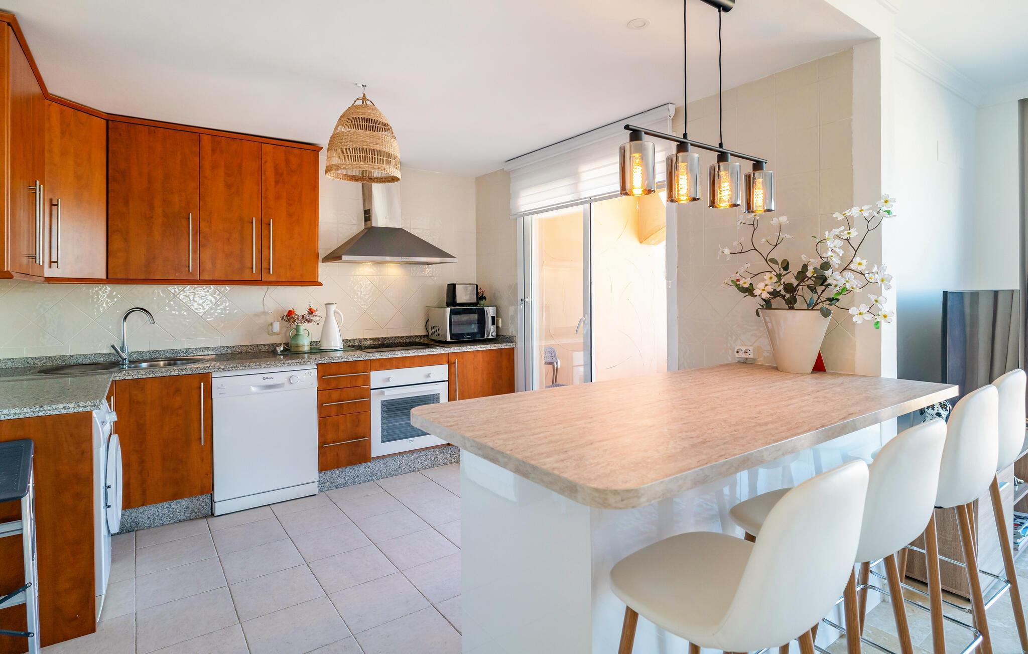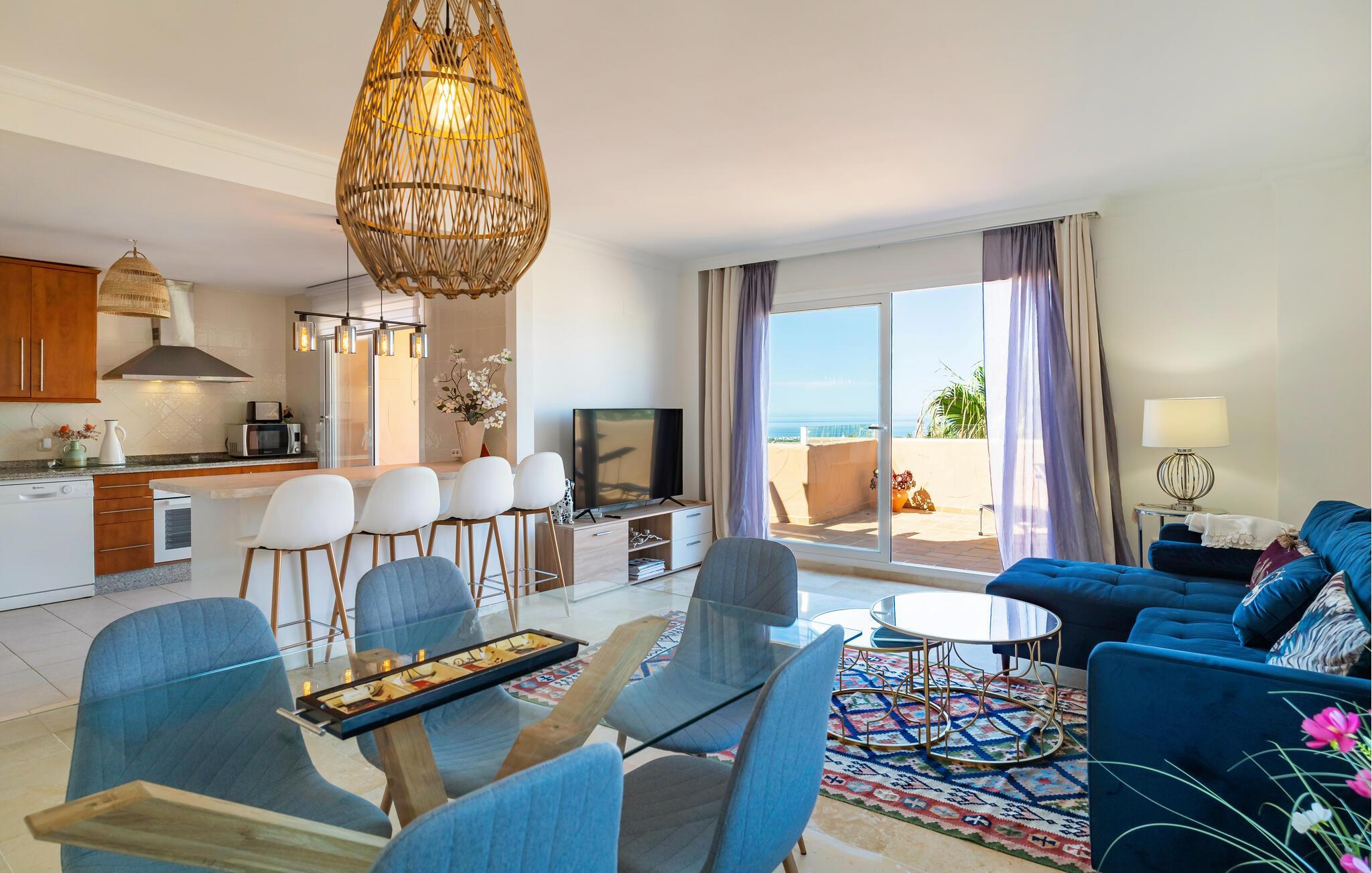 Velkommen til denne stilfulde ferielejlighed, hvor I kan slappe af og koble fra med familien. Tilbered lækre tapas i det åbne køkken og nyd den elegante atmosfære i den smagfulde opholdsstue. Efter en lang dag i solen inviterer den komfortable sofa jer til hyggelige filmaftener og en afslappende læseoplevelse.