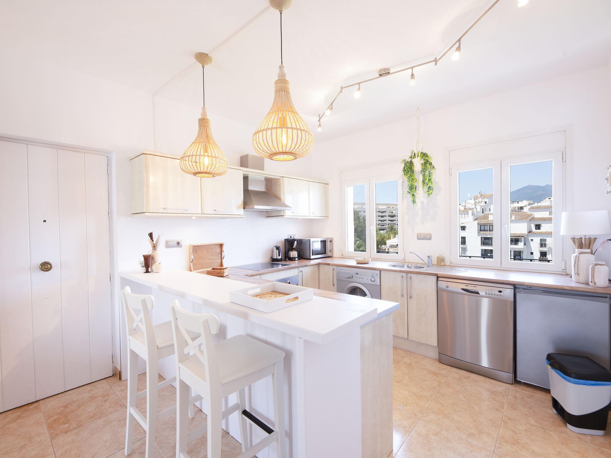 "Puerto Banus OPQ", 3-room apartment 115 m2 on 5th floor. Beautiful and stylish furnishings: living/dining room with digital TV. Exit to the loggia. 1 room with 1 french bed (160 cm, length 200 cm). 1 room with 1 french bed (180 cm, length 200 cm). Open kitchen (oven, dishwasher, 4 ceramic glass hob hotplates, toaster, kettle, microwave, freezer, electric coffee machine). Bath/WC, shower/WC. Air-conditioning, forced-air heating. Terrace roofed. Terrace furniture. View of the sea and the port. Facilities: washing machine, iron, children's high chair, hair dryer. Internet (WiFi, free). VUT/MA32059 // Reg. Nr.: ESFCTU00002904100041964000000000000000000VUT/MA320593