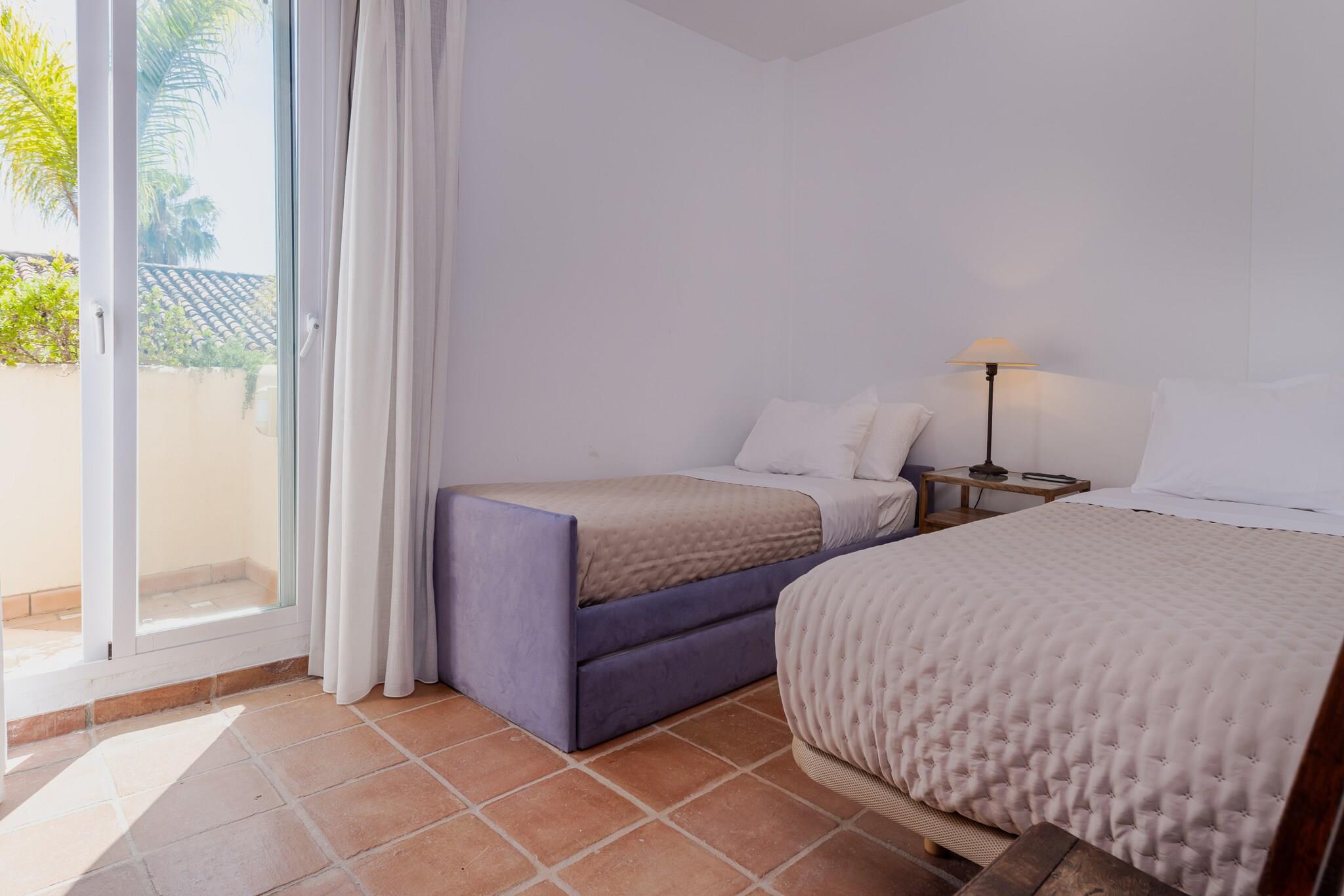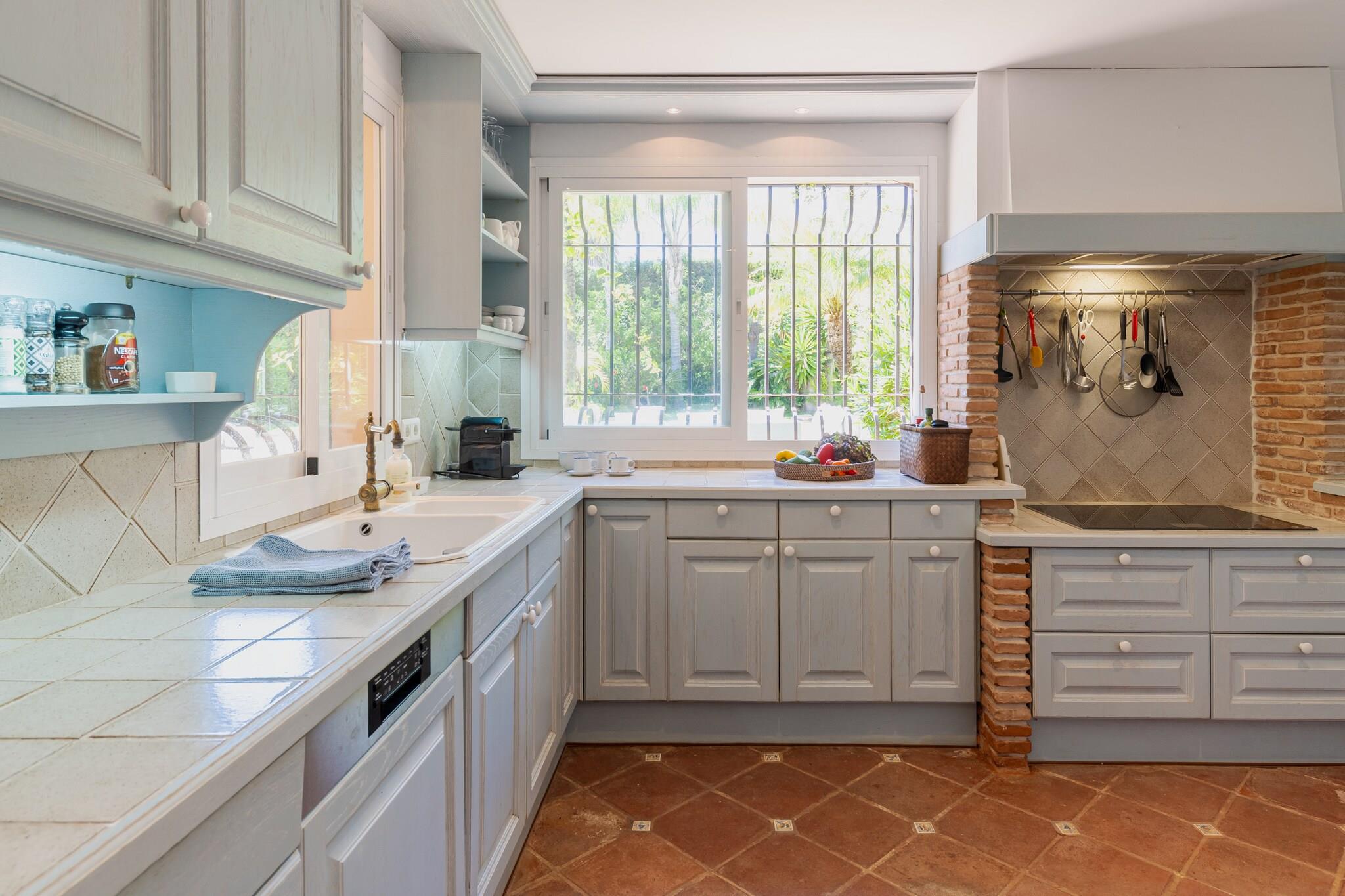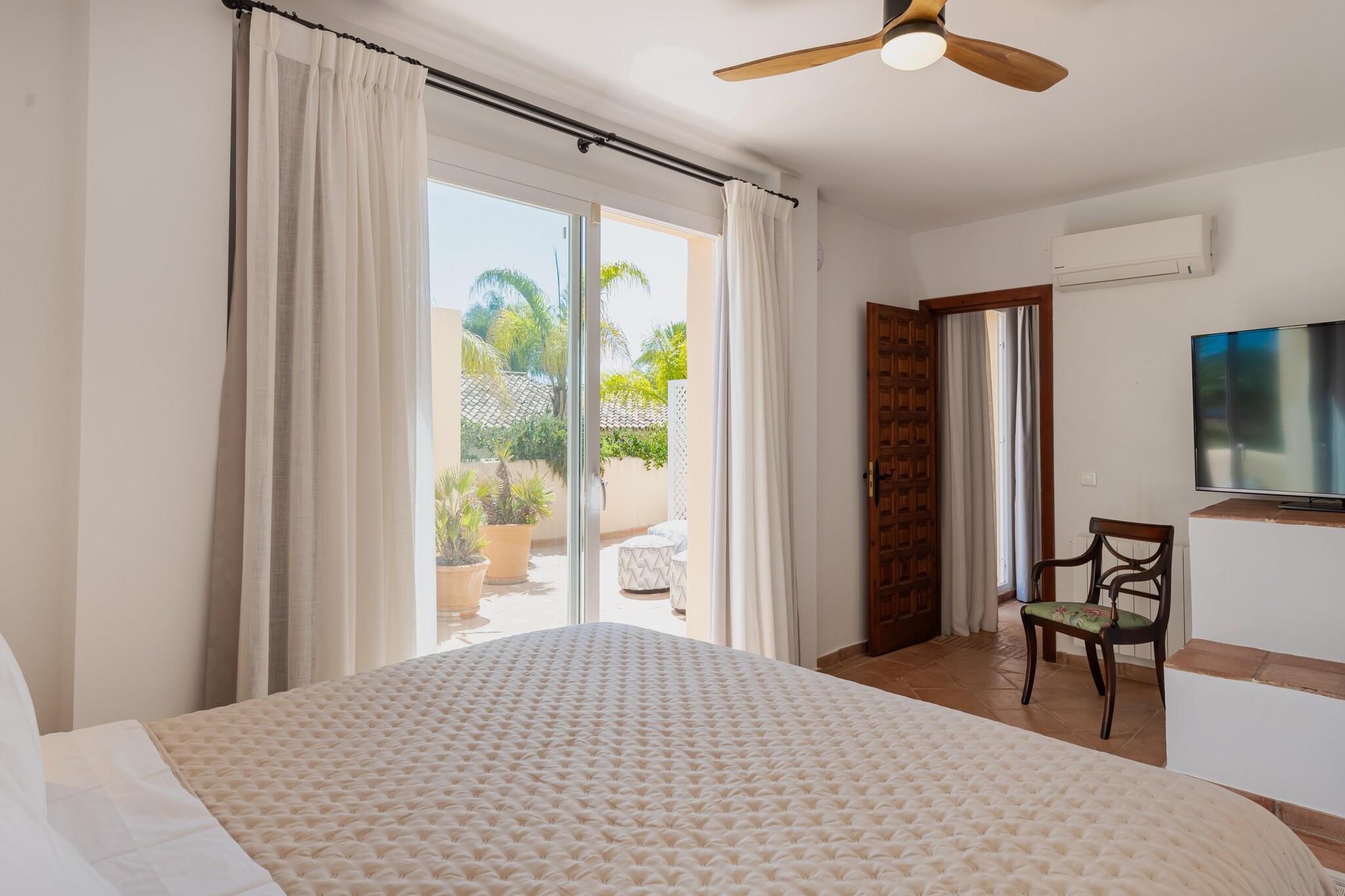 Træd ind i klassisk andalusisk charme i denne elegante villa beliggende i det eftertragtede Los Monteros-område i Marbella. Kun få minutter fra stranden og det berømte La Cabane Beach Resort tilbyder villaen en afslappet, men stilfuld beliggenhed tæt på Marbellas centrum, restauranter, butikker og fritidsfaciliteter langs Costa del Sol. Indvendigt har villaen plads til op til ni gæster fordelt på fem soveværelser. Stueetagen har et soveværelse med dobbeltseng og eget badeværelse. Ovenpå finder du to soveværelser med dobbeltsenge og moderne badeværelser, et soveværelse med to enkeltsenge og et ekstra soveværelse med en enkeltseng, der deler et funktionelt badeværelse. Stue- og spiseområdet nedenunder byder på komfortable siddepladser, et tv og et spisebord til fælles måltider. Et veludstyret køkken gør det nemt at lave mad hver dag, mens WiFi, aircondition, varme, vaskemaskine og tørretumbler gør opholdet endnu mere bekvemt. Udenfor åbner villaen ud mod en rummelig terrasse, der fører til en privat have designet til afslappet middelhavsliv. Den private swimmingpool og de omkringliggende liggestole skaber et indbydende rum til solrige eftermiddage, mens udendørs sidde- og spiseområder giver gæsterne mulighed for at nyde måltider eller aften drinks i det varme klima i Marbella. Der er parkering til rådighed på ejendommen. Los Monteros er et af Marbellas mest eftertragtede boligområder, kendt for sine smukke strande og afslappede atmosfære. Villaen ligger kun en kort køretur fra Marbellas livlige gamle bydel, strandklubber og golfbaner, hvilket gør den til et fremragende udgangspunkt for at udforske Costa del Sol.