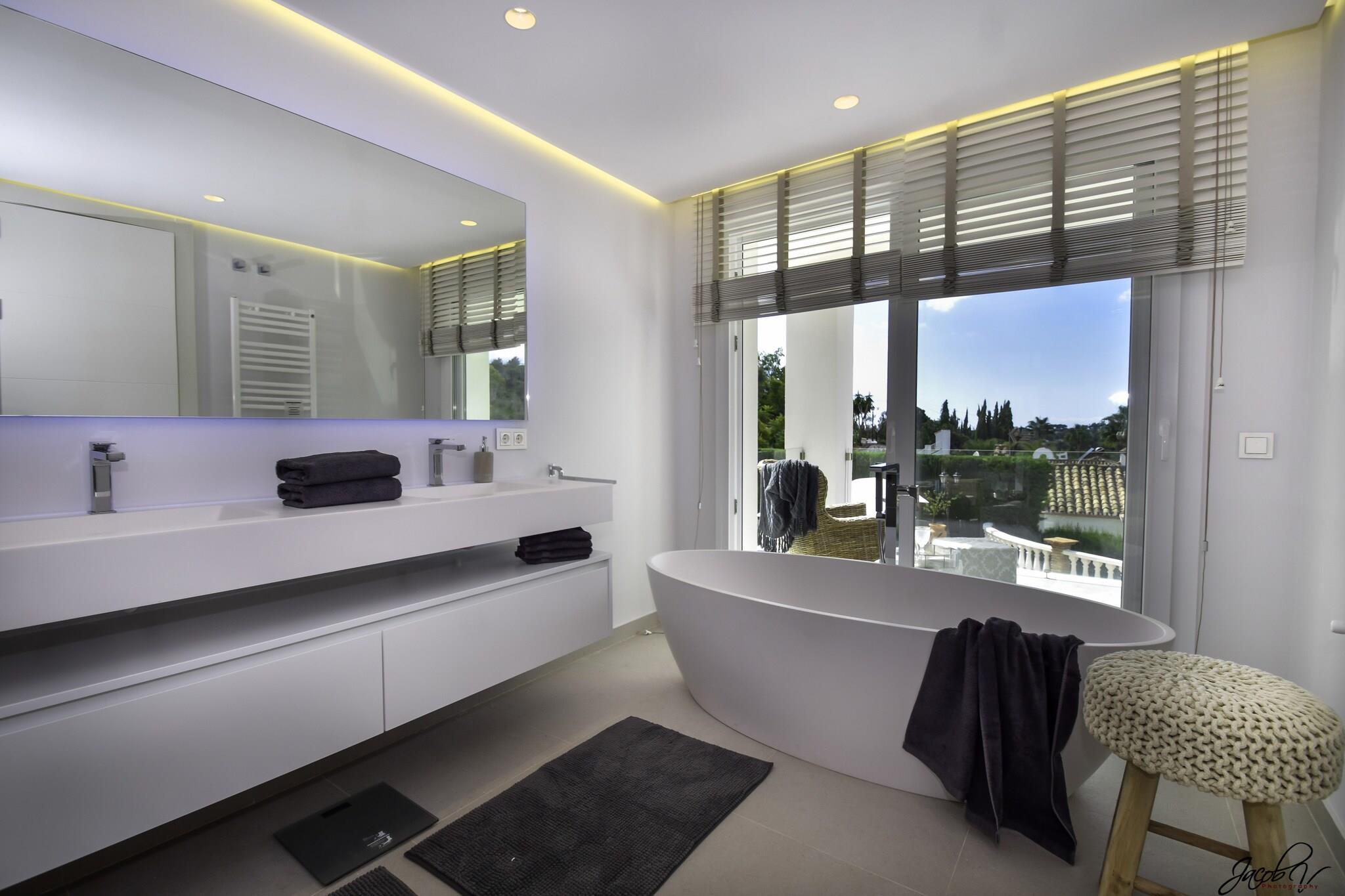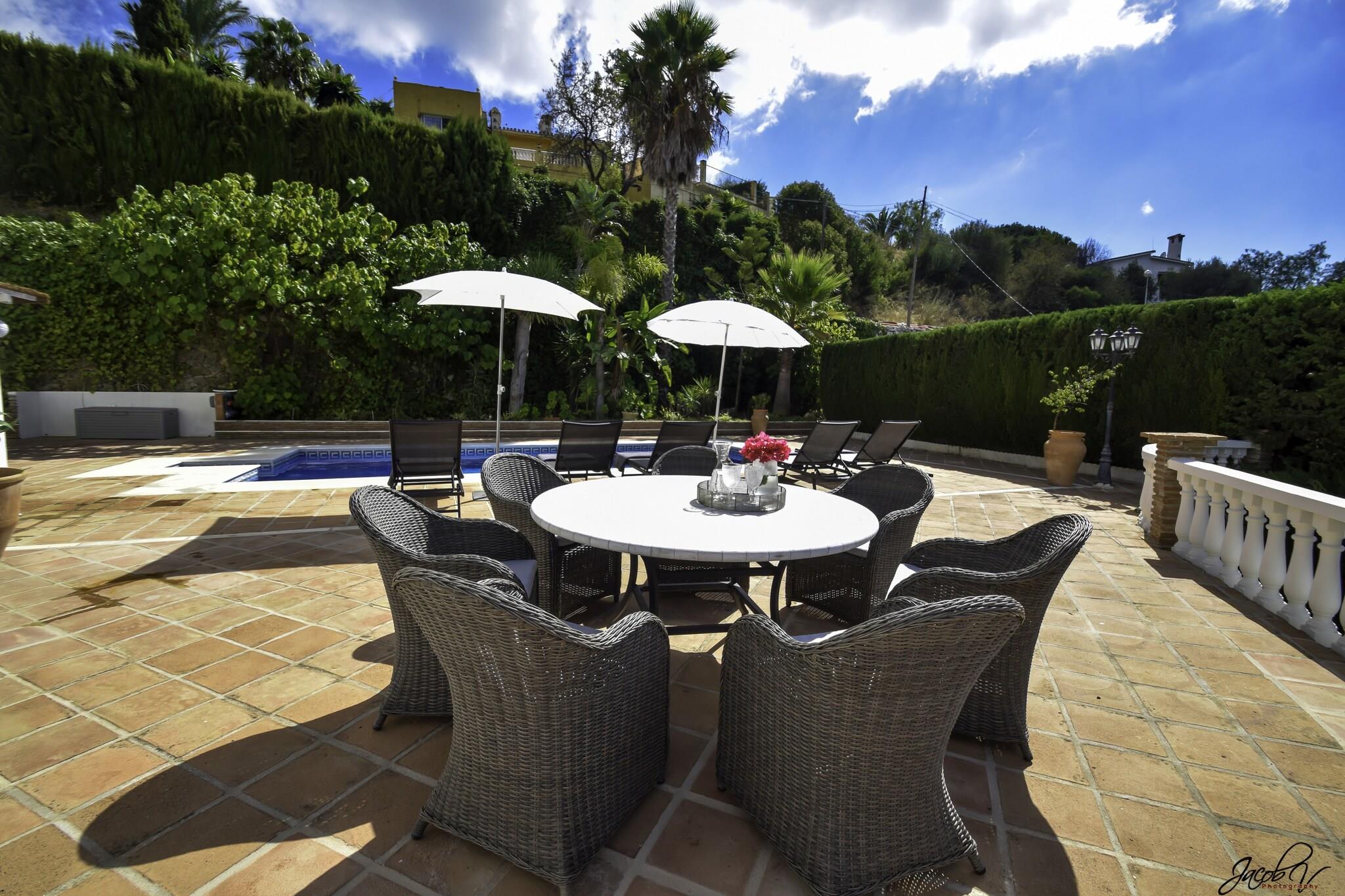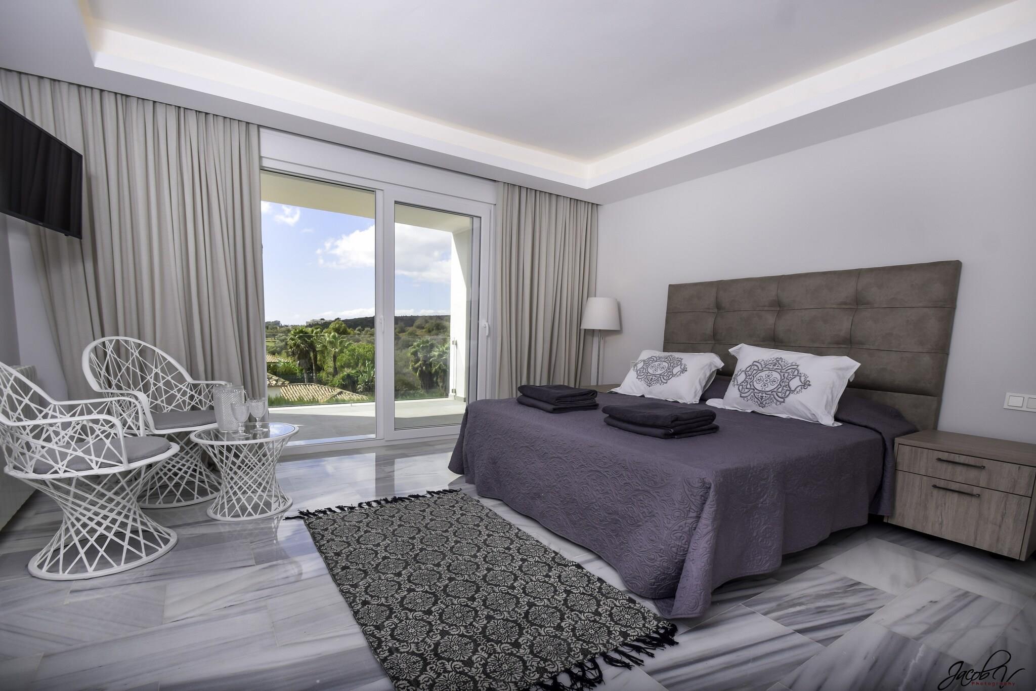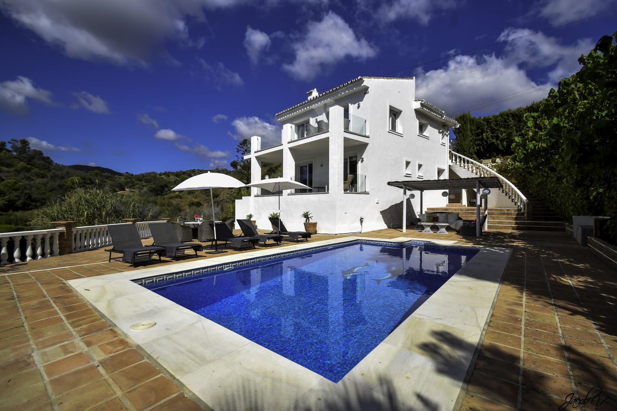 Beliggende i et fredeligt boligområde kun en kort køretur fra Marbellas kystlinje tilbyder denne stilfulde villa et indbydende fristed for op til otte gæster, der ønsker at kombinere livet ved kysten med privat afslapning på Spaniens Costa del Sol. Med moderne interiør, flere terrasser og malerisk havudsigt er det et fremragende valg for familier eller grupper, der søger en rolig base tæt på strande, golf, spisesteder og kulturelle attraktioner. Indvendigt har villaen fire velindrettede soveværelser, der er indrettet til fleksible gruppeophold. Den sydvendte master-suite har en dobbeltseng, eget badeværelse og adgang til altan, mens de øvrige soveværelser er indrettet med en blanding af dobbeltsenge og enkeltsenge, der passer til familier og venner, der rejser sammen. To ekstra badeværelser med toiletter gør hverdagen nemmere, og det fuldt udstyrede køkken gør madlavningen nem under hele opholdet. Der er vaskemaskine og tørretumbler til rådighed ved længere ophold, og højhastigheds-WiFi sikrer, at du kan holde kontakten indendørs. Aircondition og gulvvarme sikrer komfort året rundt. Udenfor finder du en privat opvarmet swimmingpool omgivet af liggestole og anlagte haver – et ideelt sted til afslapning, samvær og til at nyde Middelhavssolen. Flere terrasser, herunder et overdækket udendørs spiseområde og en grill ved poolen, indbyder til måltider i det fri og sammenkomster ved solnedgang, mens panoramaudsigten over havet tilbyder en fredfyldt kulisse til dine dage. Beliggende inden for køreafstand af Marbellas gamle bydel, strande, strandklubber og naturskønne kystvandringer, giver denne rolige villa året rundt adgang til solbeskinnede kyster, golfbaner og alt, hvad Costa del Sol har at byde på.