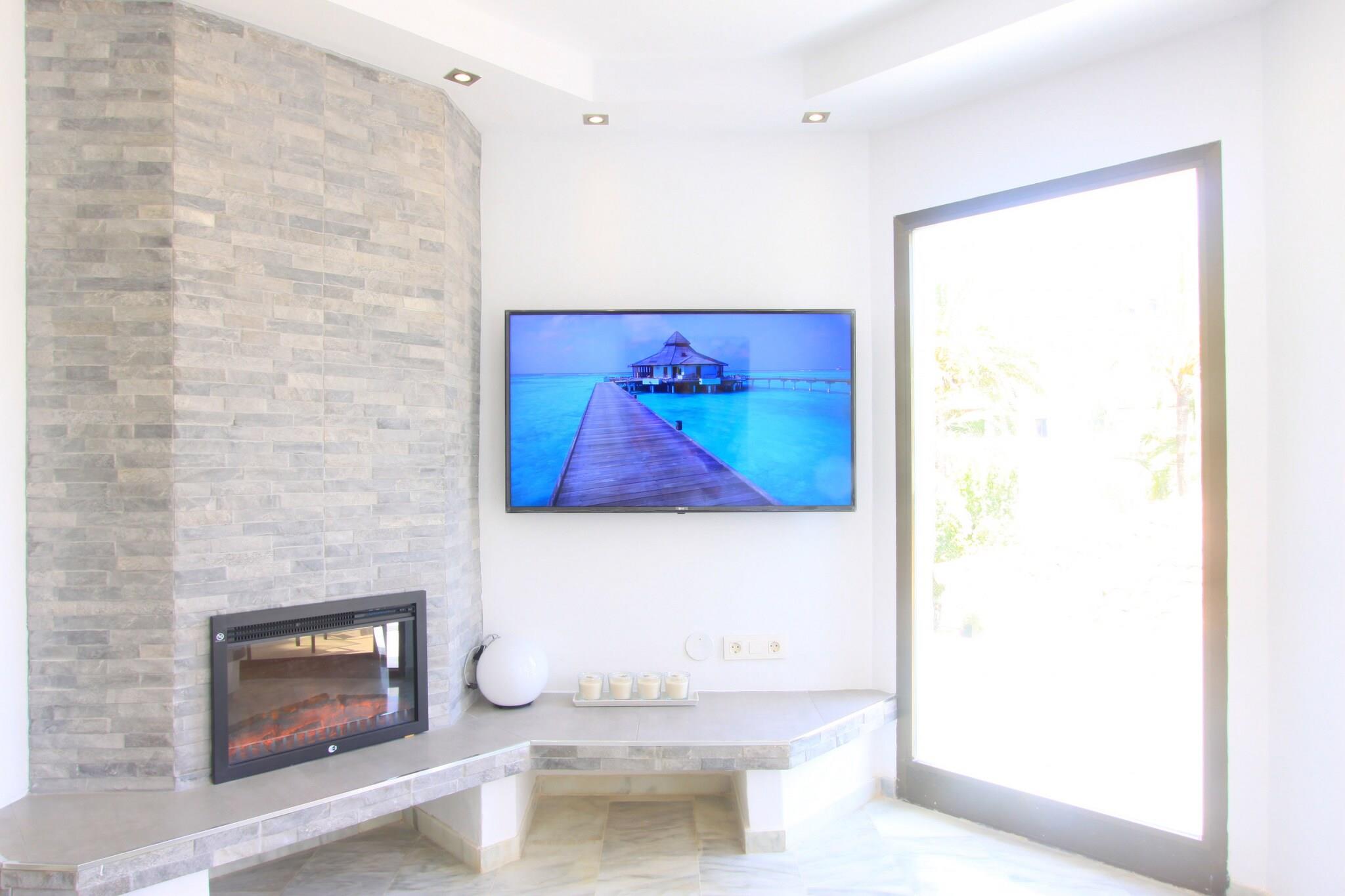På 1. etage: (åbent køkken(kogeplade(induktion), elkedel, brødrister, kaffemaskine, mikrobølgeovn, opvaskemaskine , køle-fryseskab, , ), stue / spisestue(Fjernsyn(fladskærm), spisebord, pejs, sofahjørne), soveværelse(dobbeltseng, dobbeltsovesofa), soveværelse(king size-seng), badeværelse(badekar, håndvask, toilet, føntørrer), badeværelse(bruser, håndvask, toilet)) På 2. etage: (åbent køkken(elkedel, brødrister, kaffemaskine, mikrobølgeovn, opvaskemaskine , køle-fryseskab, , ), stue / spisestue(Fjernsyn(fladskærm), spisebord, sofahjørne, DVD-afspiller), soveværelse(dobbeltseng, dobbeltsovesofa), soveværelse(enkeltseng, enkeltseng), badeværelse(badekar, håndvask, toilet, føntørrer), badeværelse(bruser, håndvask, toilet)) fitnessrum, Internetadgang, Børne swimmingpool, Havemøbler, fryser, tørretumbler, tremmeseng, vaskemaskine, varme, klimaanlæg, terrasse, have, parkering, swimmingpool(deles med andre gæster), barnestol, strygejern, Alarm