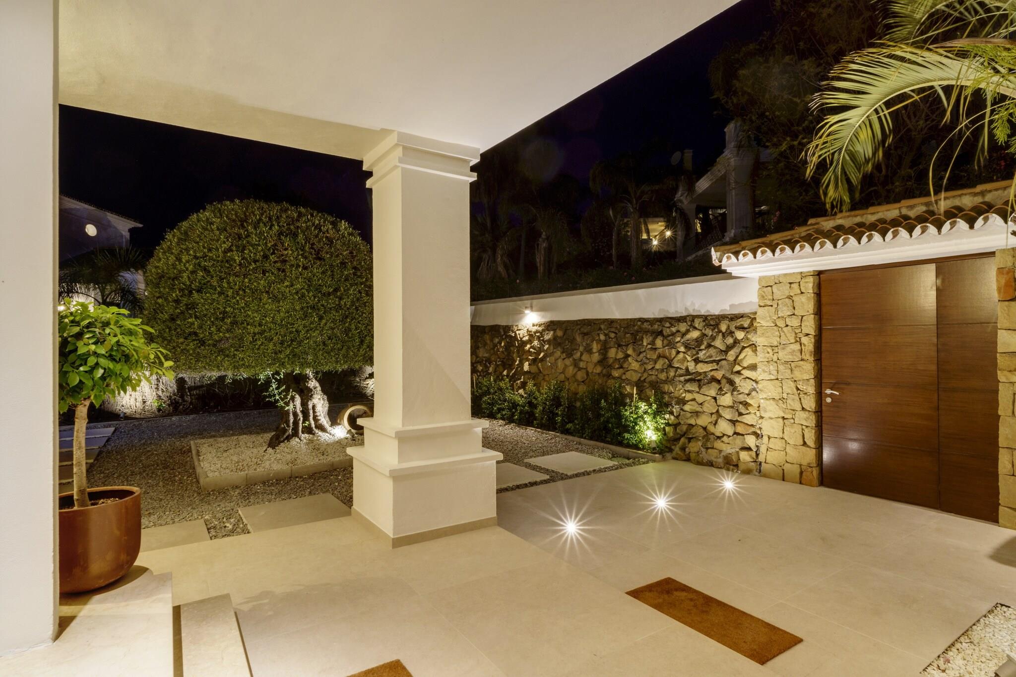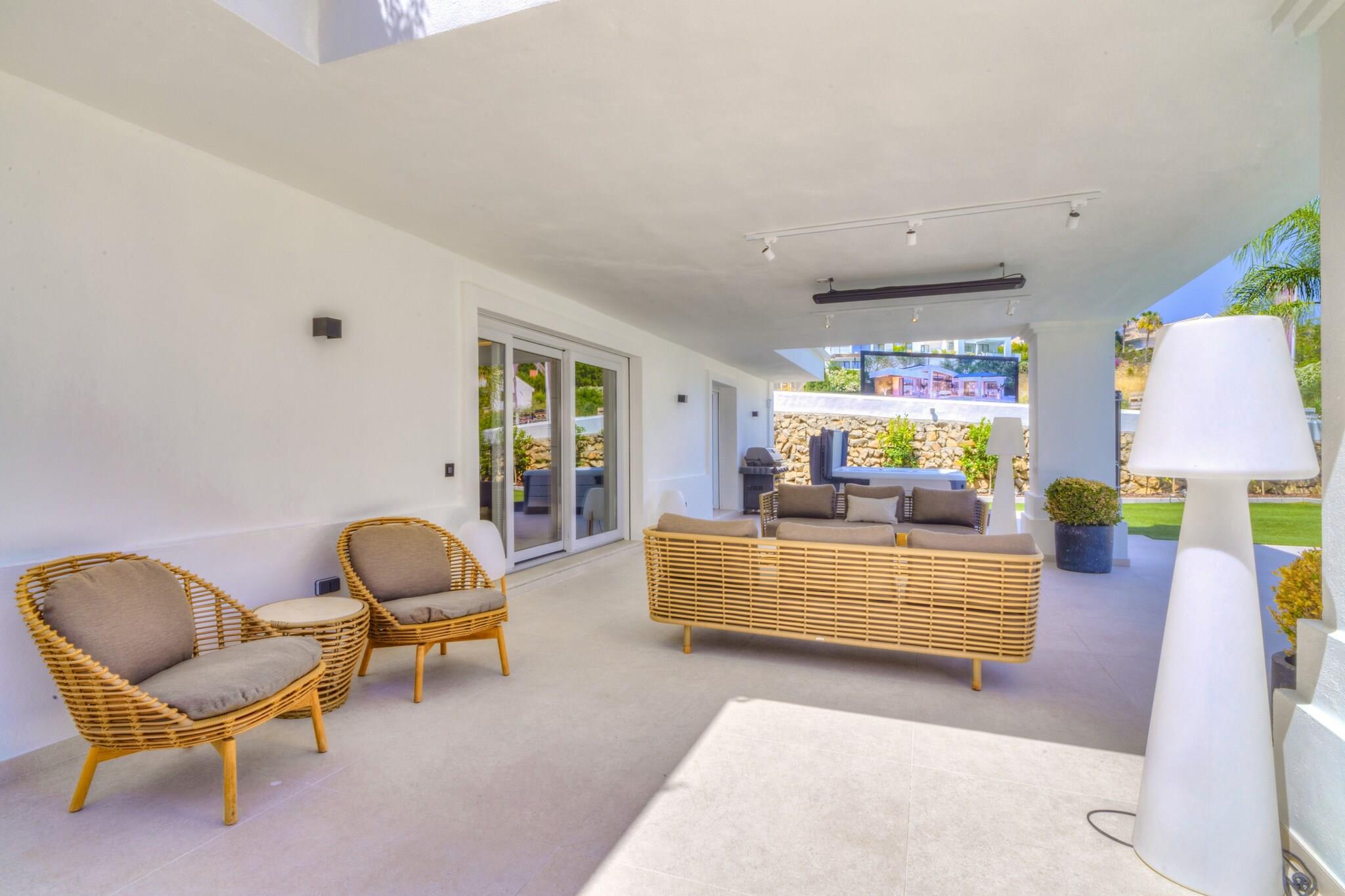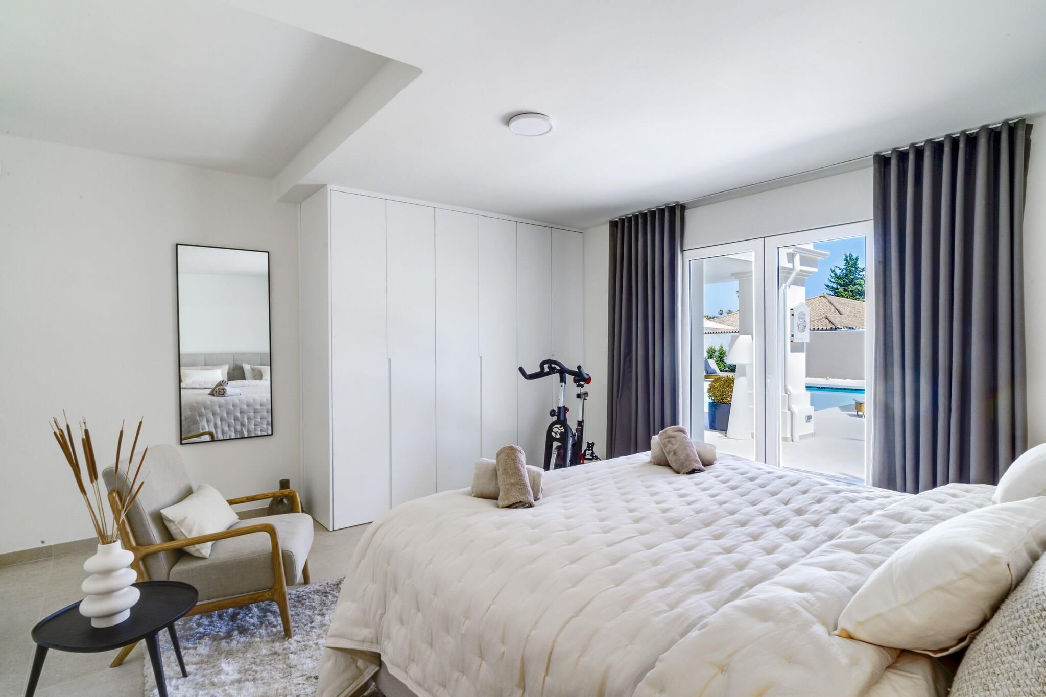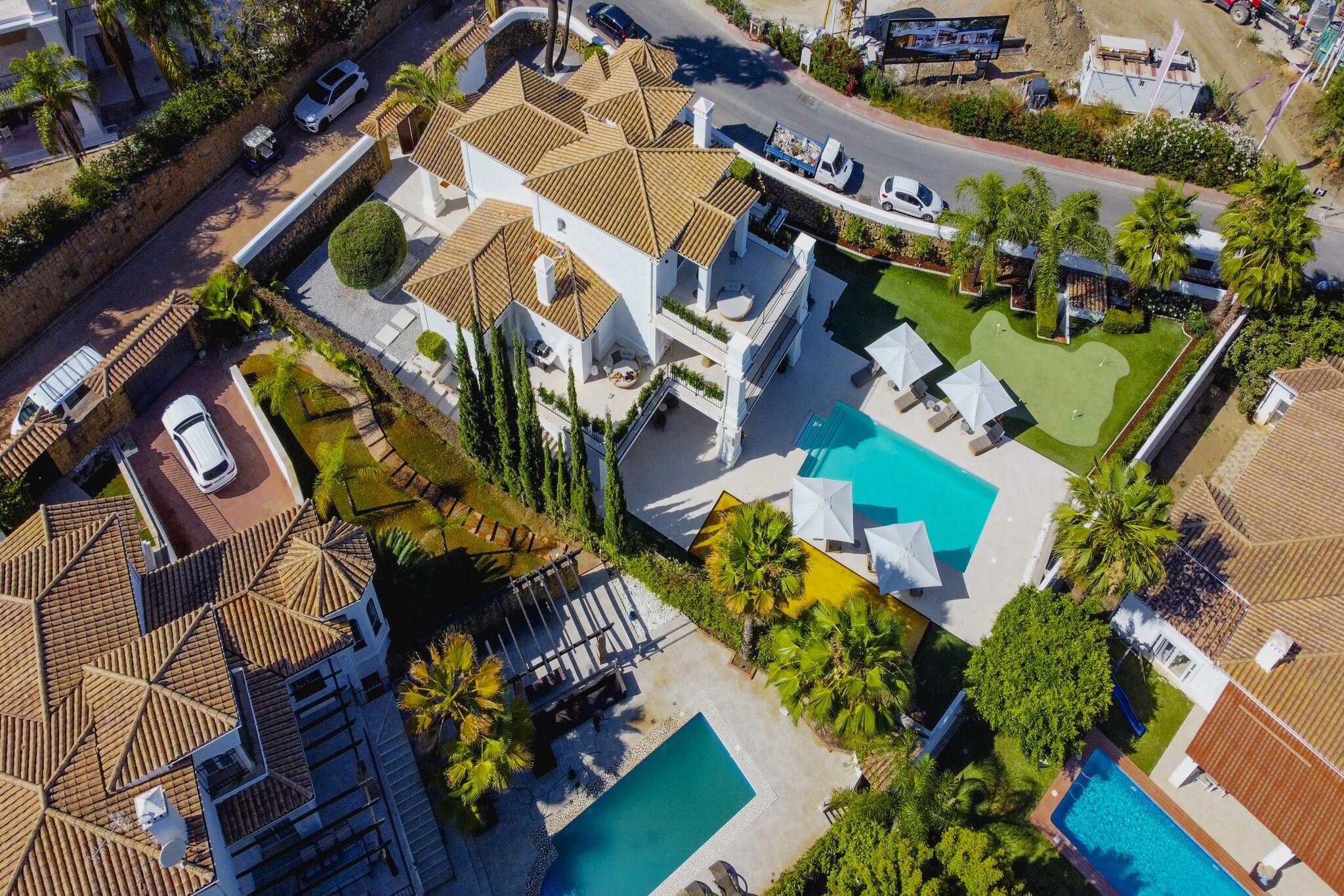 Beliggende i Marbellas eftertragtede kystområde tilbyder denne rummelige villa et luksuriøst privat tilflugtssted for op til tolv gæster, der søger komfort, privatliv og afslapning på Spaniens Costa del Sol. Ejendommen er indrettet over tre etager med elevatoradgang og udgør en ideel ramme for familieferier eller grupperejser med bekvem adgang til strande, golfbaner og lokale faciliteter. Indvendigt har villaen seks rummelige soveværelser fordelt på forskellige etager for at sikre fleksibel indkvartering af grupper. Et soveværelse med eget badeværelse ligger i stueetagen ved siden af den åbne stue og det fuldt udstyrede køkken, mens anden sal rummer yderligere tre soveværelser med direkte adgang til terrassen. Kælderen indeholder yderligere to soveværelser samt et dedikeret spa-område. Fire badeværelser og et separat gæstetoilet sikrer daglig komfort, mens det moderne køkken gør det nemt at lave mad selv under hele opholdet. Der er også gulvvarme, hvilket sikrer indendørs komfort i de koldere måneder. Gæsterne kan træde ud på flere terrasser med udsigt over den anlagte have og den private swimmingpool. Et rummeligt udendørs spiseområde med plads til op til tolv personer og en gasgrill skaber de ideelle rammer for måltider i det fri. Tagterrassen har et lounge- og barområde samt en udendørs jacuzzi og byder på uhindret udsigt over Middelhavet og de omkringliggende bjerge. Denne villa ligger inden for køreafstand af Marbellas strande, golfklubber og marina og byder året rundt på muligheder for afslapning ved havet og udforskning af Costa del Sols naturlandskaber og kulturelle attraktioner.