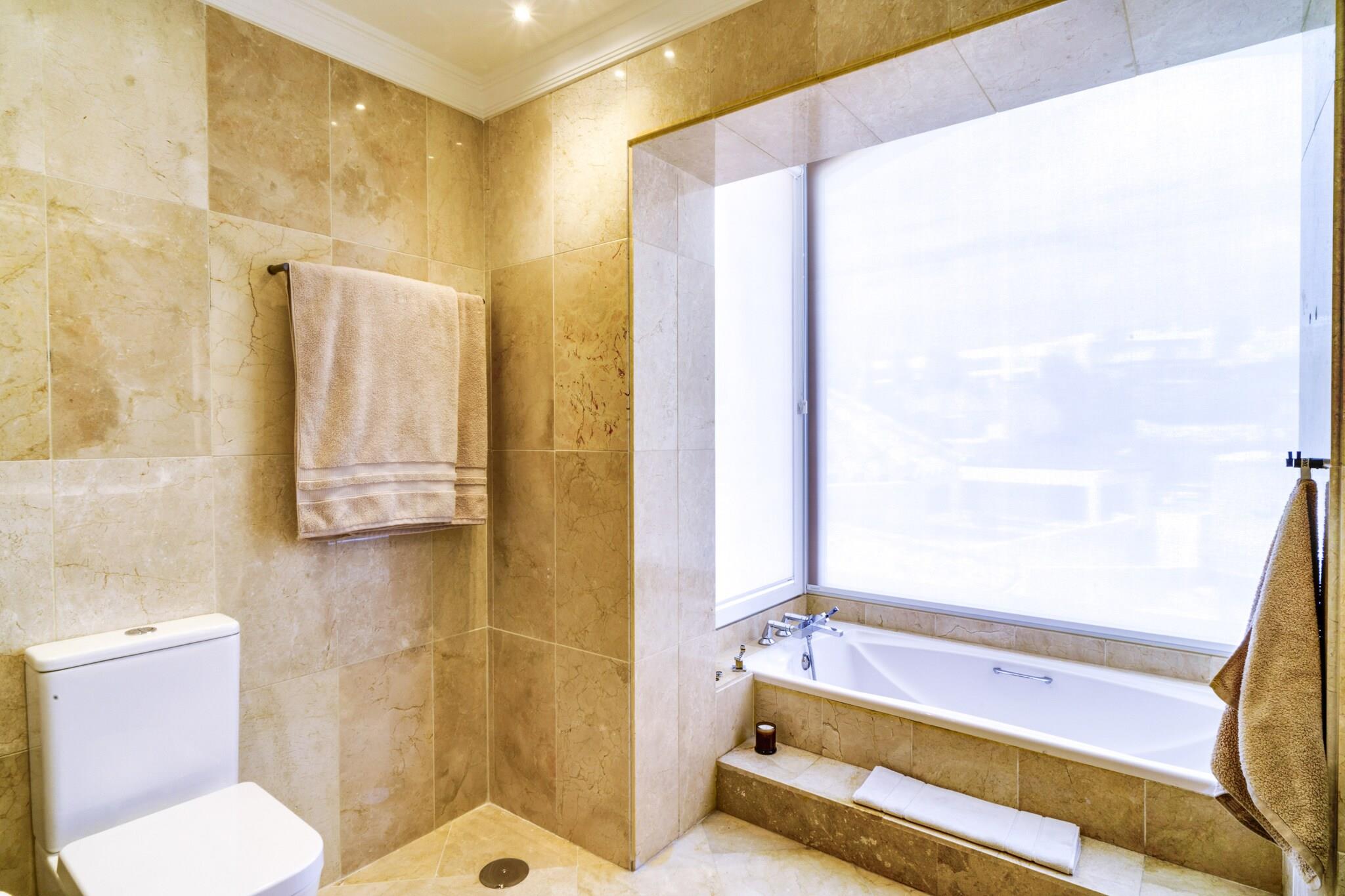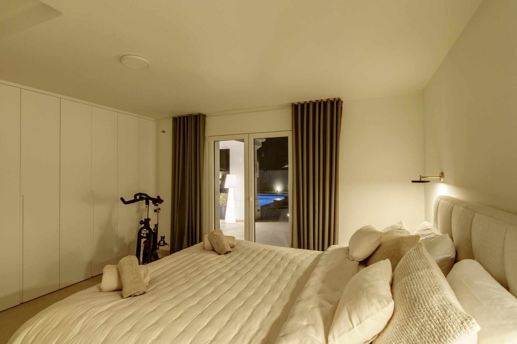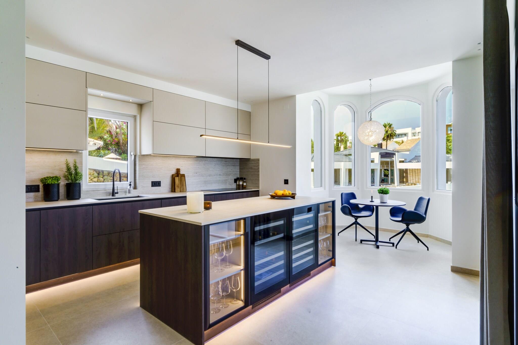 Beliggende i Marbellas eftertragtede kystområde tilbyder denne rummelige villa et luksuriøst privat tilflugtssted for op til tolv gæster, der søger komfort, privatliv og afslapning på Spaniens Costa del Sol. Ejendommen er indrettet over tre etager med elevatoradgang og udgør en ideel ramme for familieferier eller grupperejser med bekvem adgang til strande, golfbaner og lokale faciliteter. Indvendigt har villaen seks rummelige soveværelser fordelt på forskellige etager for at sikre fleksibel indkvartering af grupper. Et soveværelse med eget badeværelse ligger i stueetagen ved siden af den åbne stue og det fuldt udstyrede køkken, mens anden sal rummer yderligere tre soveværelser med direkte adgang til terrassen. Kælderen indeholder yderligere to soveværelser samt et dedikeret spa-område. Fire badeværelser og et separat gæstetoilet sikrer daglig komfort, mens det moderne køkken gør det nemt at lave mad selv under hele opholdet. Der er også gulvvarme, hvilket sikrer indendørs komfort i de koldere måneder. Gæsterne kan træde ud på flere terrasser med udsigt over den anlagte have og den private swimmingpool. Et rummeligt udendørs spiseområde med plads til op til tolv personer og en gasgrill skaber de ideelle rammer for måltider i det fri. Tagterrassen har et lounge- og barområde samt en udendørs jacuzzi og byder på uhindret udsigt over Middelhavet og de omkringliggende bjerge. Denne villa ligger inden for køreafstand af Marbellas strande, golfklubber og marina og byder året rundt på muligheder for afslapning ved havet og udforskning af Costa del Sols naturlandskaber og kulturelle attraktioner.