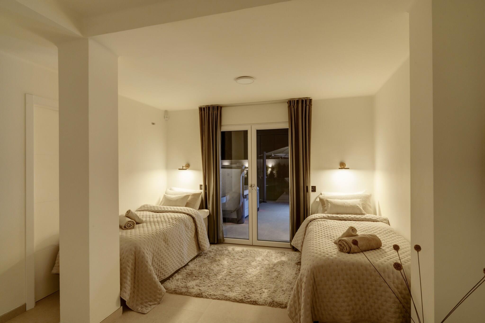 Stueetage: (åbent køkken(elkedel, brødrister, kaffemaskine, ovn, mikrobølgeovn, opvaskemaskine , køle-fryseskab, , ), stue / spisestue(Fjernsyn(fladskærm), spisebord, sofahjørne, DVD-afspiller, radio), soveværelse(dobbeltseng), soveværelse(enkeltseng, enkeltseng), soveværelse(dobbeltseng), soveværelse(dobbeltseng), soveværelse(dobbeltseng), soveværelse(dobbeltseng), badeværelse(badekar, håndvask, toilet, føntørrer), badeværelse(bruser, håndvask, toilet), badeværelse(badekar, håndvask, toilet, føntørrer), badeværelse(bruser, håndvask, toilet), toilet(håndvask, toilet)) Internetadgang, Havemøbler, tørretumbler, tremmeseng, vaskemaskine, balkon, varme, klimaanlæg, terrasse, have, parkering, swimmingpool(privat), barnestol, strygejern, Alarm