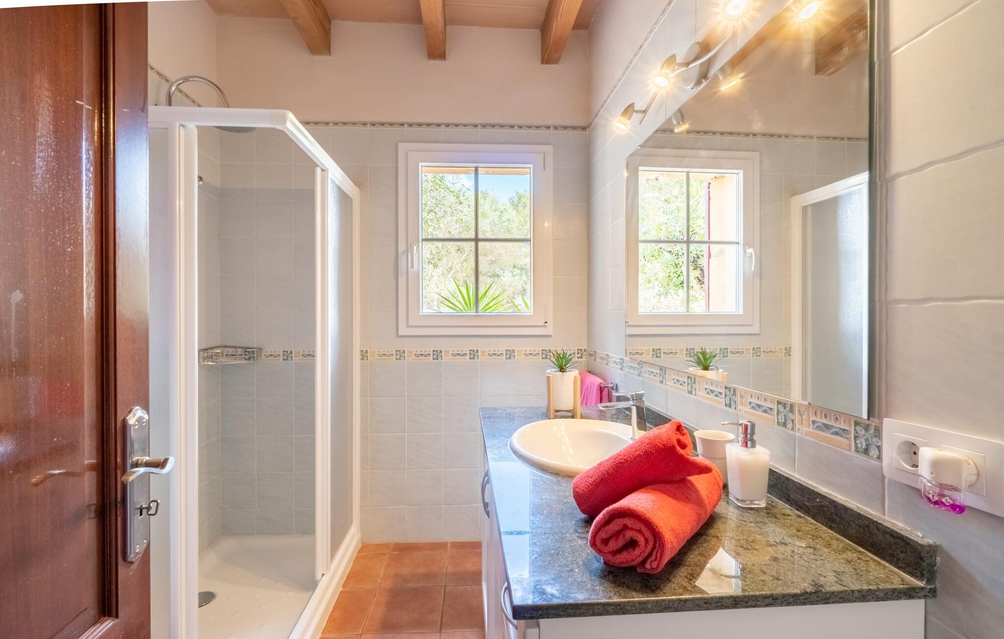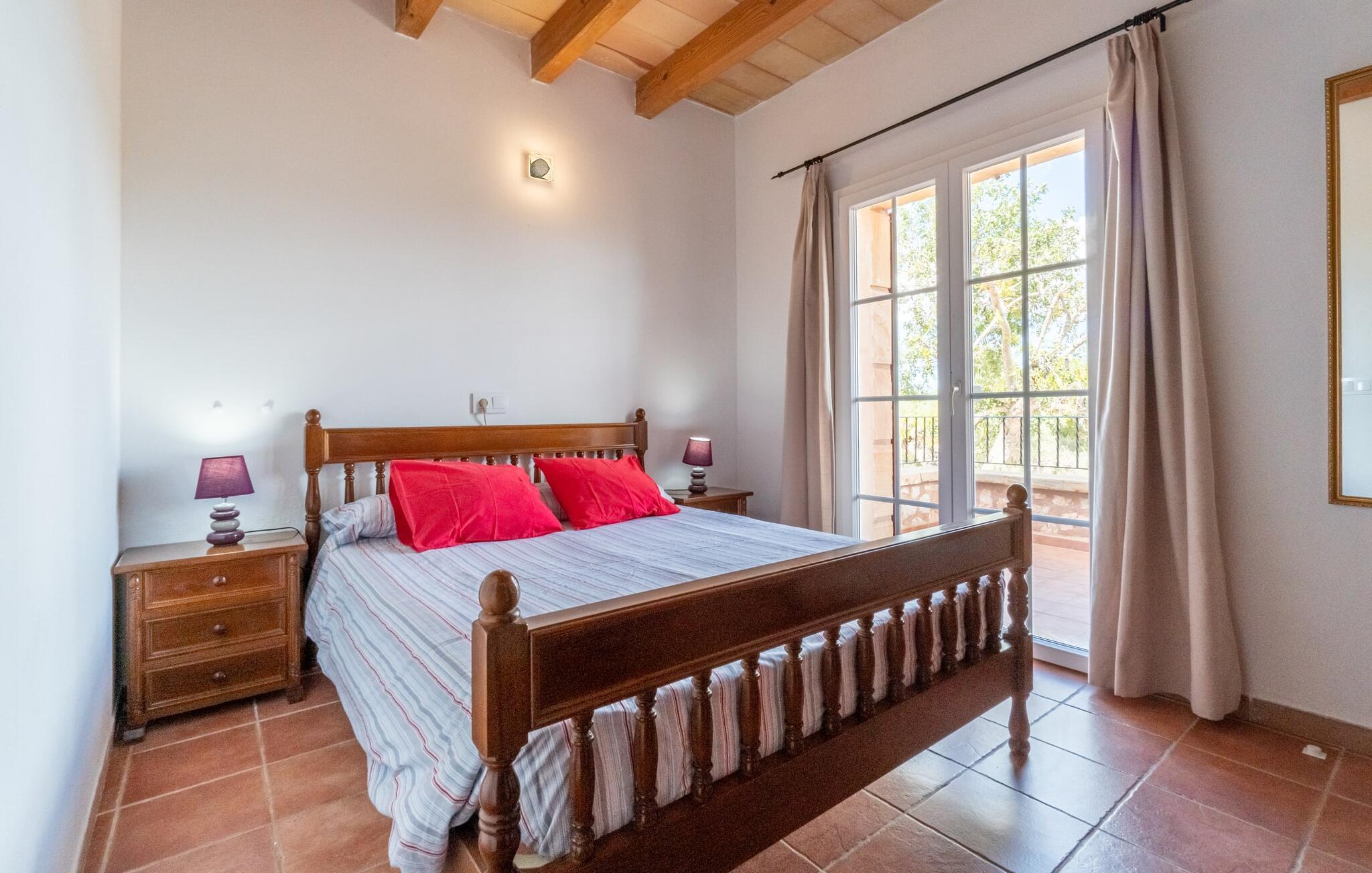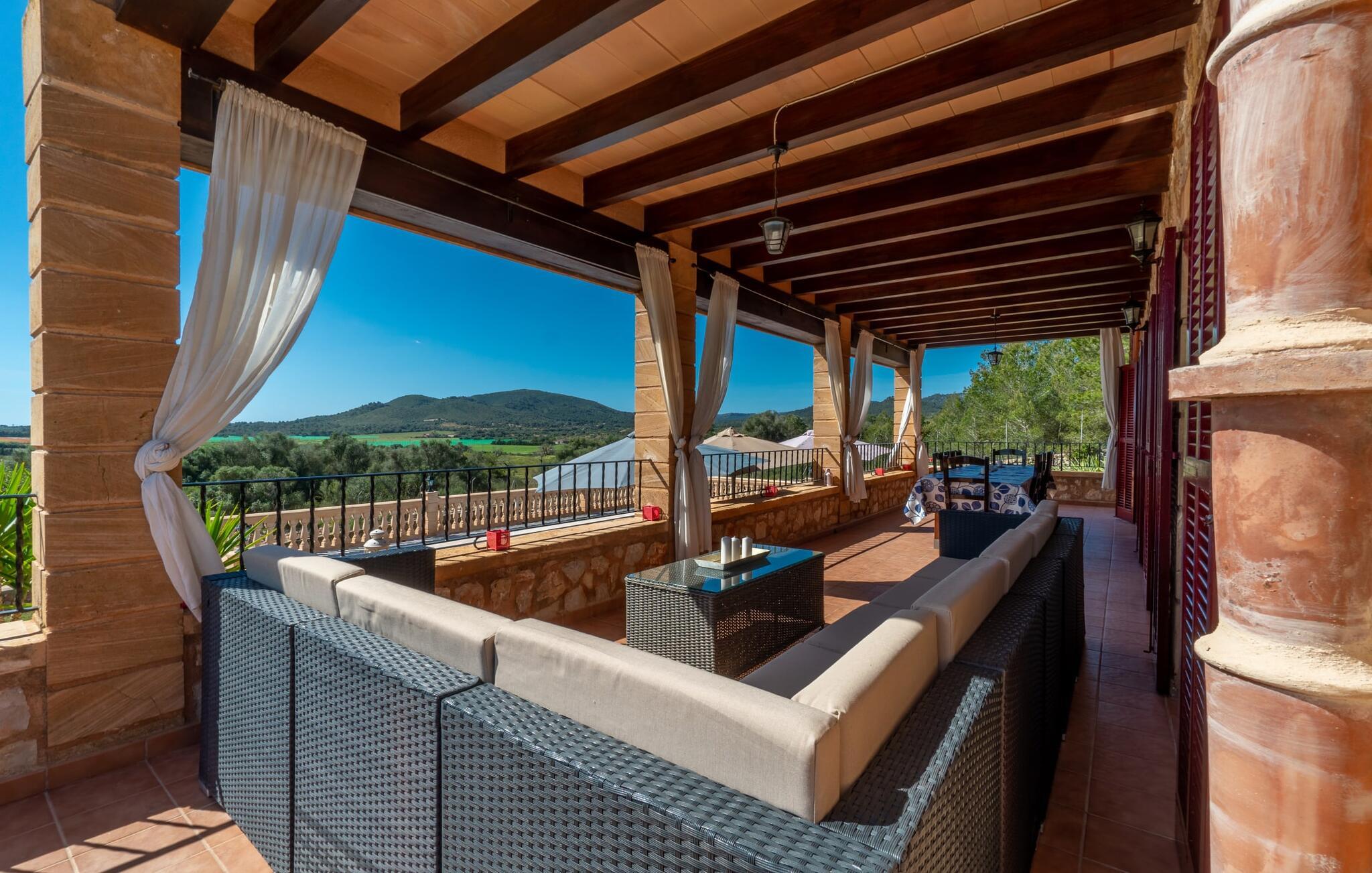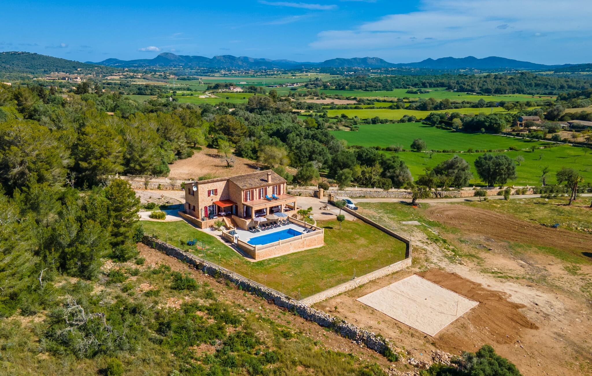 Villaen "Maria de Mendia", bygget i traditionel stenbrudskonstruktion og alligevel meget moderne, er et særdeles familievenligt hus, ikke kun på grund af sin størrelse og indretning, men også på grund af sine lave sæsonpriser hele året rundt. Omgivet af talrige træer ligger den to-etagers villa på en smuk ejendom med en smuk, uberørt beliggenhed. I kan nyde den smukke udsigt over de bølgende bakker, der præger øens østlige landskab, fra talrige steder omkring villaen: 12 udendørs siddepladser og lige så mange liggestole tilbyder masser af muligheder for vores gæster. Den moderne, ubebyggede stenvilla har et smukt designet udendørsområde: den rummelige pool med den runde, flade trappe ligger kun få skridt under huset og er omgivet af en vidunderlig solterrasse. Hver gæst har sin egen liggestol, og der er også i alt 3 parasoller til rådighed. Den praktiske udendørs bruser giver jer mulighed for at bruse af efter en lang svømmetur i poolen uden at skulle hjem - især praktisk for rejsende med små børn. Fra poolen fører terrassen trin til terrasseområdet omkring huset og til verandaen, som er delvist overdækket takket være balkonen på første sal ovenover. Udover en moderne siddegruppe i polyrattan finder I her også et langt spisebord. At spise udenfor med murstensgrillen placeret lige ved siden af det overdækkede område er bare en rigtig fornøjelse. Den ekstra spiseplads, som er placeret uden for den overdækkede del af terrassen, kan skygges ved hjælp af et maritimt fortelt. Fra poolen eller terrassen kan I få adgang til husets indre via flere gulv-til-loft vinduer. Det rummelige køkkenområde er placeret bag store vindueselementer, hvis buede former minder om et flettet kurvehåndtag og oversvømmer rummet med behagelig lysstyrke. Køkkenet har adskillige skabe og en disk i amerikansk stil med mere end nok opbevaringsplads. De 3 farvede taburetter understreger områdets moderne og åbne karakter. "Fuldt møbleret" betyder ikke kun fast installerede elektriske apparater som ovn, mikroovn, stort køle-fryseskab og komfur, men også en blender, kaffemaskine, brødrister, elkedel og meget mere. Opholdsstuen med brune gulvfliser og komfortable sofaer fuldender sin hyggelige atmosfære ved hjælp af en pejs. Soveværelserne er alle moderne indrettede, har komfortable senge, og nogle er dekoreret med mønstret tapet af høj kvalitet. Fra nogle af soveværelserne på første sal er der adgang til den store altan, som I helt sikkert skal bruge ved solnedgang for at nyde stilheden og den vidunderlige naturlige udsigt med et godt glas mallorcansk rødvin. Der er 4 moderne badeværelser, nogle med hjørnebadekar eller -bruser, og 2 badeværelser er en-suite. Den rustikke og moderne villa "Maria de Mendia" ligger midt i et ganske enkelt smukt, naturligt miljø, mellem Manacors centrum og den maleriske havneby Portocristo. I kan købe dagligvarer enten i Manacor eller Portocristo, hvor der også er et autentisk bondemarked om søndagen. "Calas de Mallorca", smukke naturstrande, men også nogle veludviklede bystrande, ligger langs østkysten og kan nås på 10-15 minutter. Bemærk venligst, at denne ejendom ikke accepterer ungdomsgrupper eller polterabender. En ungdomsgruppe på denne ejendom består af personer på 23 år eller derunder. Book ikke denne ejendom, hvis I er en ungdomsgruppe eller polterabend, da jeres reservation vil blive afvist, når den er booket, hvilket også kan være tilfældet ved ankomst til ejendommen eller under jeres ophold, og I vil ikke modtage en refusion