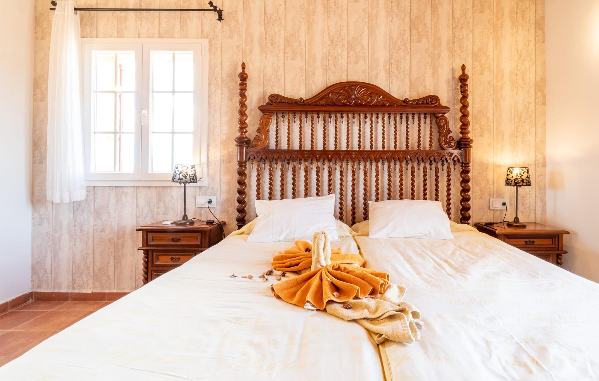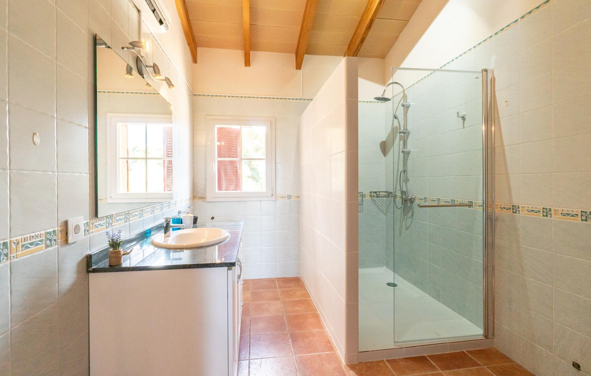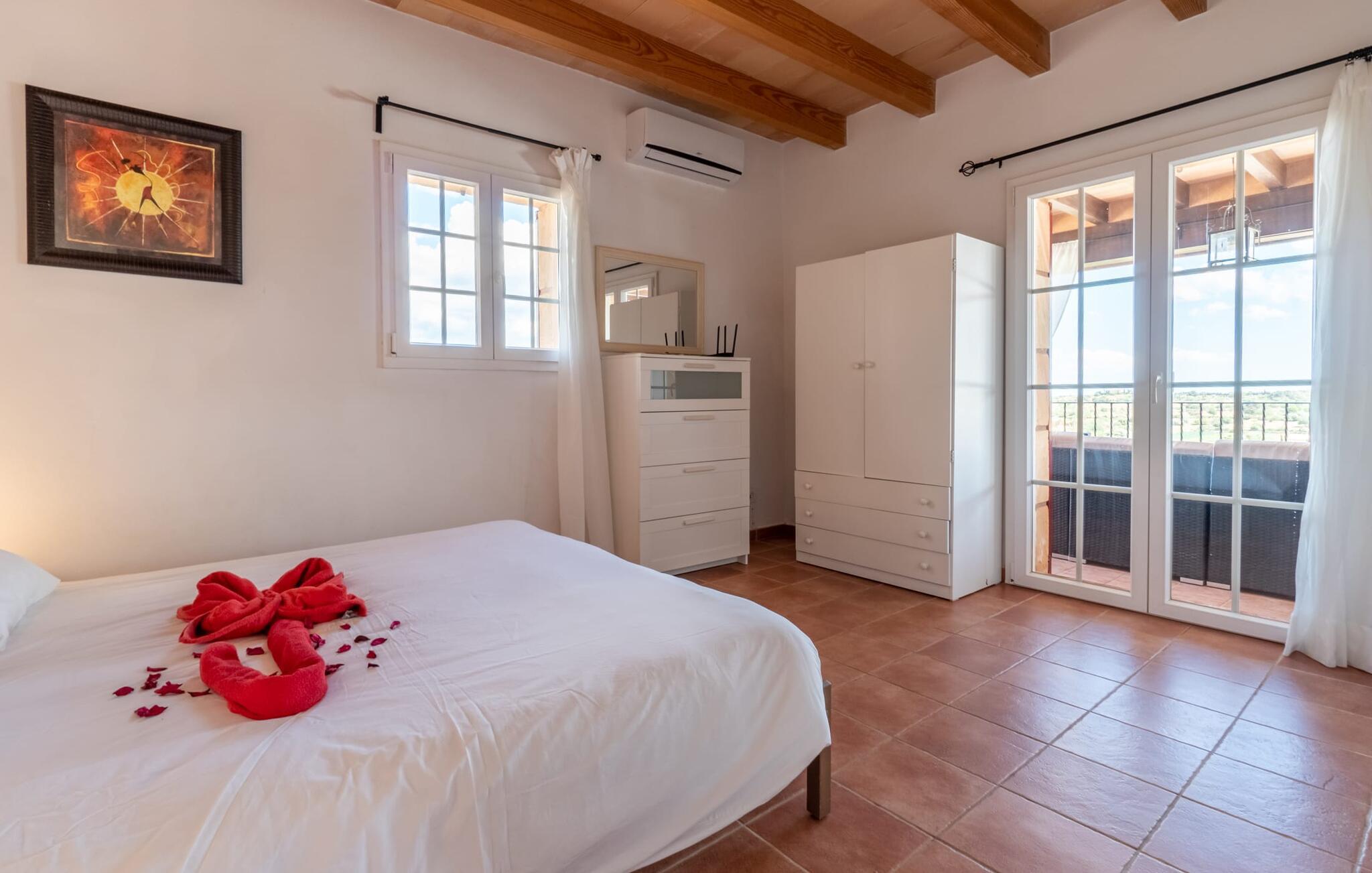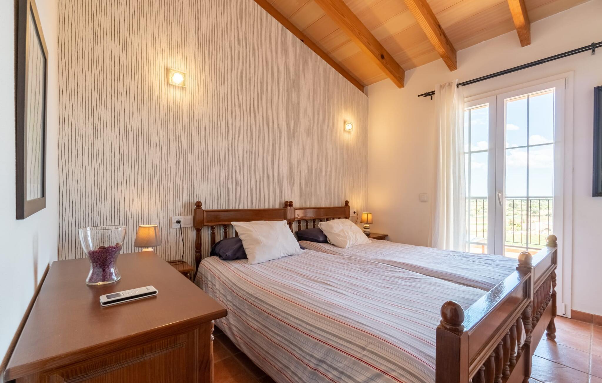 Villaen "Maria de Mendia", bygget i traditionel stenbrudskonstruktion og alligevel meget moderne, er et særdeles familievenligt hus, ikke kun på grund af sin størrelse og indretning, men også på grund af sine lave sæsonpriser hele året rundt. Omgivet af talrige træer ligger den to-etagers villa på en smuk ejendom med en smuk, uberørt beliggenhed. I kan nyde den smukke udsigt over de bølgende bakker, der præger øens østlige landskab, fra talrige steder omkring villaen: 12 udendørs siddepladser og lige så mange liggestole tilbyder masser af muligheder for vores gæster. Den moderne, ubebyggede stenvilla har et smukt designet udendørsområde: den rummelige pool med den runde, flade trappe ligger kun få skridt under huset og er omgivet af en vidunderlig solterrasse. Hver gæst har sin egen liggestol, og der er også i alt 3 parasoller til rådighed. Den praktiske udendørs bruser giver jer mulighed for at bruse af efter en lang svømmetur i poolen uden at skulle hjem - især praktisk for rejsende med små børn. Fra poolen fører terrassen trin til terrasseområdet omkring huset og til verandaen, som er delvist overdækket takket være balkonen på første sal ovenover. Udover en moderne siddegruppe i polyrattan finder I her også et langt spisebord. At spise udenfor med murstensgrillen placeret lige ved siden af det overdækkede område er bare en rigtig fornøjelse. Den ekstra spiseplads, som er placeret uden for den overdækkede del af terrassen, kan skygges ved hjælp af et maritimt fortelt. Fra poolen eller terrassen kan I få adgang til husets indre via flere gulv-til-loft vinduer. Det rummelige køkkenområde er placeret bag store vindueselementer, hvis buede former minder om et flettet kurvehåndtag og oversvømmer rummet med behagelig lysstyrke. Køkkenet har adskillige skabe og en disk i amerikansk stil med mere end nok opbevaringsplads. De 3 farvede taburetter understreger områdets moderne og åbne karakter. "Fuldt møbleret" betyder ikke kun fast installerede elektriske apparater som ovn, mikroovn, stort køle-fryseskab og komfur, men også en blender, kaffemaskine, brødrister, elkedel og meget mere. Opholdsstuen med brune gulvfliser og komfortable sofaer fuldender sin hyggelige atmosfære ved hjælp af en pejs. Soveværelserne er alle moderne indrettede, har komfortable senge, og nogle er dekoreret med mønstret tapet af høj kvalitet. Fra nogle af soveværelserne på første sal er der adgang til den store altan, som I helt sikkert skal bruge ved solnedgang for at nyde stilheden og den vidunderlige naturlige udsigt med et godt glas mallorcansk rødvin. Der er 4 moderne badeværelser, nogle med hjørnebadekar eller -bruser, og 2 badeværelser er en-suite. Den rustikke og moderne villa "Maria de Mendia" ligger midt i et ganske enkelt smukt, naturligt miljø, mellem Manacors centrum og den maleriske havneby Portocristo. I kan købe dagligvarer enten i Manacor eller Portocristo, hvor der også er et autentisk bondemarked om søndagen. "Calas de Mallorca", smukke naturstrande, men også nogle veludviklede bystrande, ligger langs østkysten og kan nås på 10-15 minutter. Bemærk venligst, at denne ejendom ikke accepterer ungdomsgrupper eller polterabender. En ungdomsgruppe på denne ejendom består af personer på 23 år eller derunder. Book ikke denne ejendom, hvis I er en ungdomsgruppe eller polterabend, da jeres reservation vil blive afvist, når den er booket, hvilket også kan være tilfældet ved ankomst til ejendommen eller under jeres ophold, og I vil ikke modtage en refusion