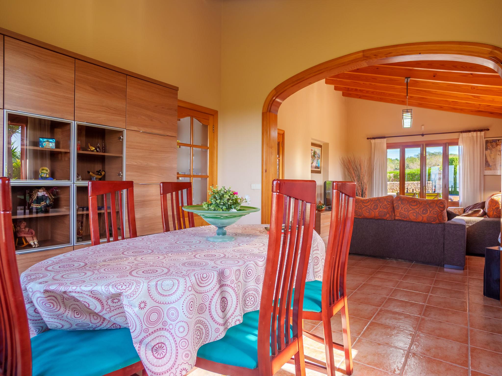 "Sa Tanca", 4-room villa 155 m2. Object suitable for 8 adults. Spacious and bright, practical and comfortable furnishings: entrance hall. Exit to the patio. Open large living/dining room with panoramic window with 2 sleeping facilities (2 x 90 cm, length 190 cm), dining table, digital TV, flat screen and hi-fi system. Exit to the patio. 1 double bedroom, window onto the courtyard with 2 beds (90 cm, length 200 cm), air conditioning and forced-air heating. 1 double bedroom, window onto the courtyard with 2 beds (90 cm, length 200 cm), air conditioning and forced-air heating. 1 large double bedroom, window onto the courtyard with 1 double bed (150 cm, length 200 cm), bath/bidet/WC, air conditioning and forced-air heating. Large kitchen (oven, dishwasher, 3 ceramic glass hob hotplates, microwave, freezer, electric coffee machine) with dining table. Exit to the balcony. Bath/bidet/WC. Large patio, porch. Terrace furniture, barbecue, deck chairs (8), covered balcony. Beautiful panoramic view of the countryside and the resort. Facilities: washing machine, iron, children's high chair, baby cot for up to 2 year olds, hair dryer. Internet (WiFi, free). Garage on the property at the house. Suitable for families. Maximum 1 pet/ dog allowed. ETV15026 // Reg. Nr.: ESFCTU000007025000100348000000000000000000000000000000