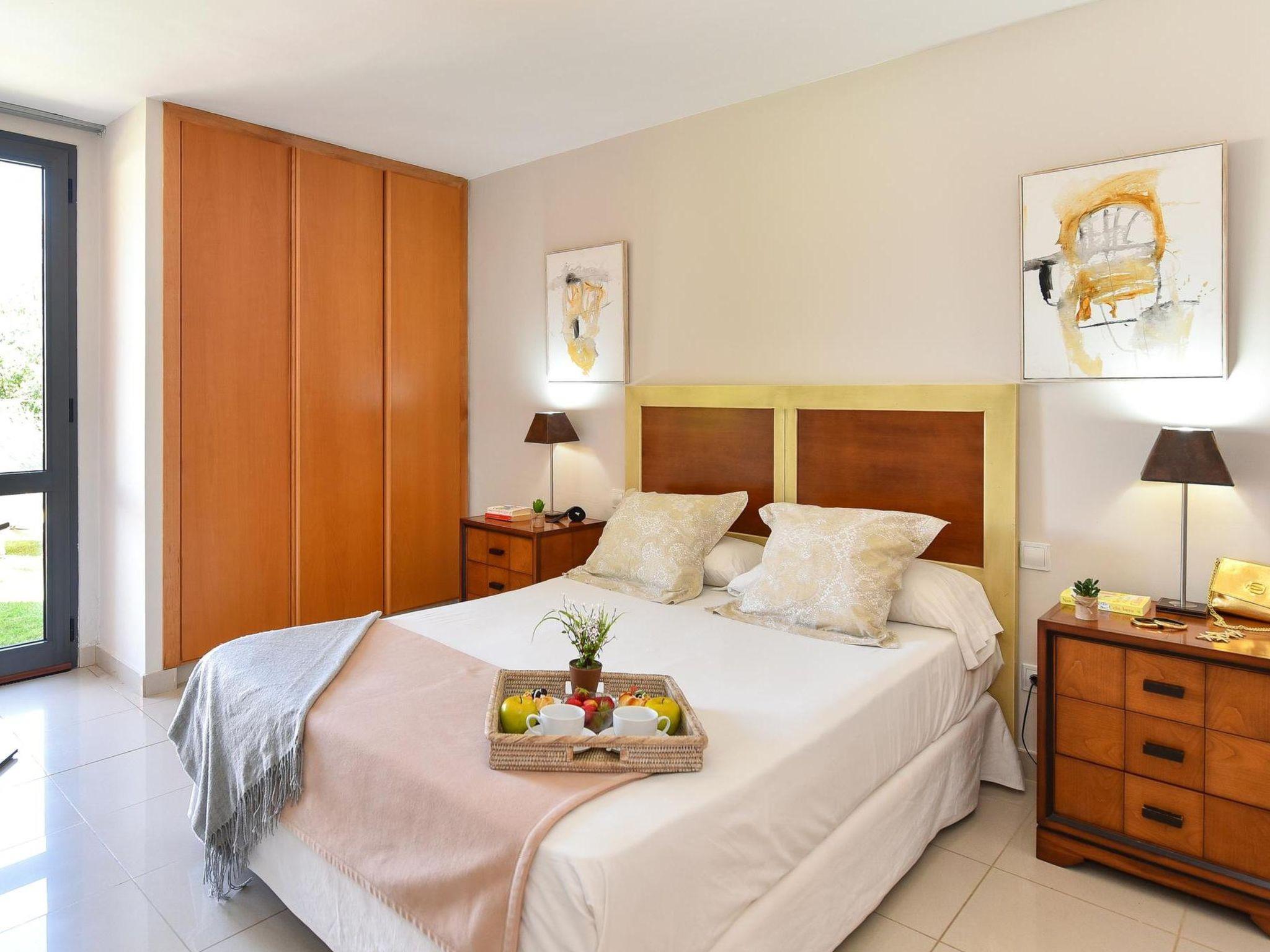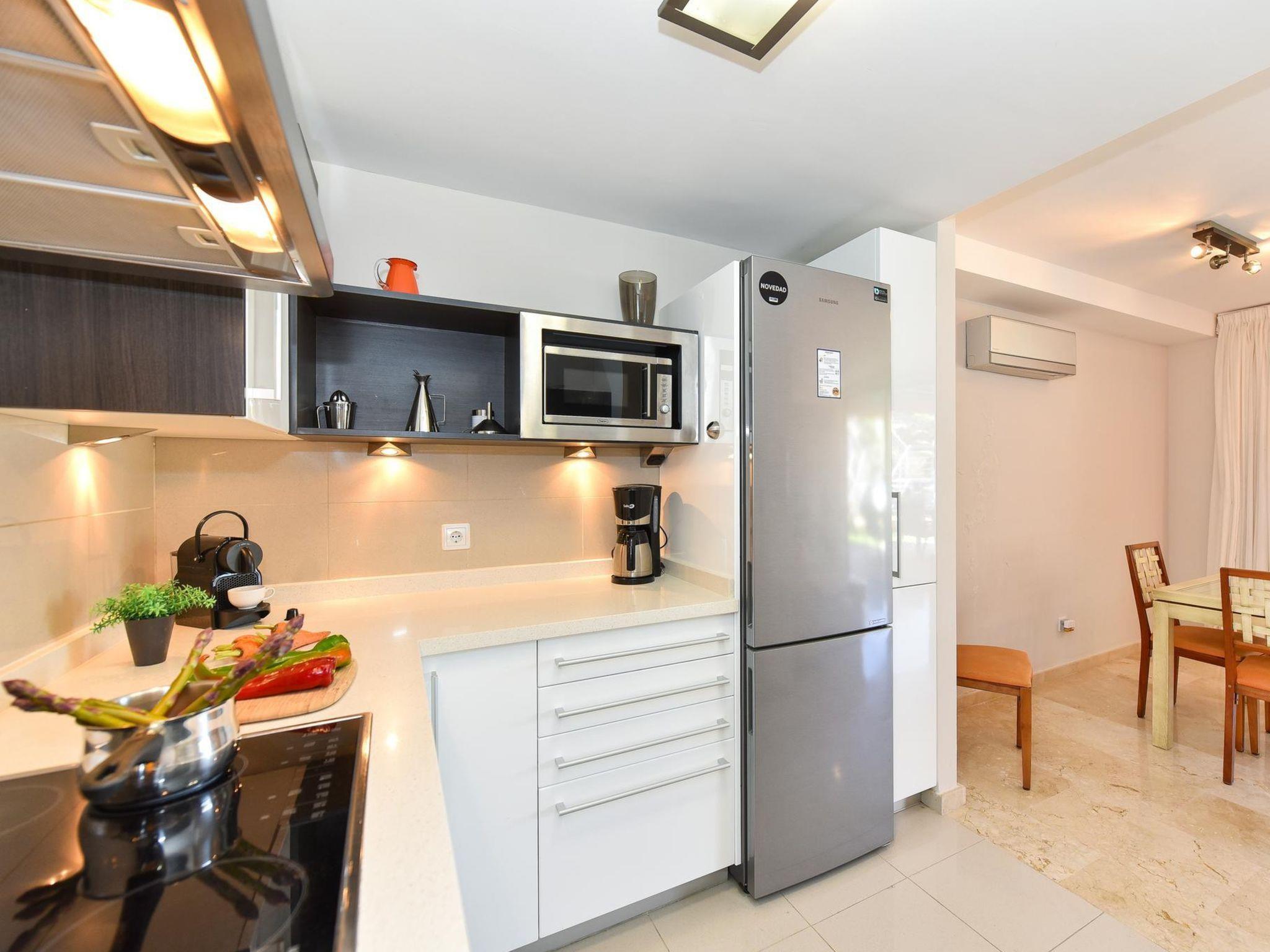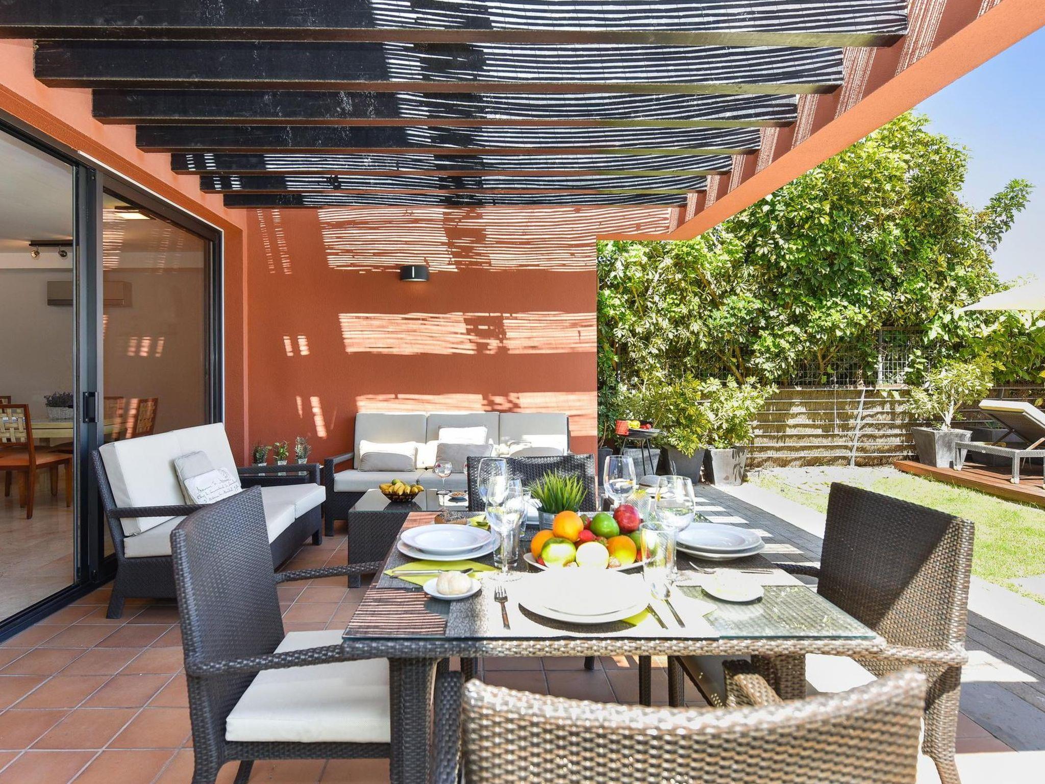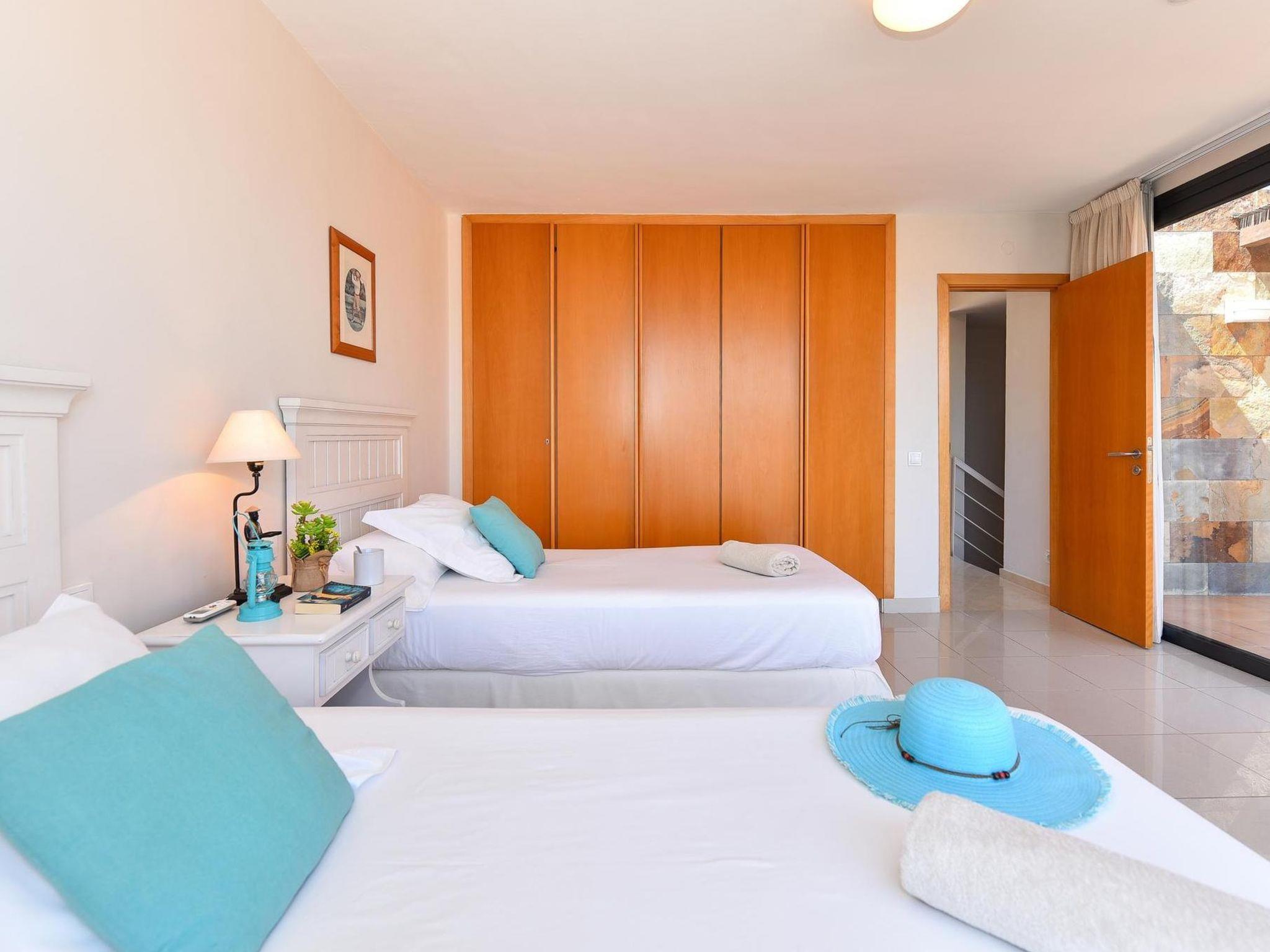 "Tipo Nº6", 3-room house 105 m2 on 2 levels. Comfortable and modern furnishings: living/dining room with dining table, satellite TV, digital TV, hi-fi system, DVD and air conditioning. Exit to the patio, to the swimming pool. 1 room with 1 french bed, bath/bidet/WC and air conditioning. Exit to the garden, to the swimming pool. Open kitchen (oven, dishwasher, 4 ceramic glass hob hotplates, toaster, kettle, microwave, freezer, electric coffee machine). Upper floor: 1 room with 2 beds, bath/WC and air conditioning. Exit to the terrace. Patio. Terrace furniture, barbecue, deck chairs. View of the mountains and the garden. Facilities: washing machine, dryer, safe, iron, children's high chair, baby cot for up to 2 year olds, hair dryer. Internet (WiFi, free). Parking (1 car). Please note: non-smoking house. Maximum 1 pet/ dog allowed. 2017/263 // Reg. Nr.: ESFCTU0000350120003181590000000000000VV-35-1-00003180