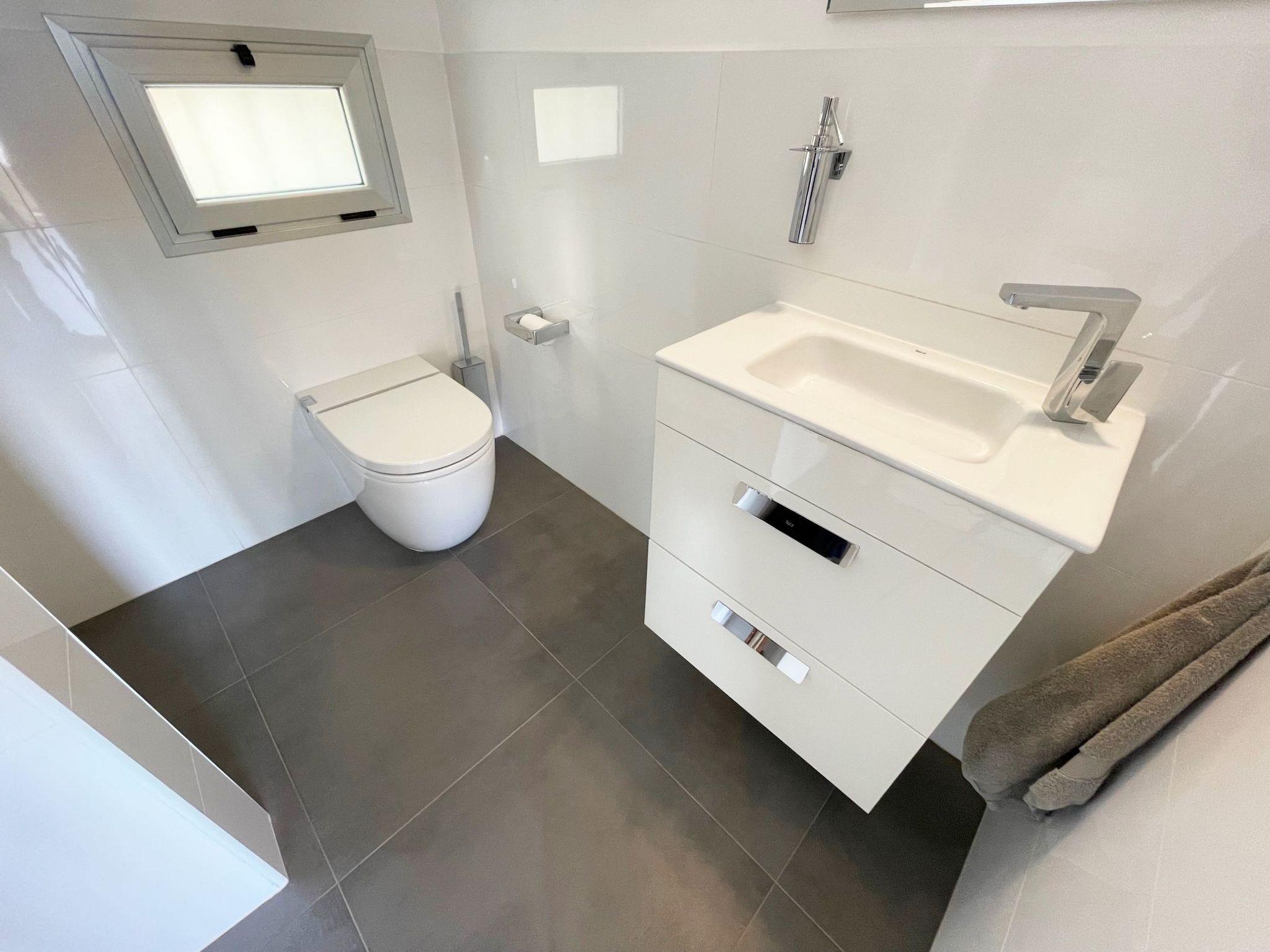 On the upper floor you will find 3 bedrooms, one of them with a large double bed (180 x 200), private bathroom and balcony with sea view. The second bedroom also has a sea view and a cosy double bed (140 x 200). The third bedroom has a comfortable pull-out sofa bed (140 x 200) and can also be used as an office. TV in all 3 bedrooms. A second, small bathroom can also be found on this level, but we think you will much prefer to shower in the secluded outdoor shower with sea view. The Italian kitchen is fully equipped, washing machine and tumble dryer are also at your disposal.