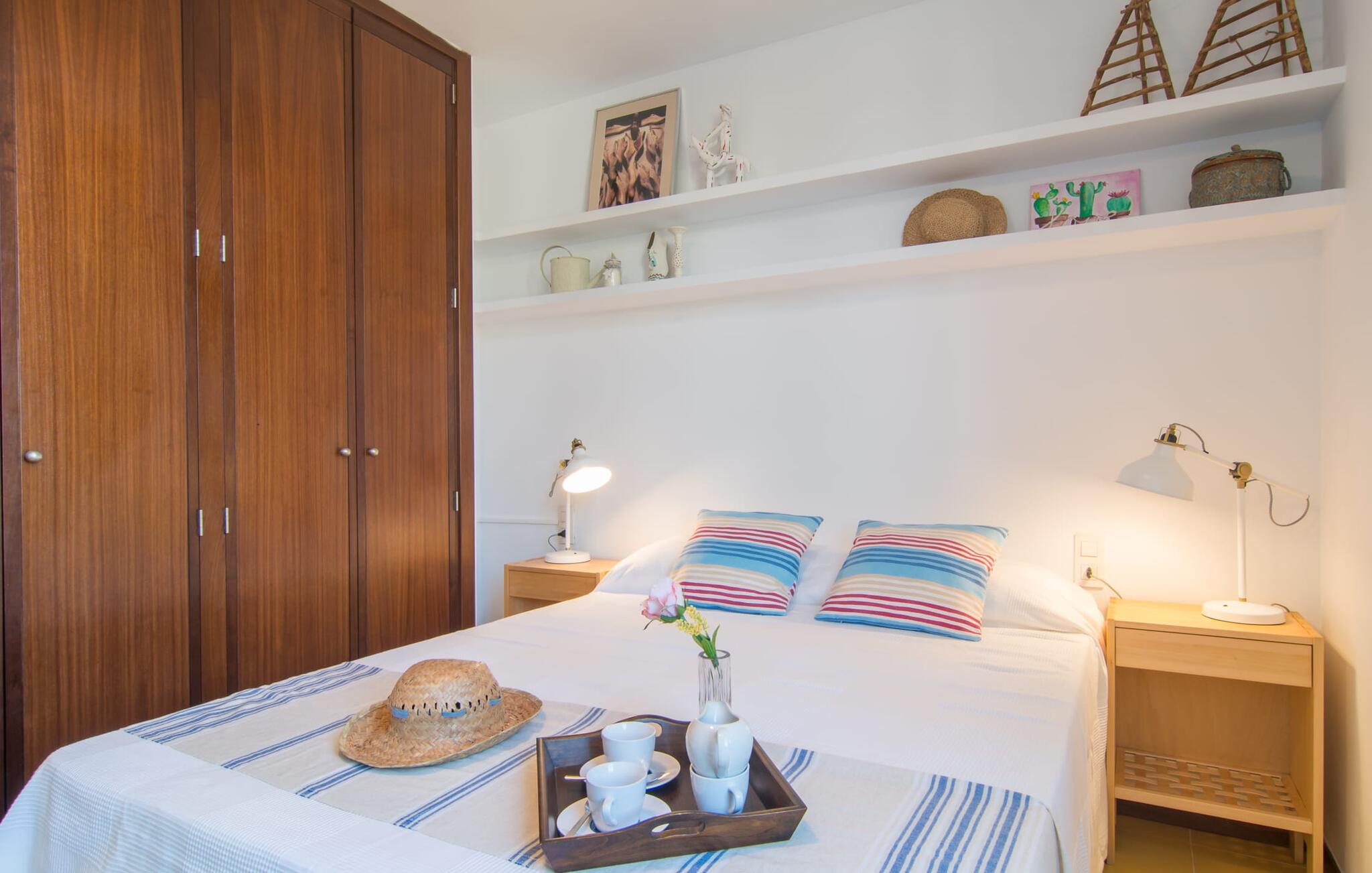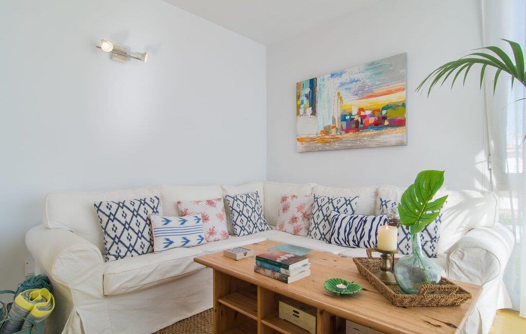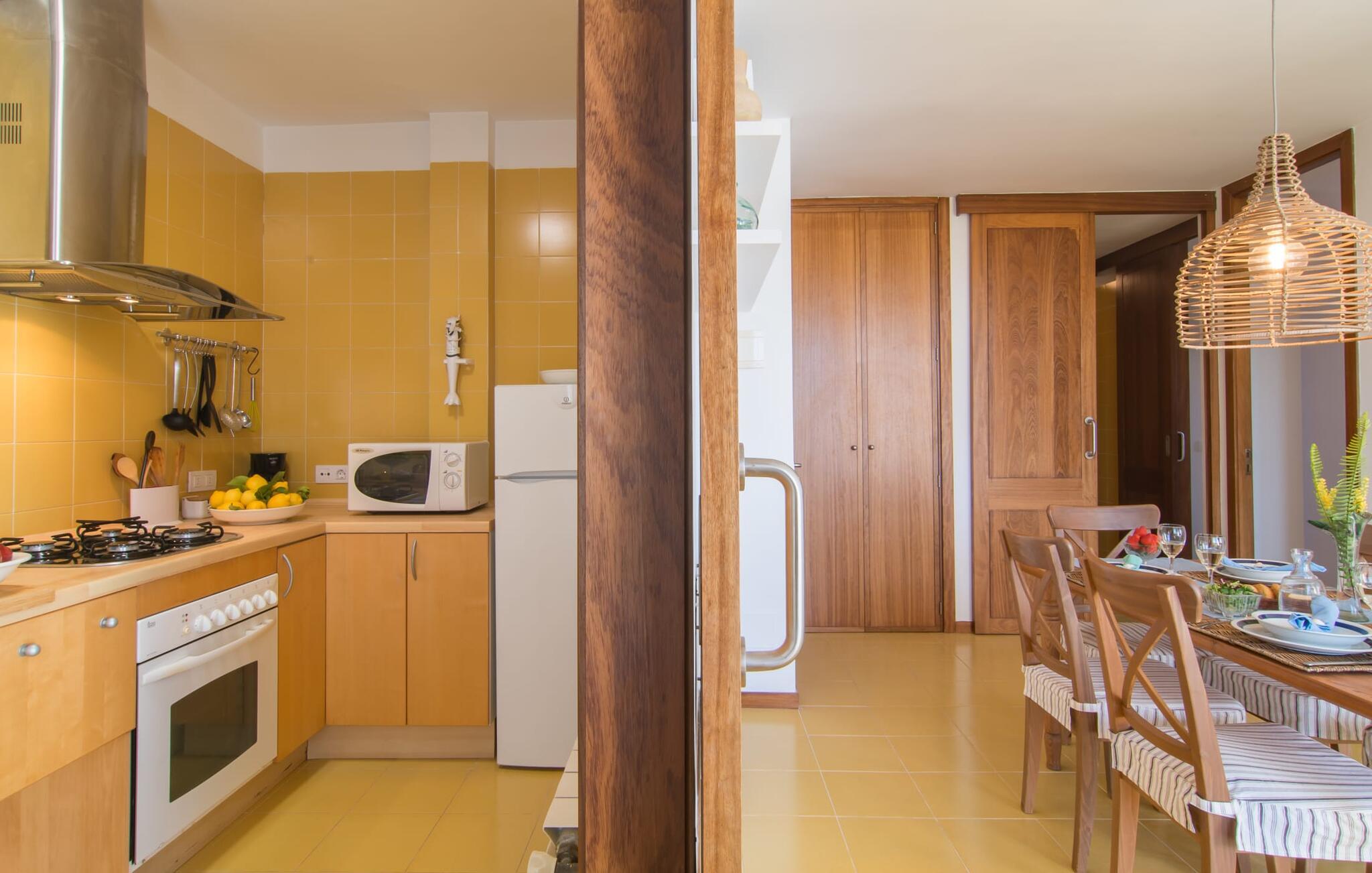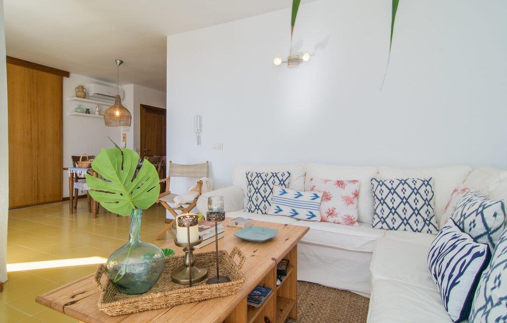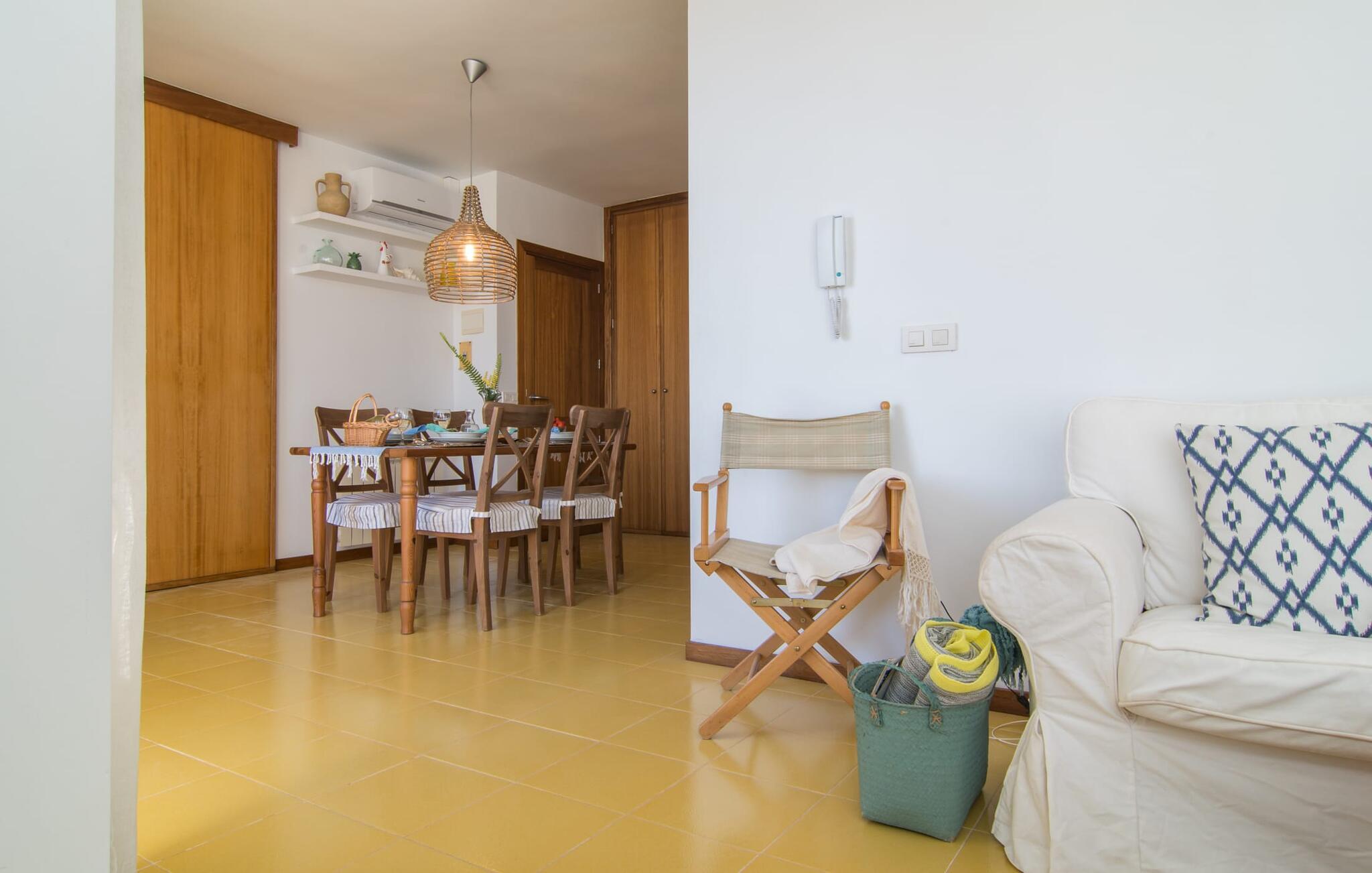 Enestående åben og venlig, denne bolig for op til fire voksne åbner sine døre, bag hvilken der er en masse hygge og munter gul. Altanen vender ud mod fronten, så I altid kan se travlheden bag cypreshækken, mens I spiser morgenmad, kaffe eller aftensmad, uden at skulle give afkald på jeres privatliv. Havet ligger vidunderligt tæt på, men foretrækker I ikke at hoppe i bølgerne og bare svømme et par rolige strækninger, kan I også benytte den 10 meter lange pool med solterrasse ved siden af – et ret sjældent indslag for ferielejligheder. Lejlighedens værelser er præget af en enkel æstetik. Med en L-formet stue og spisestue, et fuldt udstyret køkken, to soveværelser og et badeværelse, har den alt hvad I behøver til den perfekte strandferie. De gule fliser, der løber gennem rummene, understreger ikke kun boligens "sol"-motiv, men også den muntre lethed, som "Mirella" udstråler og vil vække en varig feriefølelse hos sine gæster. Gulv-til-loft vinduerne nær sofaen og spisebordet slipper masser af lys ind og giver udsigt til omgivelserne, møblerne emmer af komfort og gør også hjemmeaftenerne til en behagelig tid, det være sig med en lækker middag , en bog, jeres Yndlingsserie eller en lang samtale mellem de farverige sofapuder eller ved bordet. I det ene soveværelse er der en stor seng på 1,50 x 2 m, i det andet soveværelse er der to 0,90 m brede enkeltsenge. Badeværelset med dobbelt håndvask, bruser og separat toilet er ensuite til det ene soveværelse og er også tilgængeligt for de øvrige gæster fra stuen. Da lejligheden er udstyret med varm/kold aircondition, kan I bo her komfortabelt hele året rundt. "Mirella" er et ideelt udgangspunkt for en række forskellige udforskninger i det smukke nord og nordvestlige Mallorca. Port de Pollença med dens lystbådehavn, smukke promenade og strand kan udforskes dagligt til fods, den berømte Golgata, den gamle romerske bro, museer og gallerier samt kunsthåndværk og små butikker i Pollença. Der er ingen mangel på seværdige udflugtsmål i området. Takket være dens beliggenhed på den lille gade, er I perfekt forbundet til udflugter. Regionens gastronomiske tilbud er også imponerende, lige fra det traditionelle mallorcanske køkken til mere forskelligartede kulinariske oplevelser. For vandreentusiaster er vandrestien GR 221 en af mange muligheder på den nordlige del af øen for cyklister, og kurverne på Cap Formentor er fristende. Urbant med masser af flair: I den sydlige del af Port de Pollença finder I feriehuset "Mirella", som er indrettet med stor sans for detaljen. Forskellige indkøbsmuligheder er inden for gåafstand, og travlheden på det ugentlige marked i Pollença med dets brede udvalg af lækre regionale produkter er kun 8 km væk. Strandene i Badia de Pollença ligger cirka 1 km væk og kan nemt nås til fods. Can Cap de Bou ligger kun 4 km væk, og andre smukke kystbyer kan også nås hurtigt i bil.