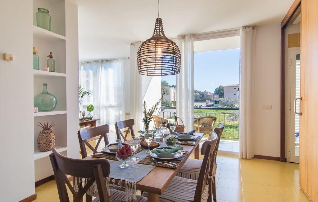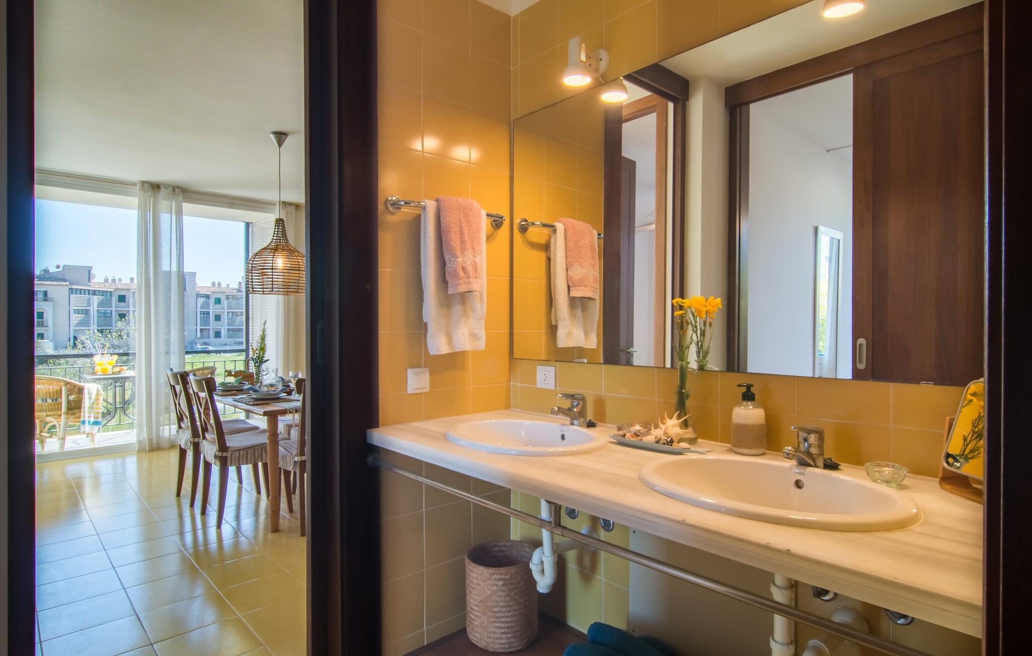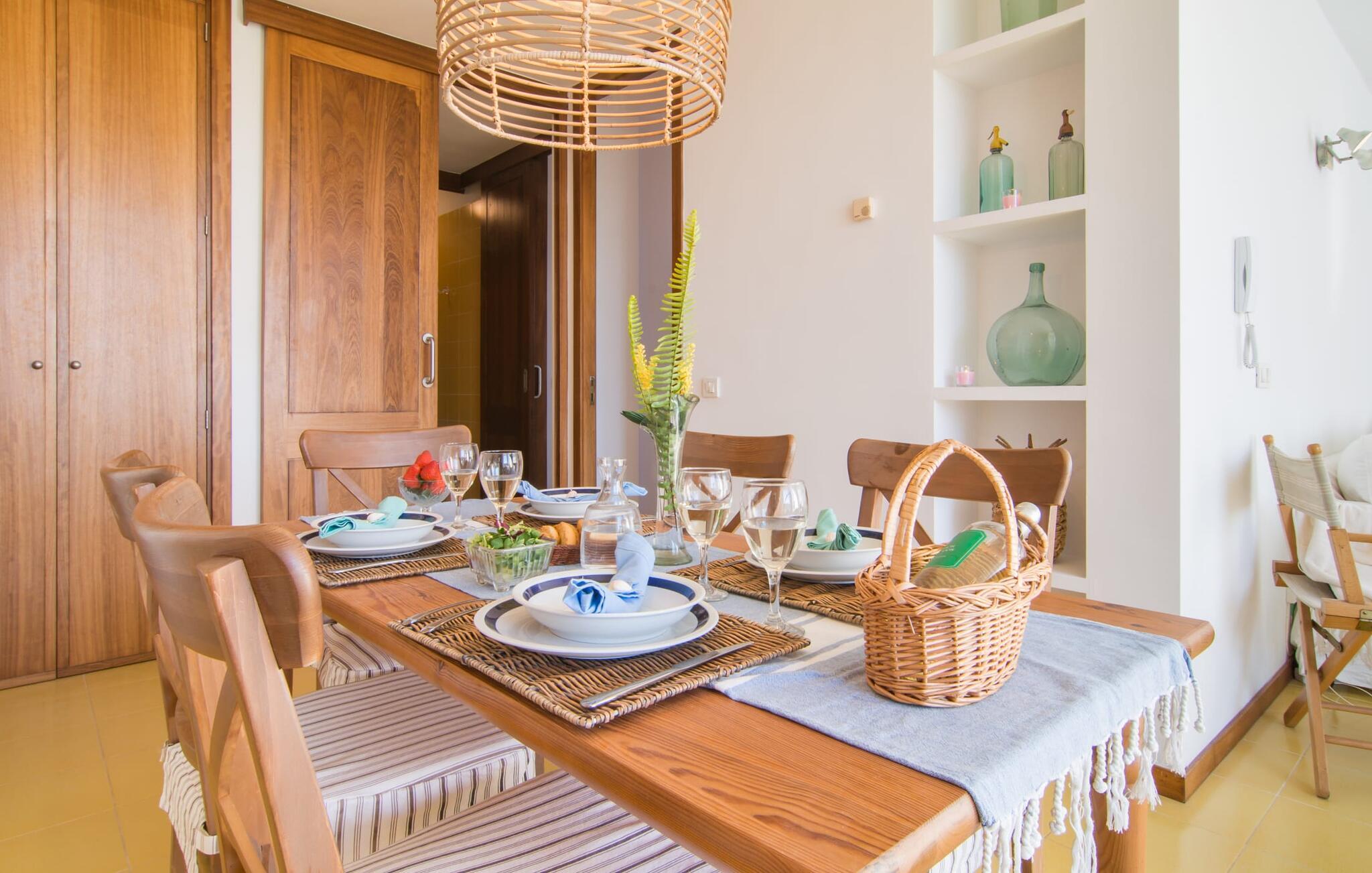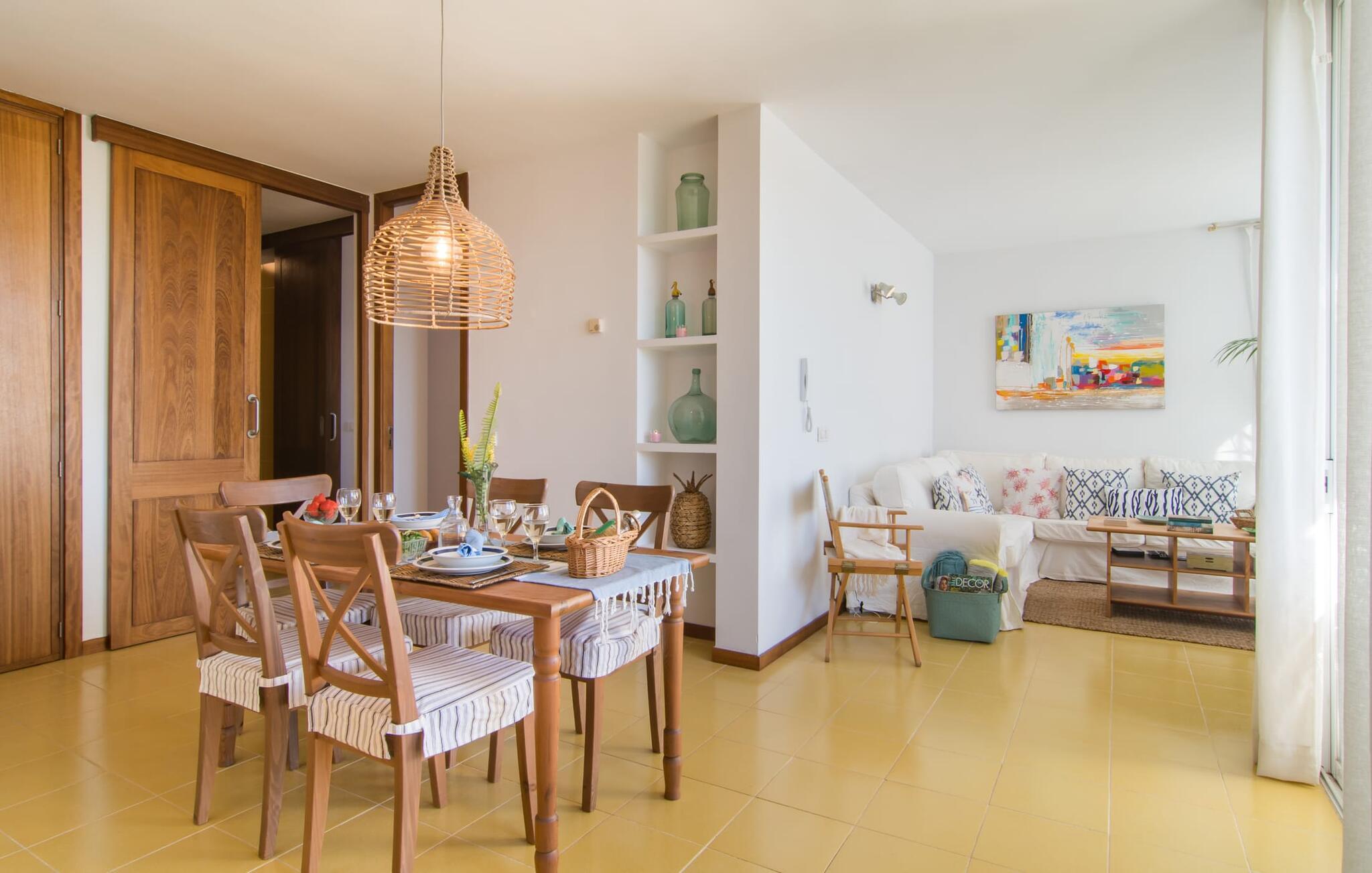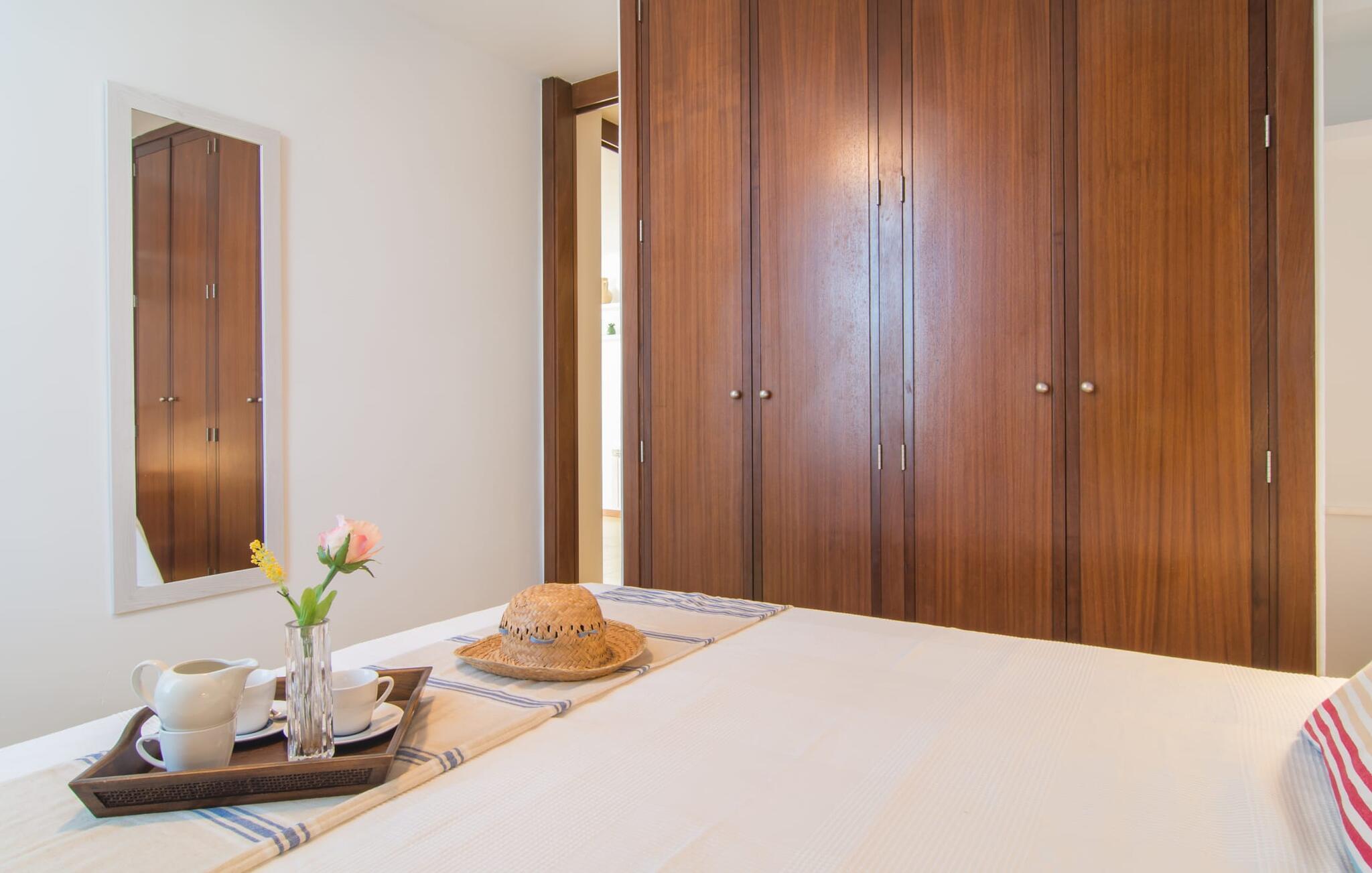 Enestående åben og venlig, denne bolig for op til fire voksne åbner sine døre, bag hvilken der er en masse hygge og munter gul. Altanen vender ud mod fronten, så I altid kan se travlheden bag cypreshækken, mens I spiser morgenmad, kaffe eller aftensmad, uden at skulle give afkald på jeres privatliv. Havet ligger vidunderligt tæt på, men foretrækker I ikke at hoppe i bølgerne og bare svømme et par rolige strækninger, kan I også benytte den 10 meter lange pool med solterrasse ved siden af – et ret sjældent indslag for ferielejligheder. Lejlighedens værelser er præget af en enkel æstetik. Med en L-formet stue og spisestue, et fuldt udstyret køkken, to soveværelser og et badeværelse, har den alt hvad I behøver til den perfekte strandferie. De gule fliser, der løber gennem rummene, understreger ikke kun boligens "sol"-motiv, men også den muntre lethed, som "Mirella" udstråler og vil vække en varig feriefølelse hos sine gæster. Gulv-til-loft vinduerne nær sofaen og spisebordet slipper masser af lys ind og giver udsigt til omgivelserne, møblerne emmer af komfort og gør også hjemmeaftenerne til en behagelig tid, det være sig med en lækker middag , en bog, jeres Yndlingsserie eller en lang samtale mellem de farverige sofapuder eller ved bordet. I det ene soveværelse er der en stor seng på 1,50 x 2 m, i det andet soveværelse er der to 0,90 m brede enkeltsenge. Badeværelset med dobbelt håndvask, bruser og separat toilet er ensuite til det ene soveværelse og er også tilgængeligt for de øvrige gæster fra stuen. Da lejligheden er udstyret med varm/kold aircondition, kan I bo her komfortabelt hele året rundt. "Mirella" er et ideelt udgangspunkt for en række forskellige udforskninger i det smukke nord og nordvestlige Mallorca. Port de Pollença med dens lystbådehavn, smukke promenade og strand kan udforskes dagligt til fods, den berømte Golgata, den gamle romerske bro, museer og gallerier samt kunsthåndværk og små butikker i Pollença. Der er ingen mangel på seværdige udflugtsmål i området. Takket være dens beliggenhed på den lille gade, er I perfekt forbundet til udflugter. Regionens gastronomiske tilbud er også imponerende, lige fra det traditionelle mallorcanske køkken til mere forskelligartede kulinariske oplevelser. For vandreentusiaster er vandrestien GR 221 en af mange muligheder på den nordlige del af øen for cyklister, og kurverne på Cap Formentor er fristende. Urbant med masser af flair: I den sydlige del af Port de Pollença finder I feriehuset "Mirella", som er indrettet med stor sans for detaljen. Forskellige indkøbsmuligheder er inden for gåafstand, og travlheden på det ugentlige marked i Pollença med dets brede udvalg af lækre regionale produkter er kun 8 km væk. Strandene i Badia de Pollença ligger cirka 1 km væk og kan nemt nås til fods. Can Cap de Bou ligger kun 4 km væk, og andre smukke kystbyer kan også nås hurtigt i bil.