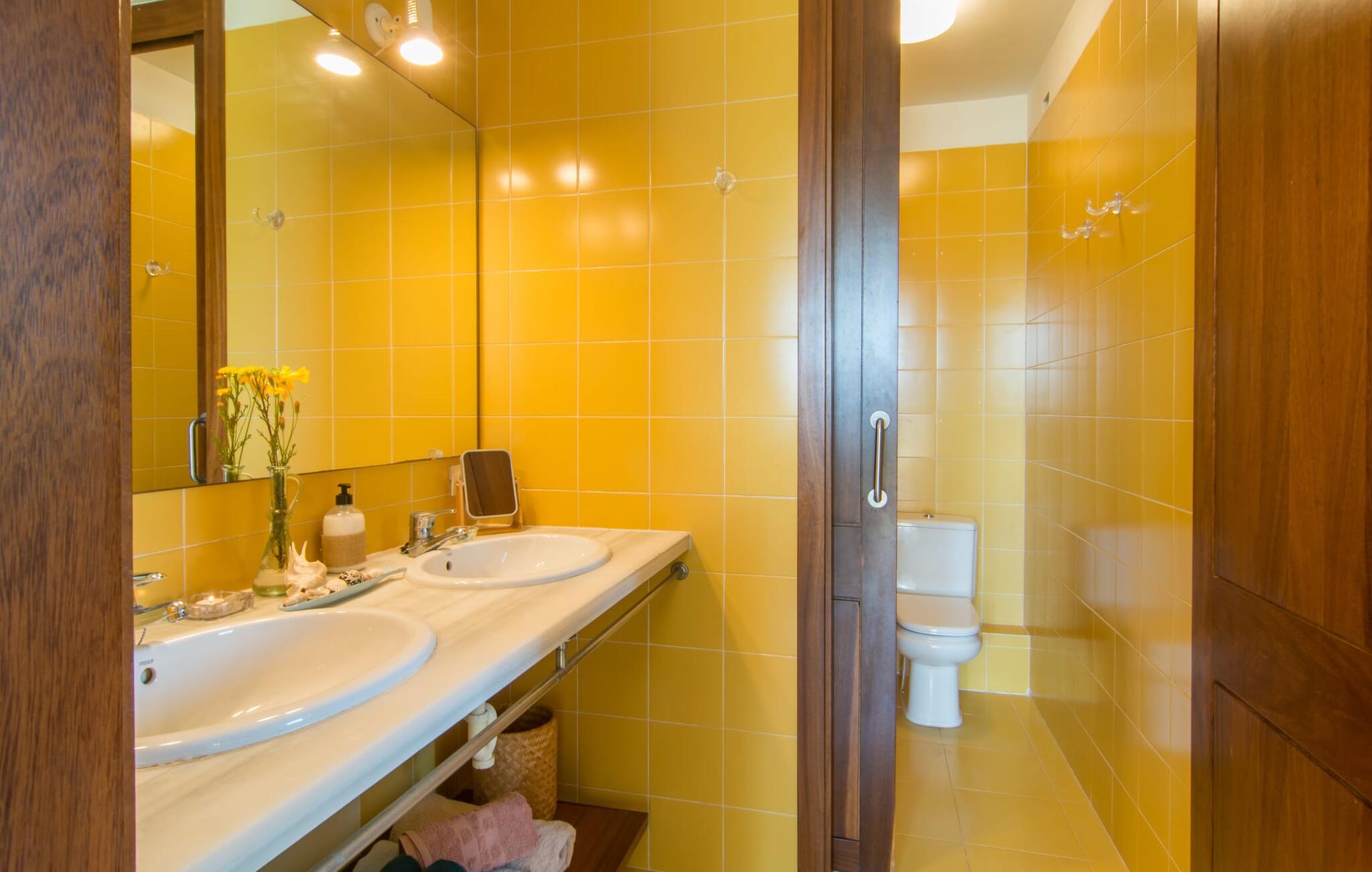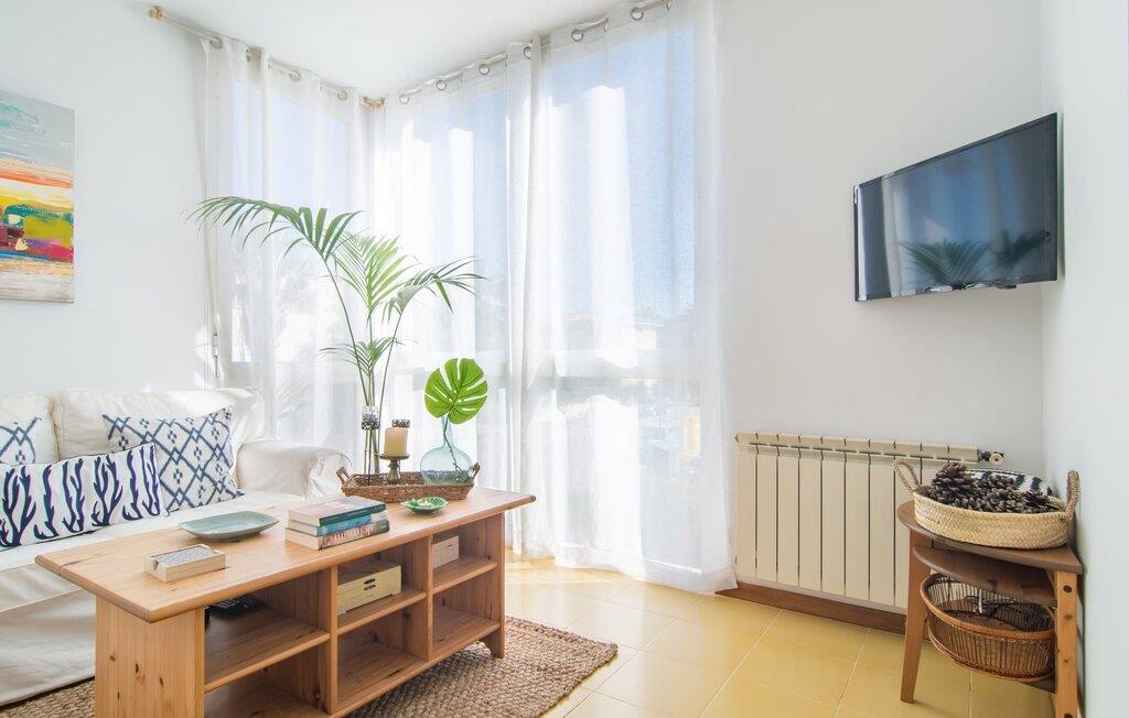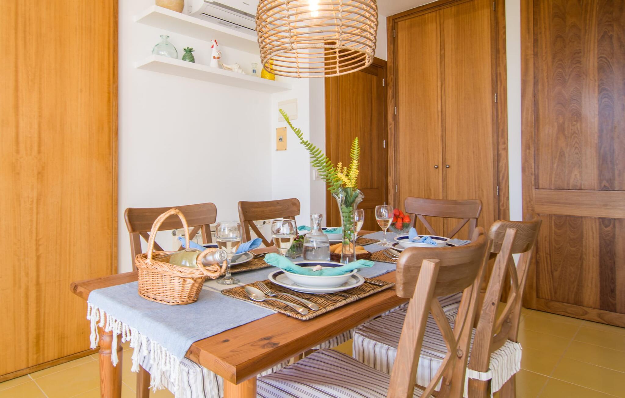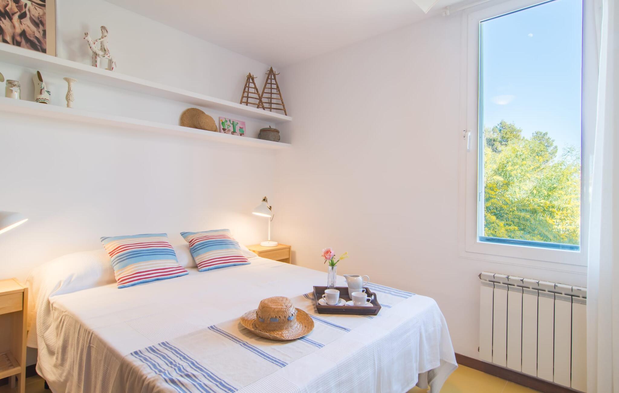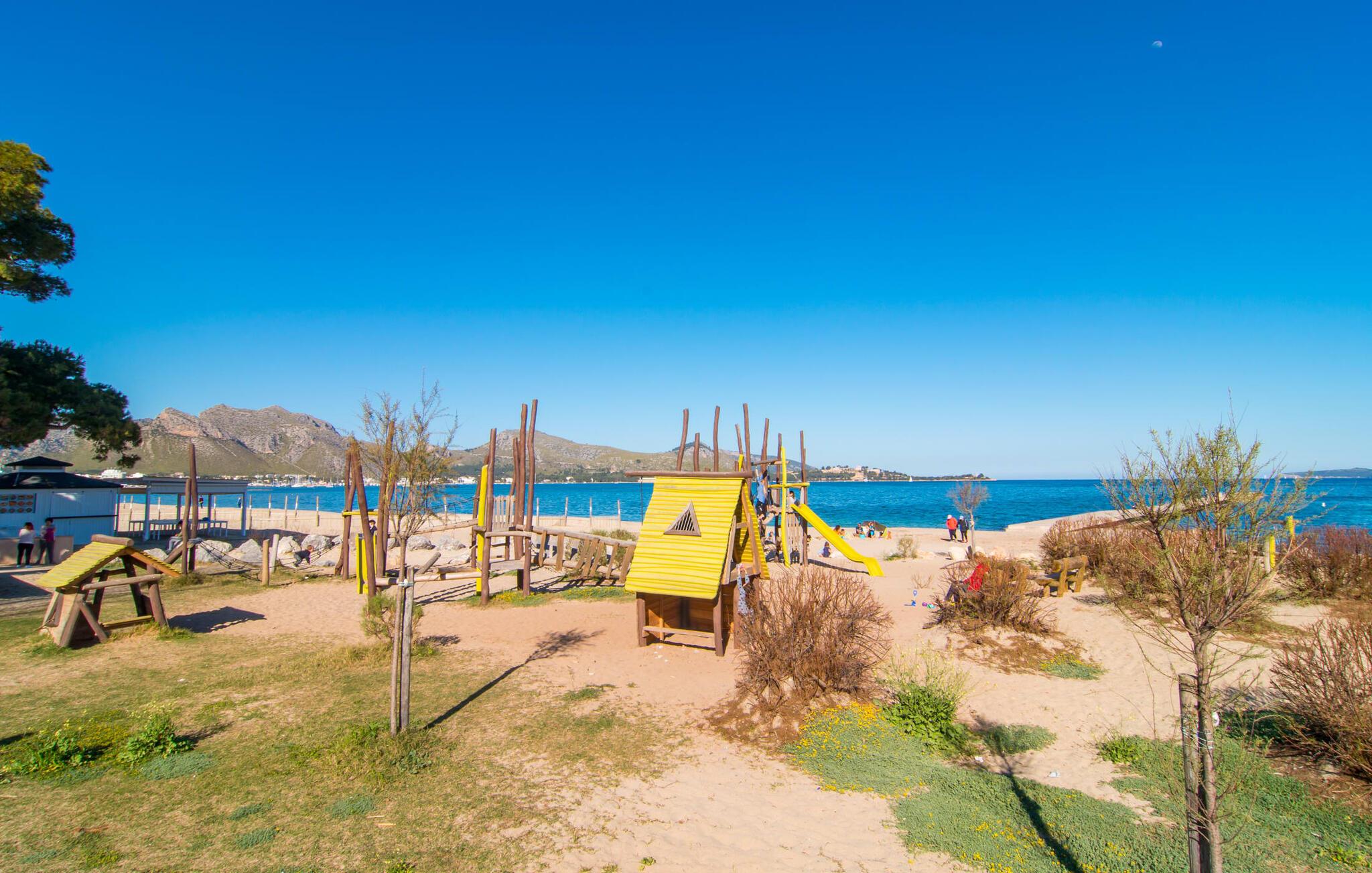 Enestående åben og venlig, denne bolig for op til fire voksne åbner sine døre, bag hvilken der er en masse hygge og munter gul. Altanen vender ud mod fronten, så I altid kan se travlheden bag cypreshækken, mens I spiser morgenmad, kaffe eller aftensmad, uden at skulle give afkald på jeres privatliv. Havet ligger vidunderligt tæt på, men foretrækker I ikke at hoppe i bølgerne og bare svømme et par rolige strækninger, kan I også benytte den 10 meter lange pool med solterrasse ved siden af – et ret sjældent indslag for ferielejligheder. Lejlighedens værelser er præget af en enkel æstetik. Med en L-formet stue og spisestue, et fuldt udstyret køkken, to soveværelser og et badeværelse, har den alt hvad I behøver til den perfekte strandferie. De gule fliser, der løber gennem rummene, understreger ikke kun boligens "sol"-motiv, men også den muntre lethed, som "Mirella" udstråler og vil vække en varig feriefølelse hos sine gæster. Gulv-til-loft vinduerne nær sofaen og spisebordet slipper masser af lys ind og giver udsigt til omgivelserne, møblerne emmer af komfort og gør også hjemmeaftenerne til en behagelig tid, det være sig med en lækker middag , en bog, jeres Yndlingsserie eller en lang samtale mellem de farverige sofapuder eller ved bordet. I det ene soveværelse er der en stor seng på 1,50 x 2 m, i det andet soveværelse er der to 0,90 m brede enkeltsenge. Badeværelset med dobbelt håndvask, bruser og separat toilet er ensuite til det ene soveværelse og er også tilgængeligt for de øvrige gæster fra stuen. Da lejligheden er udstyret med varm/kold aircondition, kan I bo her komfortabelt hele året rundt. "Mirella" er et ideelt udgangspunkt for en række forskellige udforskninger i det smukke nord og nordvestlige Mallorca. Port de Pollença med dens lystbådehavn, smukke promenade og strand kan udforskes dagligt til fods, den berømte Golgata, den gamle romerske bro, museer og gallerier samt kunsthåndværk og små butikker i Pollença. Der er ingen mangel på seværdige udflugtsmål i området. Takket være dens beliggenhed på den lille gade, er I perfekt forbundet til udflugter. Regionens gastronomiske tilbud er også imponerende, lige fra det traditionelle mallorcanske køkken til mere forskelligartede kulinariske oplevelser. For vandreentusiaster er vandrestien GR 221 en af mange muligheder på den nordlige del af øen for cyklister, og kurverne på Cap Formentor er fristende. Urbant med masser af flair: I den sydlige del af Port de Pollença finder I feriehuset "Mirella", som er indrettet med stor sans for detaljen. Forskellige indkøbsmuligheder er inden for gåafstand, og travlheden på det ugentlige marked i Pollença med dets brede udvalg af lækre regionale produkter er kun 8 km væk. Strandene i Badia de Pollença ligger cirka 1 km væk og kan nemt nås til fods. Can Cap de Bou ligger kun 4 km væk, og andre smukke kystbyer kan også nås hurtigt i bil.