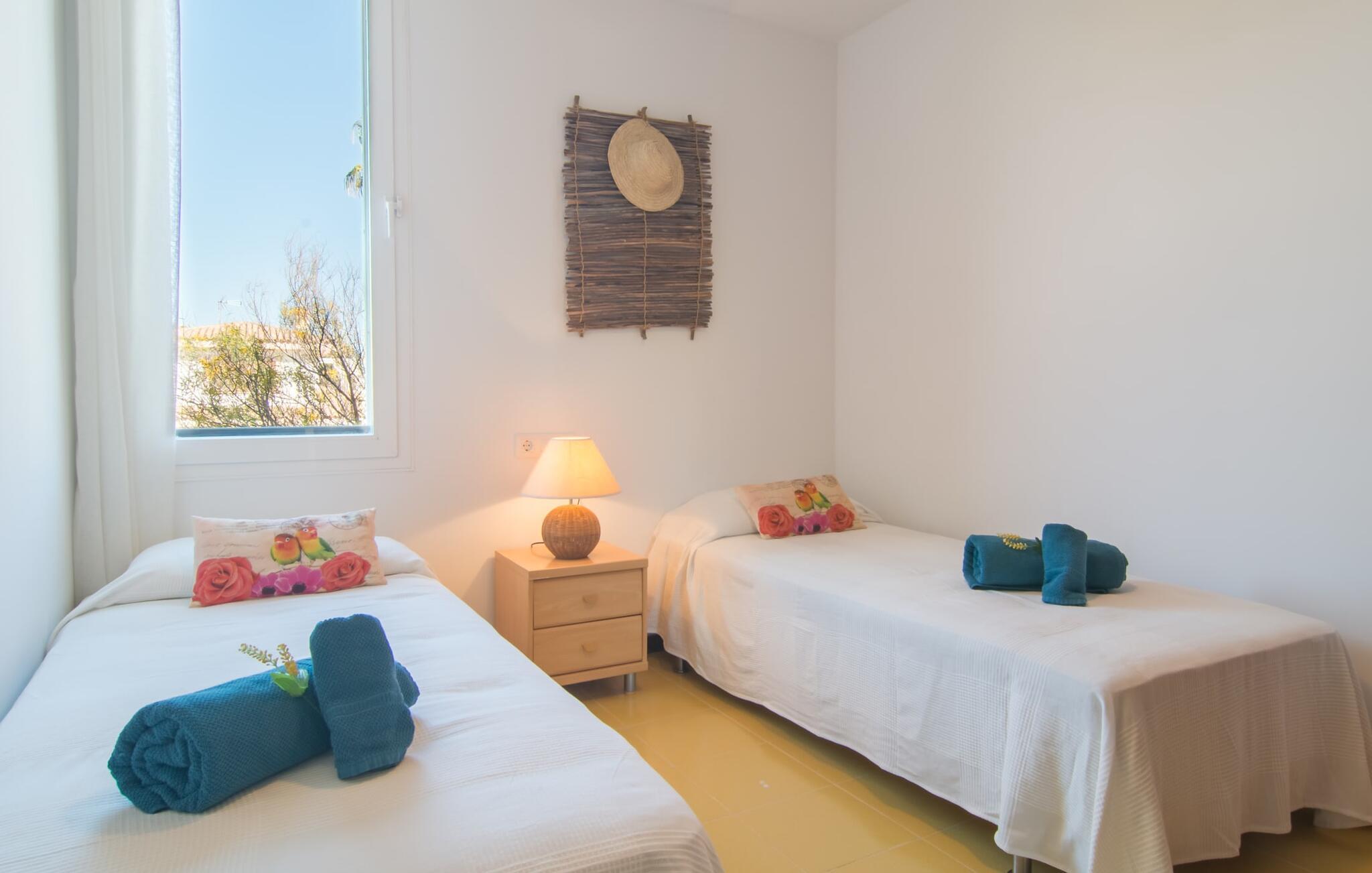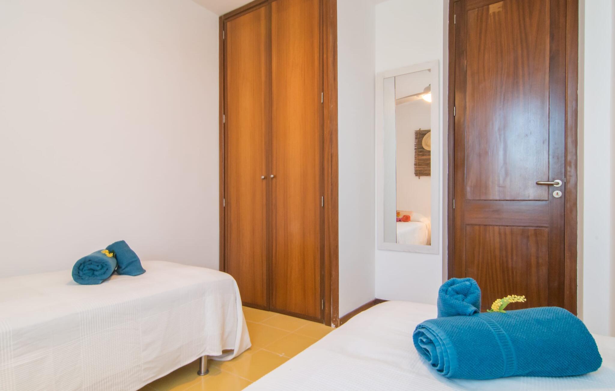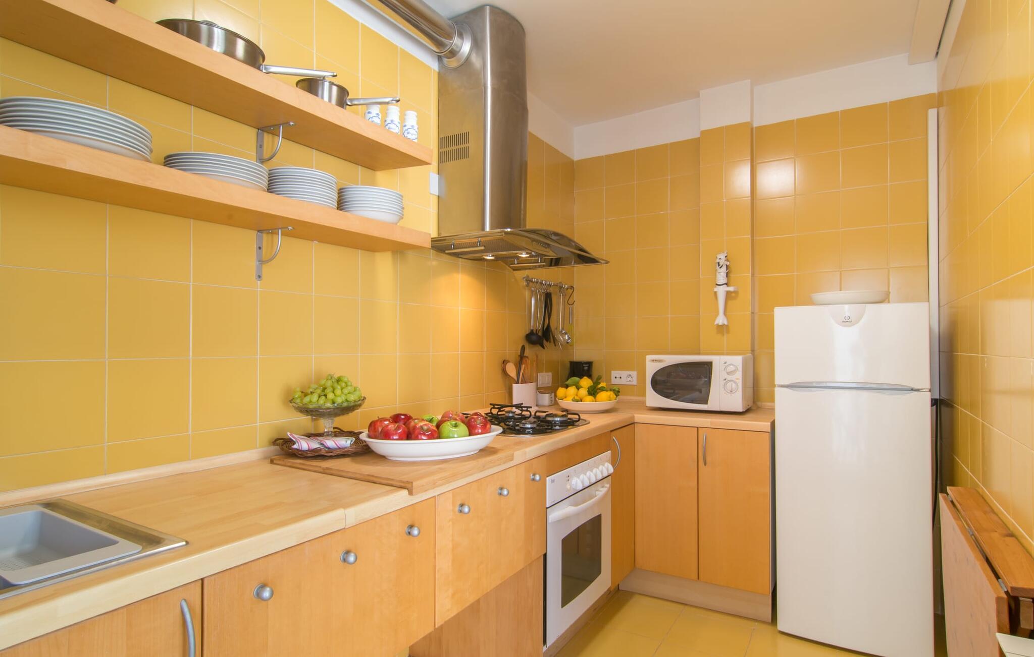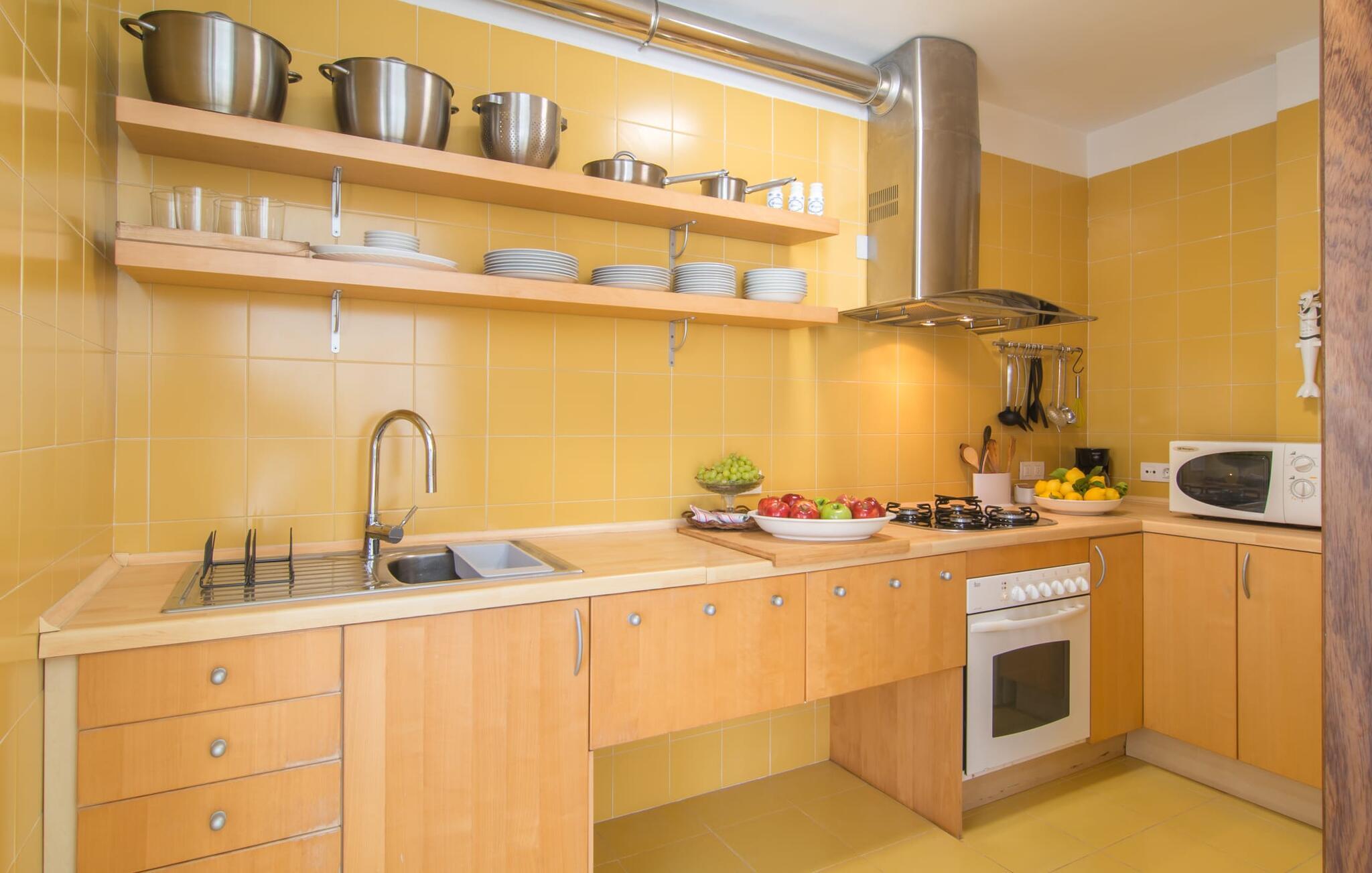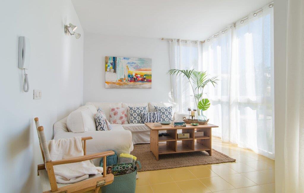 Enestående åben og venlig, denne bolig for op til fire voksne åbner sine døre, bag hvilken der er en masse hygge og munter gul. Altanen vender ud mod fronten, så I altid kan se travlheden bag cypreshækken, mens I spiser morgenmad, kaffe eller aftensmad, uden at skulle give afkald på jeres privatliv. Havet ligger vidunderligt tæt på, men foretrækker I ikke at hoppe i bølgerne og bare svømme et par rolige strækninger, kan I også benytte den 10 meter lange pool med solterrasse ved siden af – et ret sjældent indslag for ferielejligheder. Lejlighedens værelser er præget af en enkel æstetik. Med en L-formet stue og spisestue, et fuldt udstyret køkken, to soveværelser og et badeværelse, har den alt hvad I behøver til den perfekte strandferie. De gule fliser, der løber gennem rummene, understreger ikke kun boligens "sol"-motiv, men også den muntre lethed, som "Mirella" udstråler og vil vække en varig feriefølelse hos sine gæster. Gulv-til-loft vinduerne nær sofaen og spisebordet slipper masser af lys ind og giver udsigt til omgivelserne, møblerne emmer af komfort og gør også hjemmeaftenerne til en behagelig tid, det være sig med en lækker middag , en bog, jeres Yndlingsserie eller en lang samtale mellem de farverige sofapuder eller ved bordet. I det ene soveværelse er der en stor seng på 1,50 x 2 m, i det andet soveværelse er der to 0,90 m brede enkeltsenge. Badeværelset med dobbelt håndvask, bruser og separat toilet er ensuite til det ene soveværelse og er også tilgængeligt for de øvrige gæster fra stuen. Da lejligheden er udstyret med varm/kold aircondition, kan I bo her komfortabelt hele året rundt. "Mirella" er et ideelt udgangspunkt for en række forskellige udforskninger i det smukke nord og nordvestlige Mallorca. Port de Pollença med dens lystbådehavn, smukke promenade og strand kan udforskes dagligt til fods, den berømte Golgata, den gamle romerske bro, museer og gallerier samt kunsthåndværk og små butikker i Pollença. Der er ingen mangel på seværdige udflugtsmål i området. Takket være dens beliggenhed på den lille gade, er I perfekt forbundet til udflugter. Regionens gastronomiske tilbud er også imponerende, lige fra det traditionelle mallorcanske køkken til mere forskelligartede kulinariske oplevelser. For vandreentusiaster er vandrestien GR 221 en af mange muligheder på den nordlige del af øen for cyklister, og kurverne på Cap Formentor er fristende. Urbant med masser af flair: I den sydlige del af Port de Pollença finder I feriehuset "Mirella", som er indrettet med stor sans for detaljen. Forskellige indkøbsmuligheder er inden for gåafstand, og travlheden på det ugentlige marked i Pollença med dets brede udvalg af lækre regionale produkter er kun 8 km væk. Strandene i Badia de Pollença ligger cirka 1 km væk og kan nemt nås til fods. Can Cap de Bou ligger kun 4 km væk, og andre smukke kystbyer kan også nås hurtigt i bil.