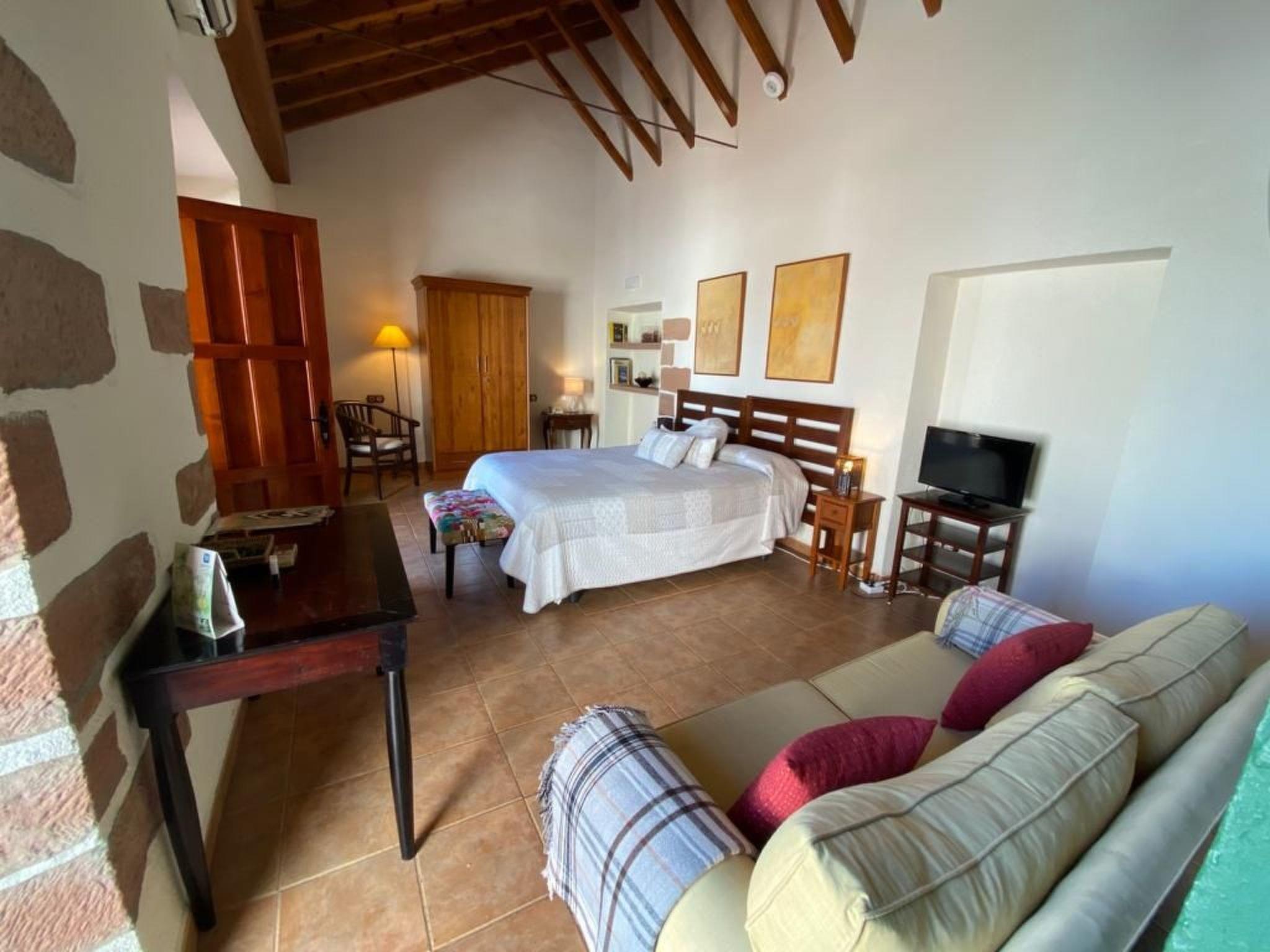This cottage has a spacious living area with a fireplace. There is also an outdoor terrace with views of the sunset and the surrounding olive groves, a reading room, a games room, a TV room and our beautiful restaurant a la carte or tasting menu. On the first floor you will find eight bedrooms, each different and individually decorated in a classic and elegant style. All rooms have heating, air conditioning, bathroom with shower, television, telephone, WIFI, safe, bathrobe and toiletries. We have a room for people with reduced mobility.
