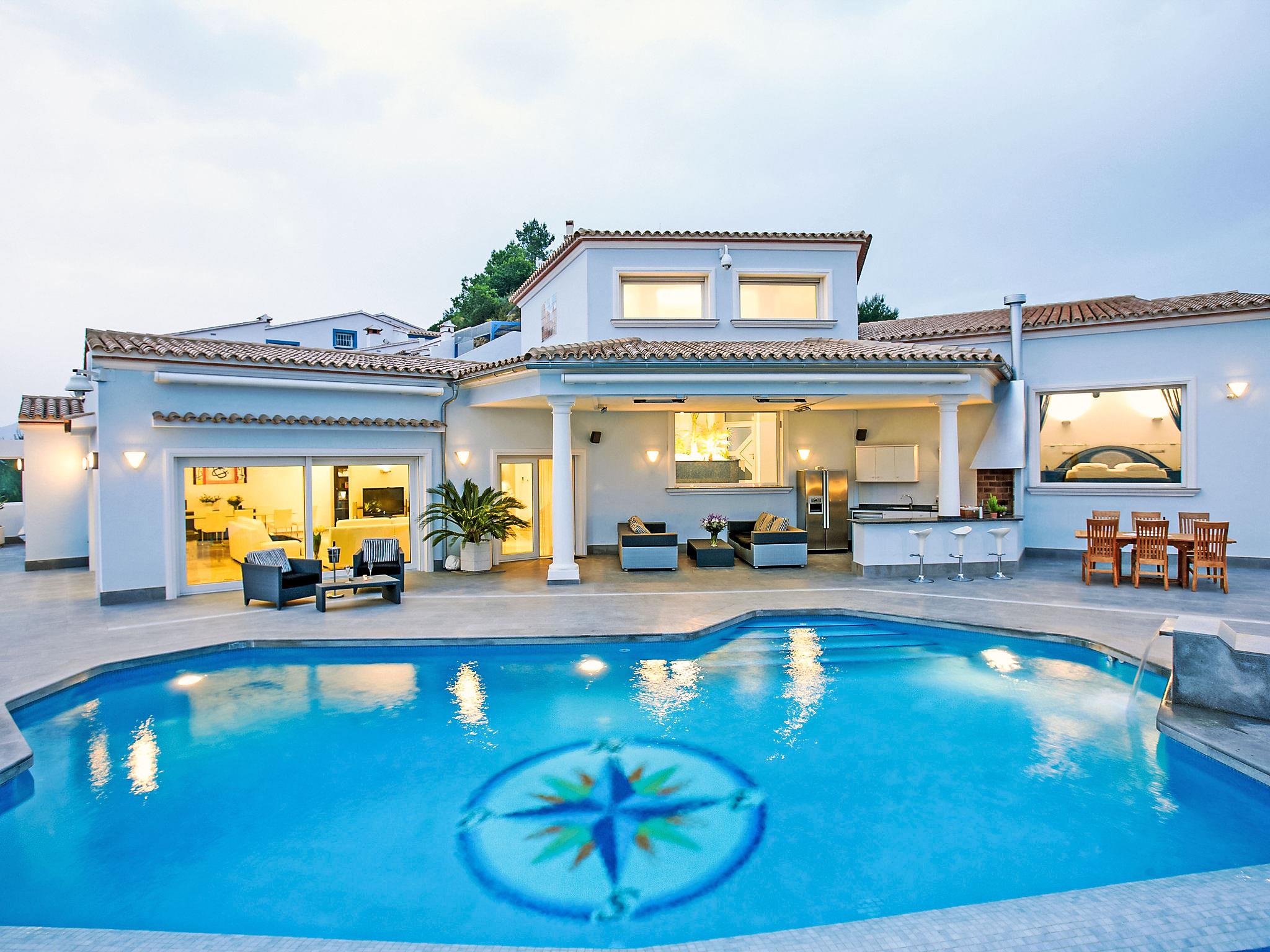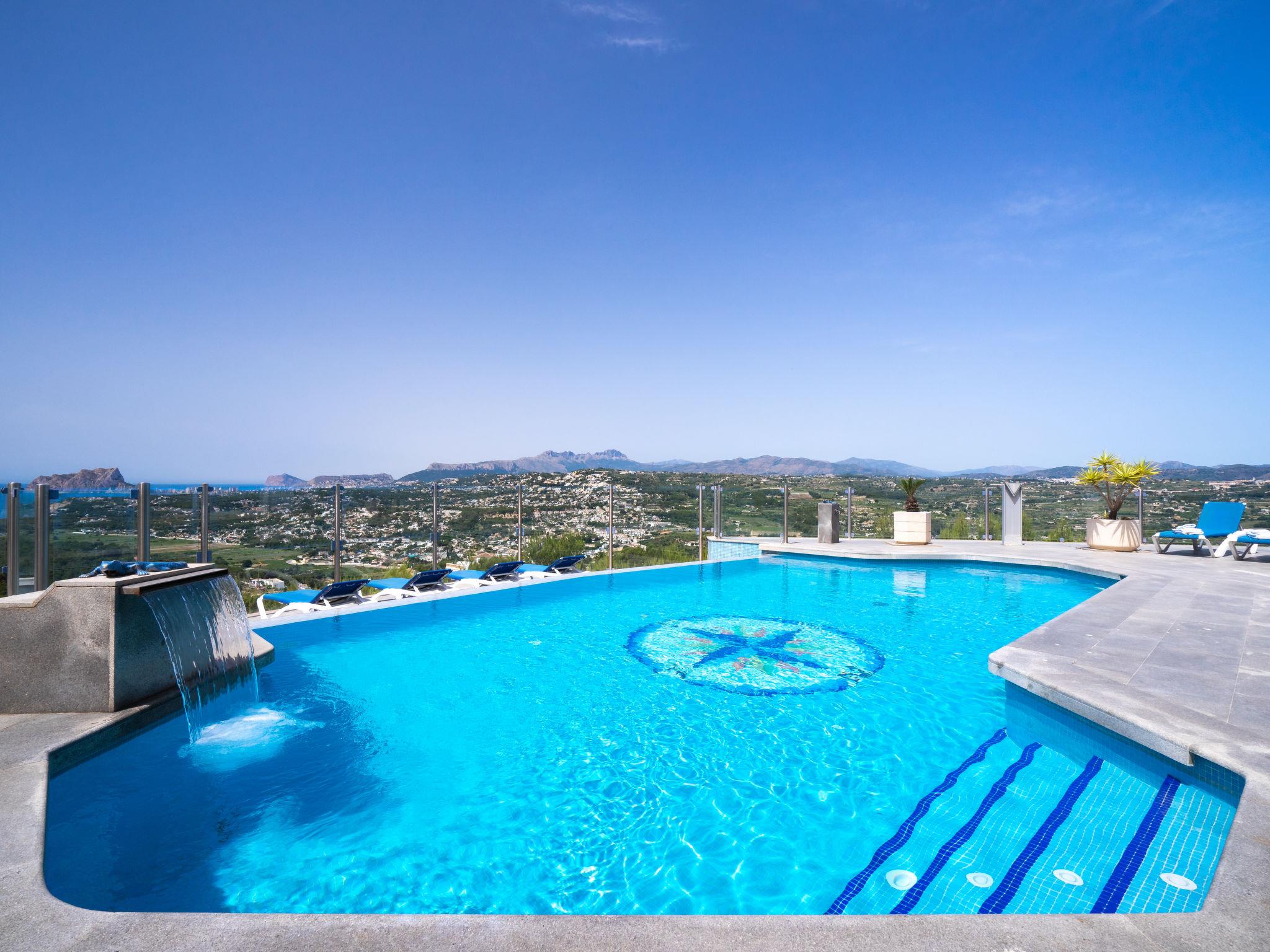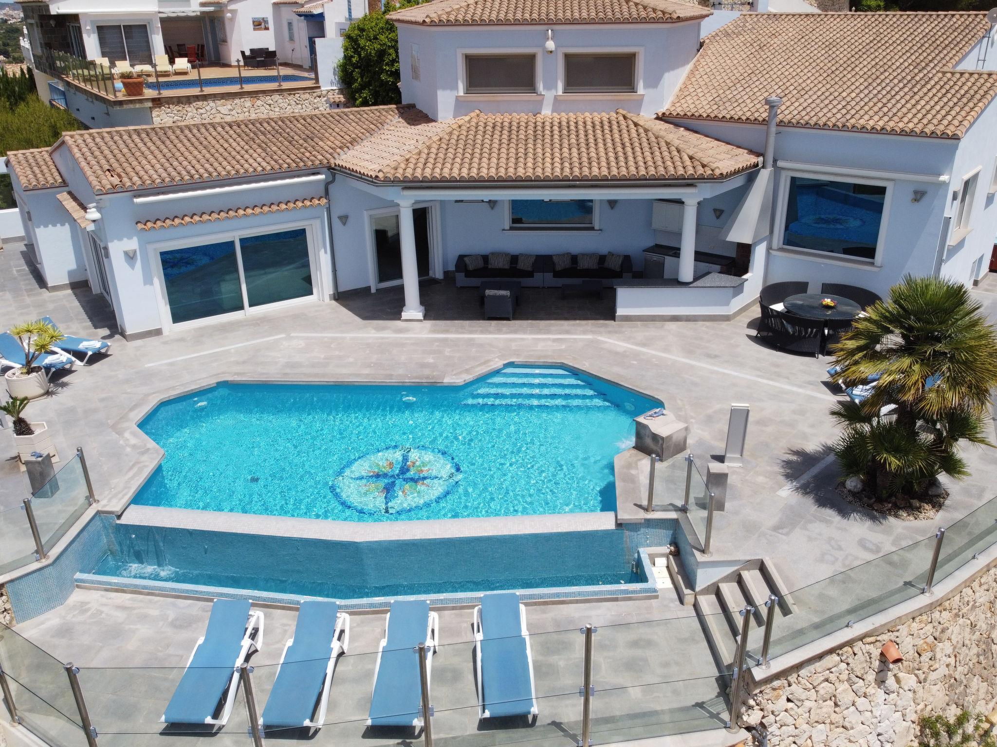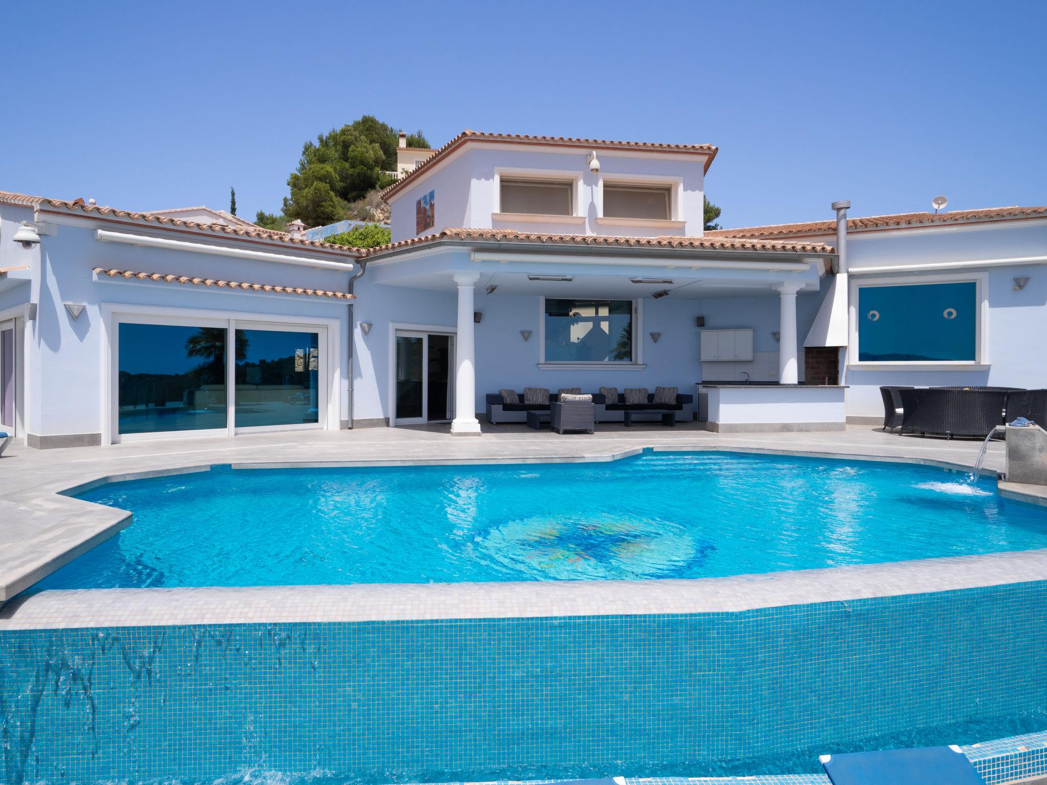Golden Valley: Very modern, luxurious farm estate "Finca Edel", 2 storeys. 4.5 km from the centre of Moraira, in a quiet, sunny, elevated position, 4.5 km from the sea, in a cul-de-sac. Private: property 1'200 m2 (fenced), swimming pool with privacy (50 m2, seasonal availability: 01.Jan. - 31.Dec.) with internal staircase. Terrace, garden furniture, barbecue house. In the house: sauna, hot tub (all included), central heating system, air conditioning, washing machine, tumble dryer. Supermarket 1.3 km, restaurant 1.3 km, bar 1.3 km, bus stop "Moraira" 4.9 km, railway station "Teulada" 7.1 km, ferry "Denia" 22.7 km, sandy beach "Playa L'Ampolla" 5.4 km. Golf course (18 hole) 9 km. The owner does not accept any youth groups.