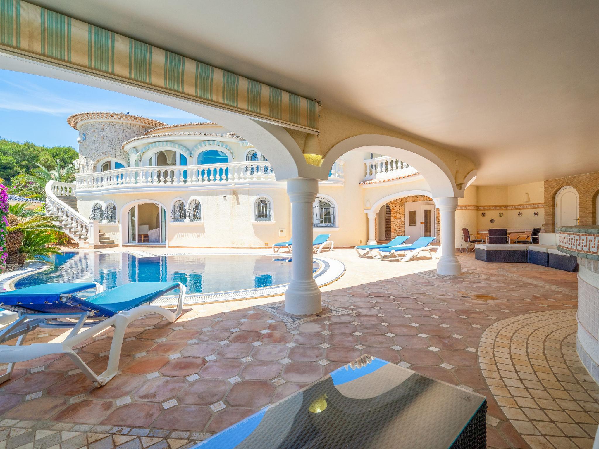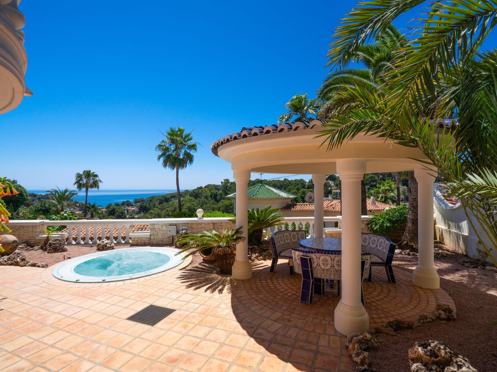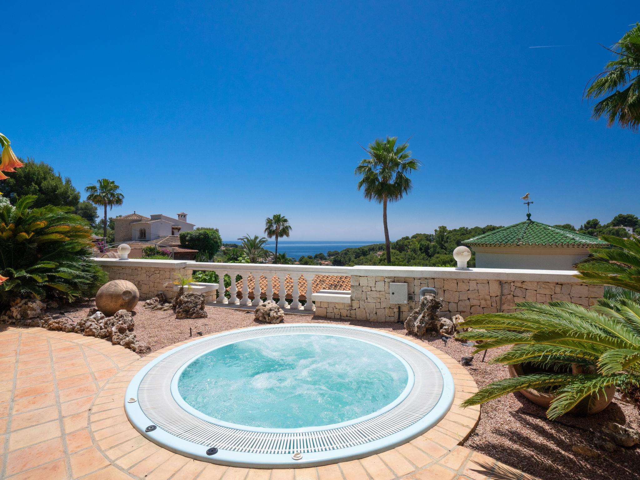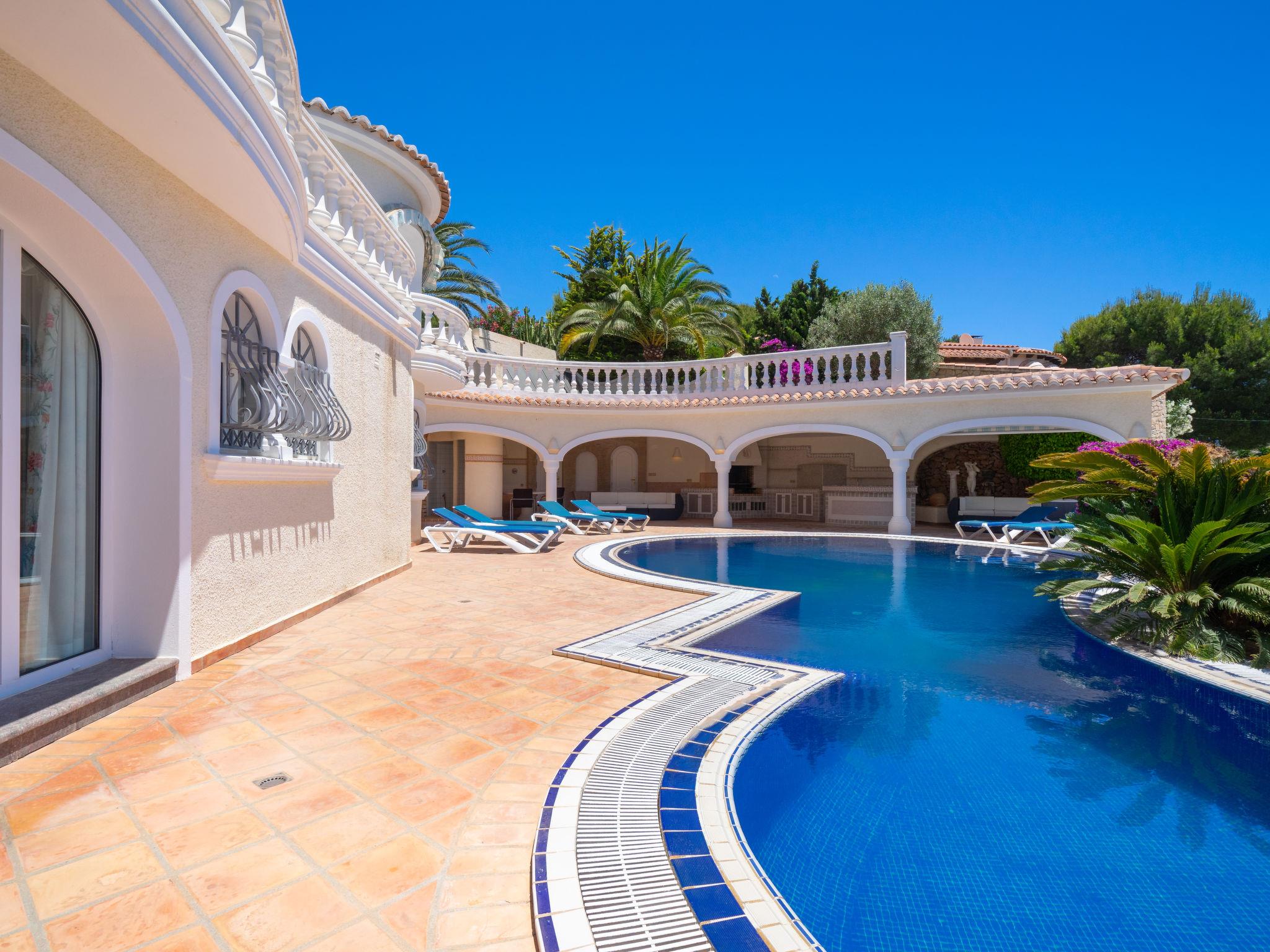 Large, luxurious villa "Luxemburg", 2 storeys. In the district of Montemar 4 km from the centre of Moraira, in a quiet, sunny position, in a cul-de-sac. Private: beautiful, well-kept garden 1'100 m2 (fenced), swimming pool (8 x 4 m, seasonal availability: 01.Jan. - 31.Dec.) with internal staircase. Shower/WC in the pool area, pool house, barbecue house. In the house: internet access, WiFi, sauna, hot tub (all included), central heating system, air conditioning. Bus stop "Benissa" 900 m, railway station "Teulada" 8.5 km, ferry "Denia" 34.6 km, sandy beach "Playa L'Ampolla" 5.1 km pebble beach "Cala Baladra" 1.7 km. Please note: baby equipment on request (included). The owner does not accept any youth groups.