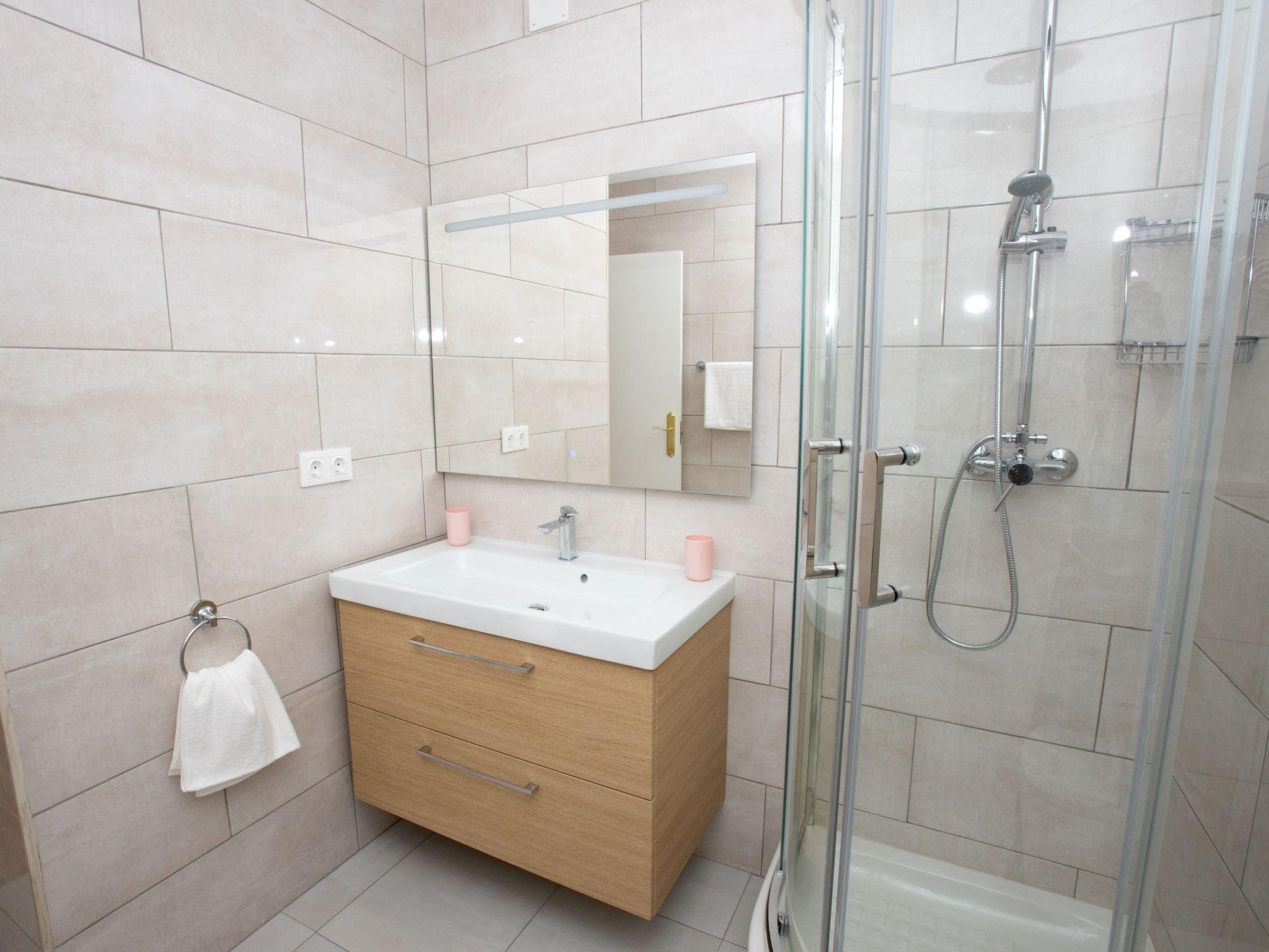 Inside the holiday flat you will find everything you need for a pleasant stay. The technical equipment includes a Smart TV, which guarantees cosy film evenings, as well as a washing machine for communal use in the building, which is particularly practical for longer stays. The kitchen is equipped with a ceramic hob, a filter coffee machine, a kettle and a dishwasher, making it easy to prepare meals. A pleasant climate, supported by a ceiling fan, ensures restful nights.