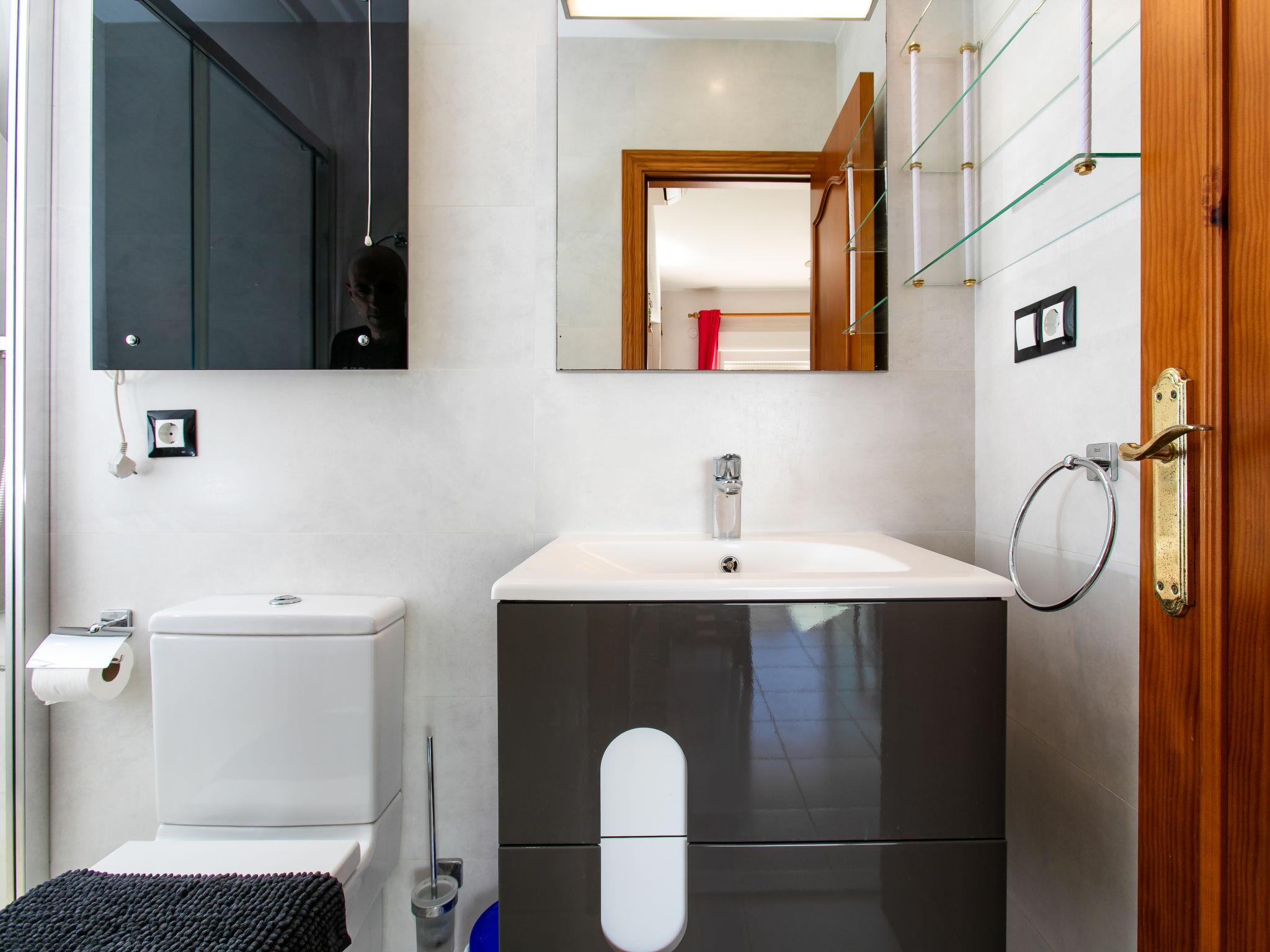 "San Luis Playa", 3-room apartment 60 m2, on the top floor, south facing position. Practical furnishings: living room 16 m2 with bar, digital TV and air conditioning. Exit to the terrace, south facing position. 1 room with 1 french bed (135 cm). Exit to the terrace, north facing position. 1 room with sloping ceilings with 2 beds (90 cm). Open kitchen (4 hot plates, oven, X ceramic glass hob hotplates, freezer). Shower/WC, sep. WC. Terrace 12 m2, south facing position terrace 6 m2, north facing position. Terrace furniture. Very beautiful view of the sea. Facilities: washing machine. Internet (WiFi, free). Please note: suitable for families. No parking. TV only ES. The bathroom is composed of Wc and sink. VFT/MA/10237 // Reg. Nr.: ESFCTU0000290250003784110000000000000000VFT/MA/102375